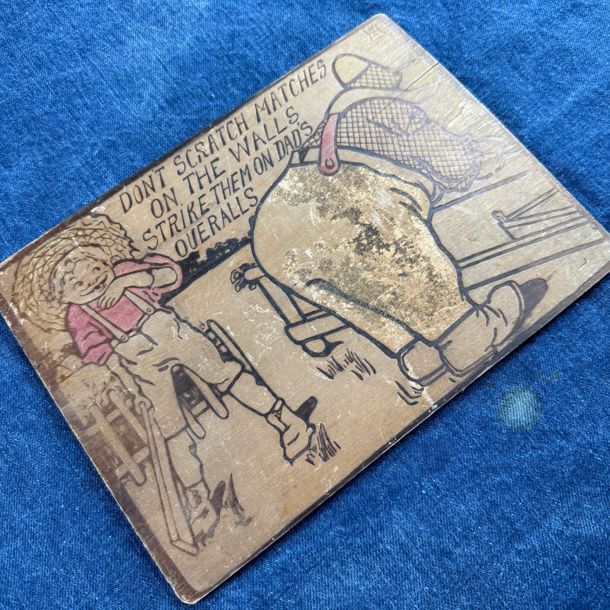 A super super cool wooden match strike panel that's been embossed with a couple of great characters. The overalls of the character on the right were originally coated in an abrasive to allow you to strike matches. Hard to date exactly, but I would think 1920s - 1930s.