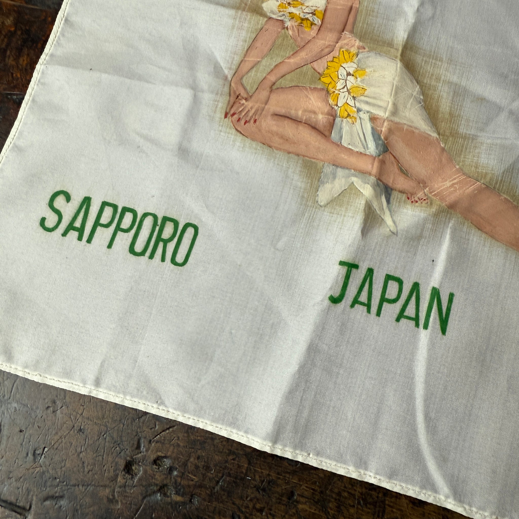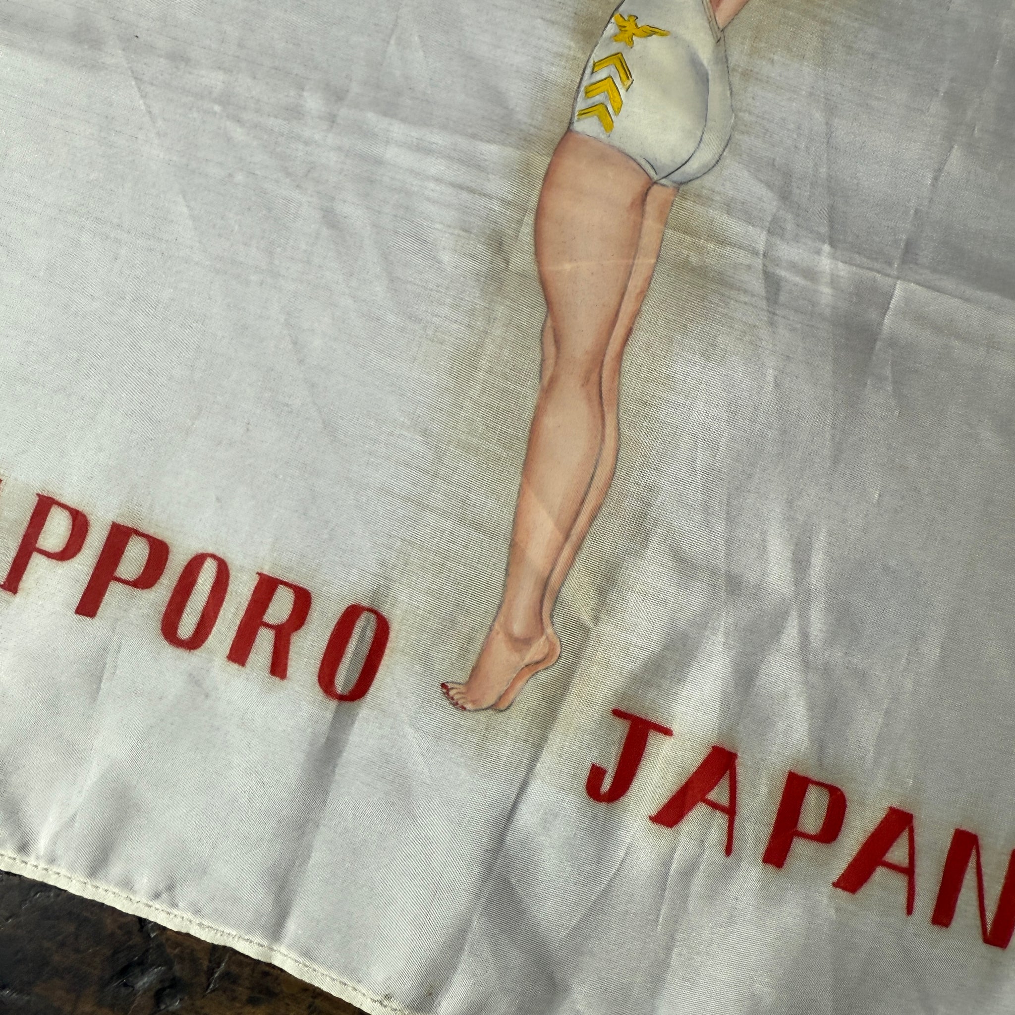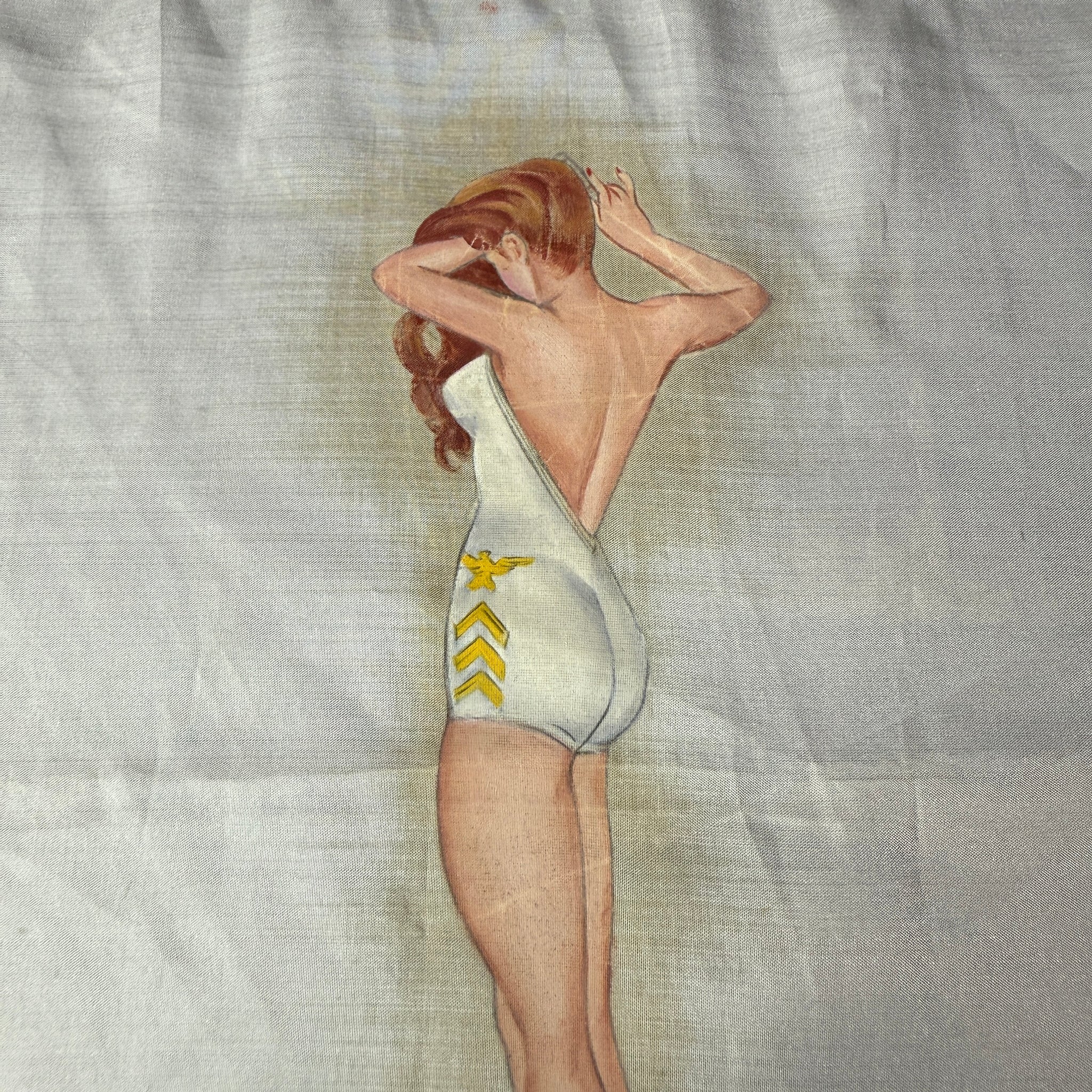 A really super cool pair of painted handkerchiefs likely painted in Japan in the late 1940s to early 1950s. A beauitful pair of pin-up with Navy iconography, particularly the rating on one lady's hip. These would be great for framing and display.