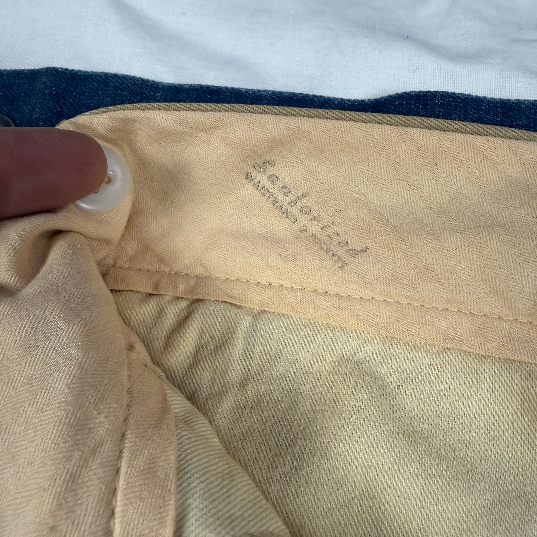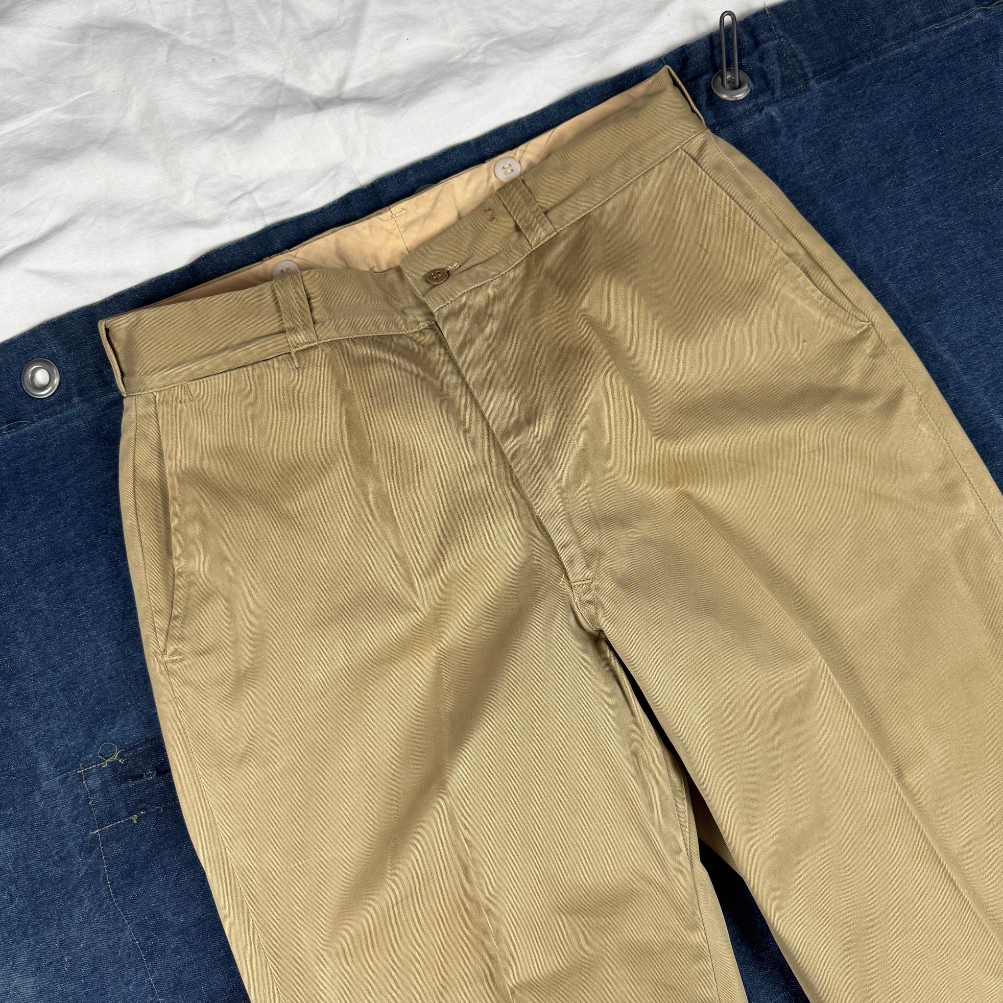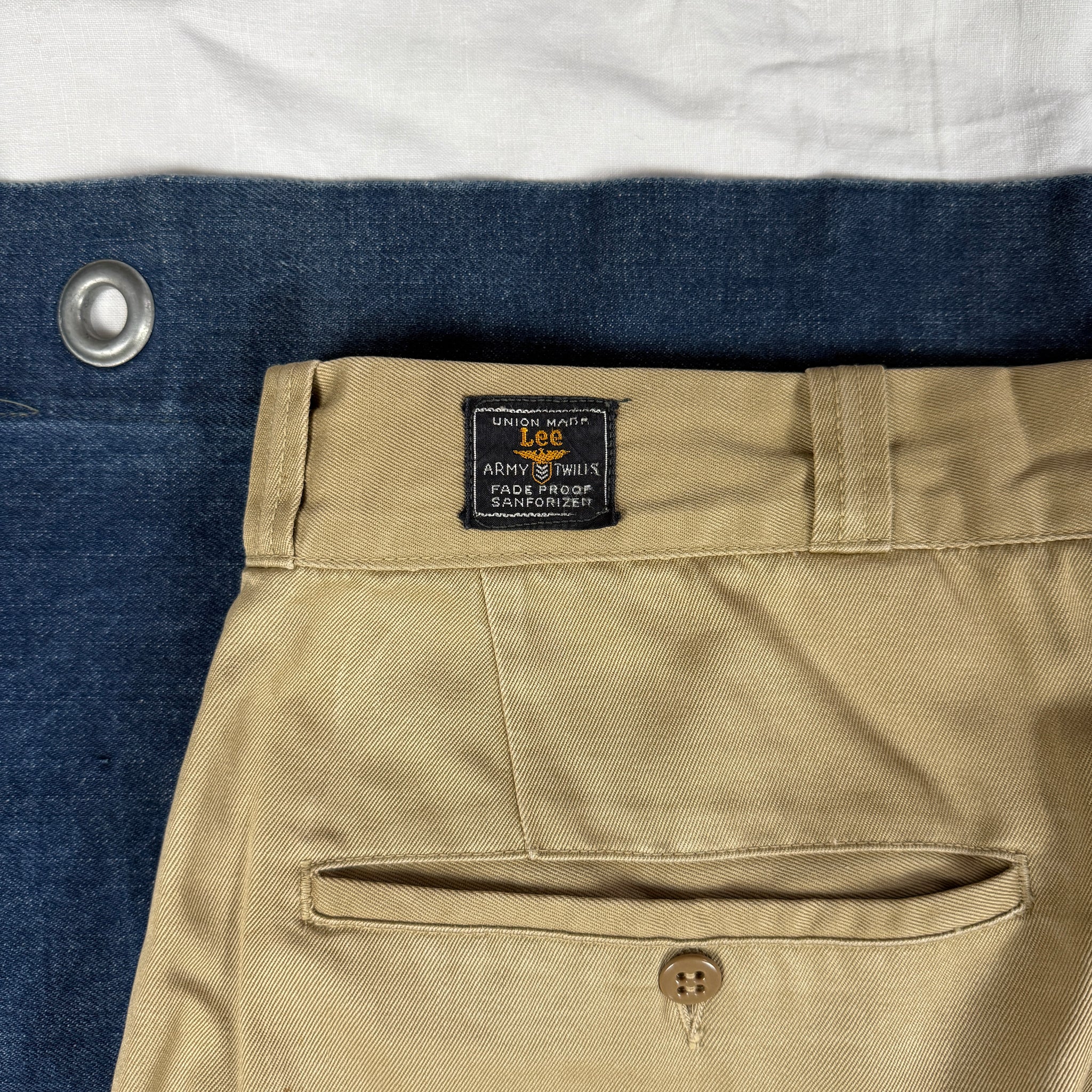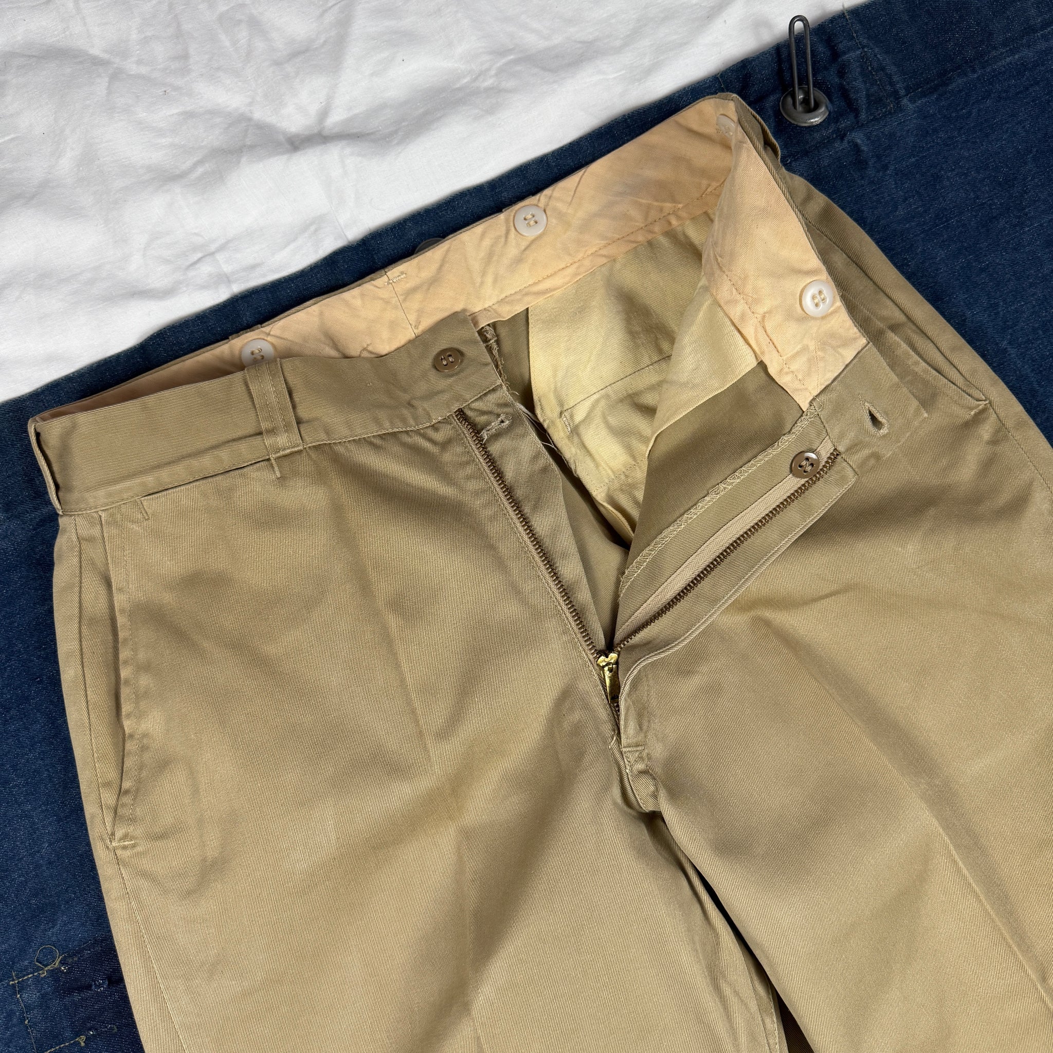 A beautiful pair of 1950s Lee Chinos in excellent condition. A ton of great details including a pre-R/MR embroidered tag to the reverse turn-ups, Gripper zip fly, a bunch of stencils on the inside. A great pair of vintage pants in a very good size.