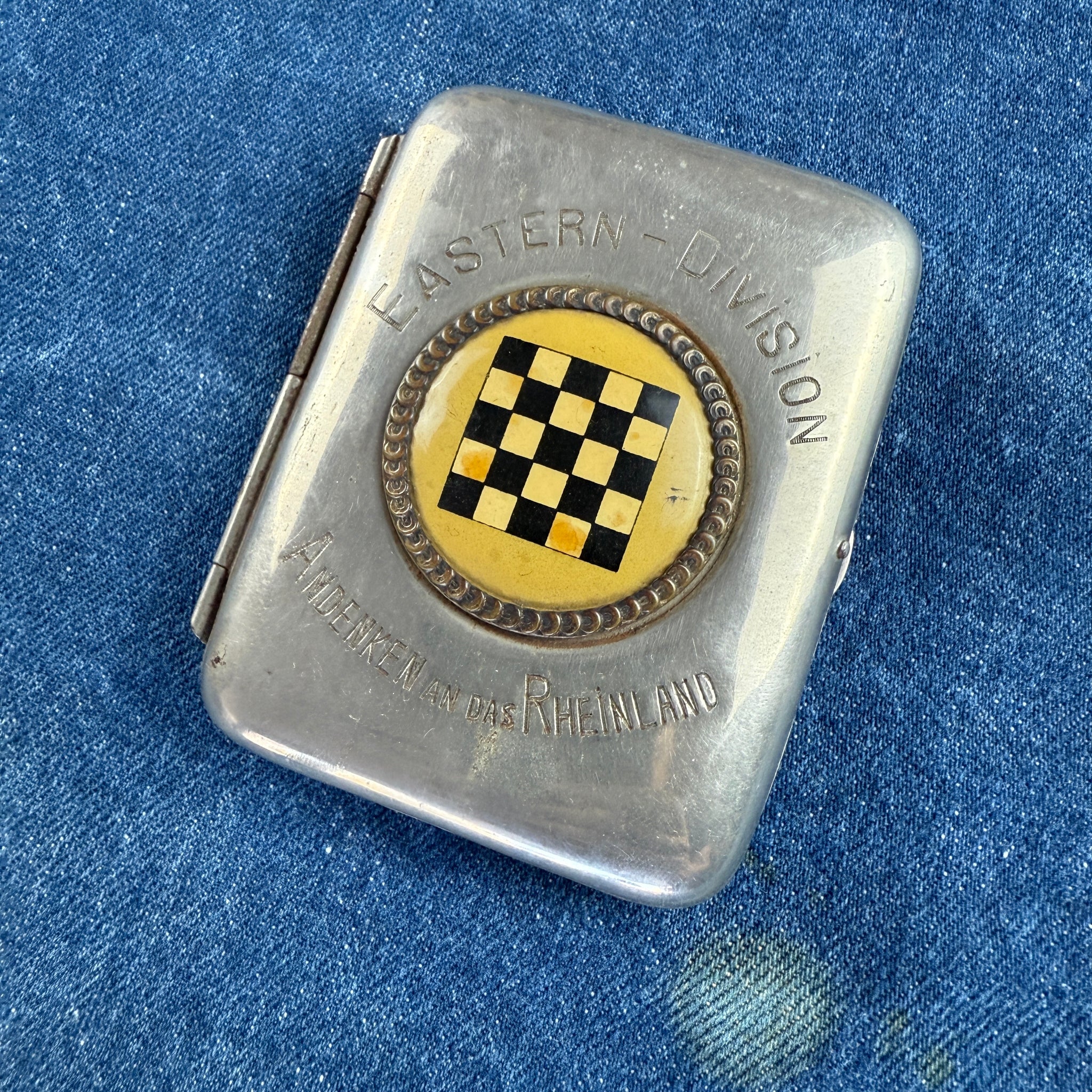 A lovely 1919 cigarette case made for a member of the British 34th Infantry division who were part of the occupation force stationed in Germany in 1919 post WW1. It's signed by Schlegel GMBH, Coln - Nippes, and the phrase on the front reads "Memories of the Rhine".