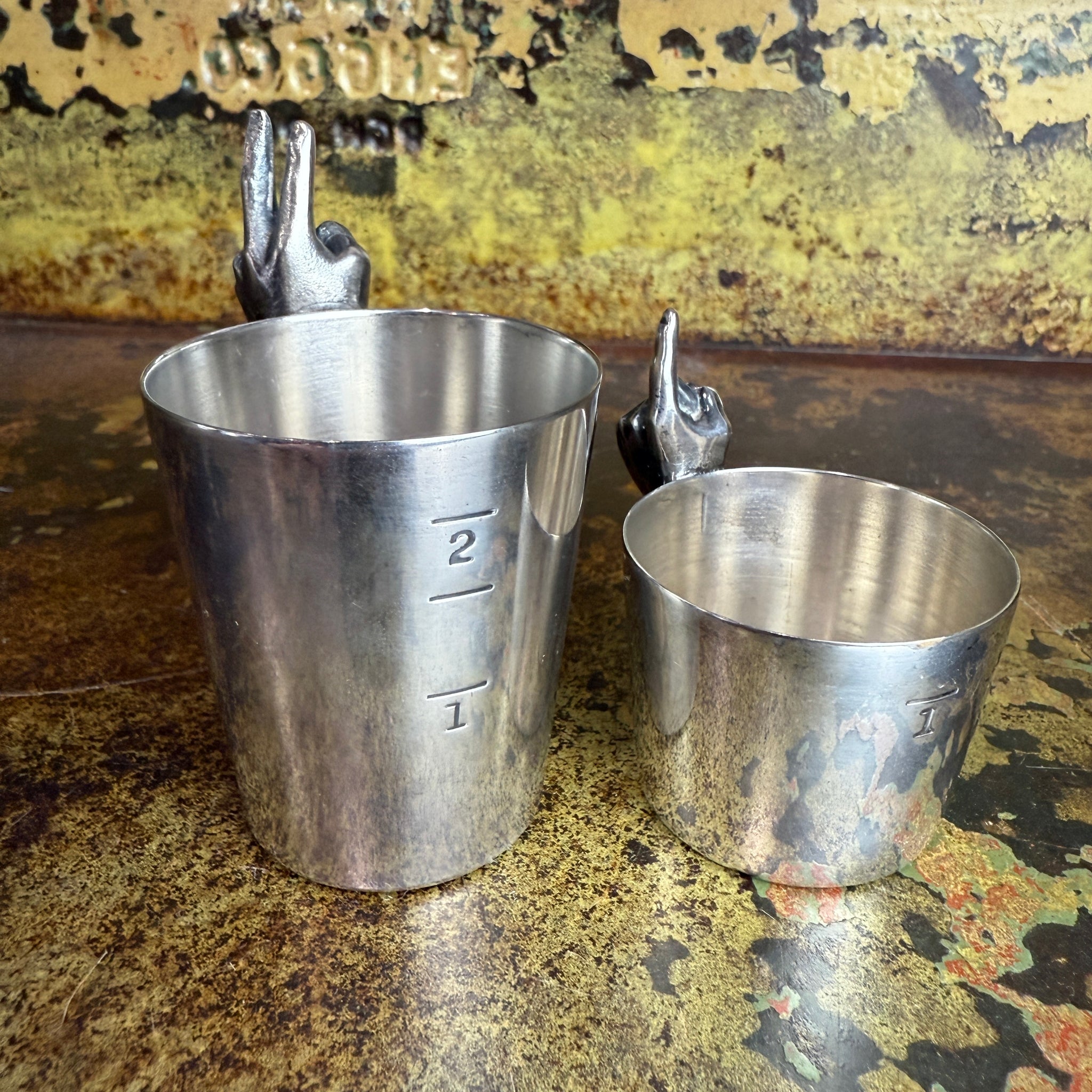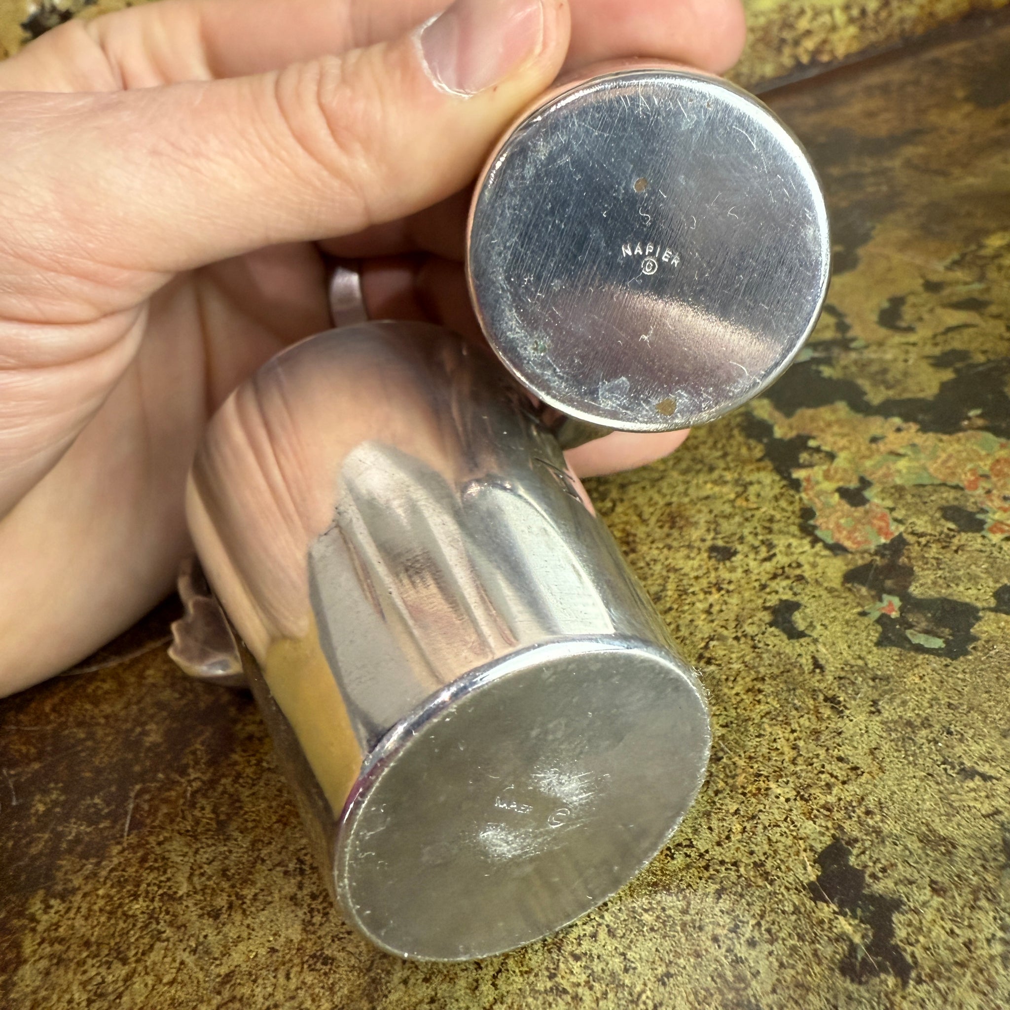 Whilst most well know as a costume jewellery manufacturer, in the post-prohibition era, Napier would turn it's skilled hand to kitchen and barware. This would only last throughout the 30s, and post ww2 they would switch back to just jewellery. This is one of their more iconic and collectible pieces of barware - the finger jigger. Two fingers for me please.