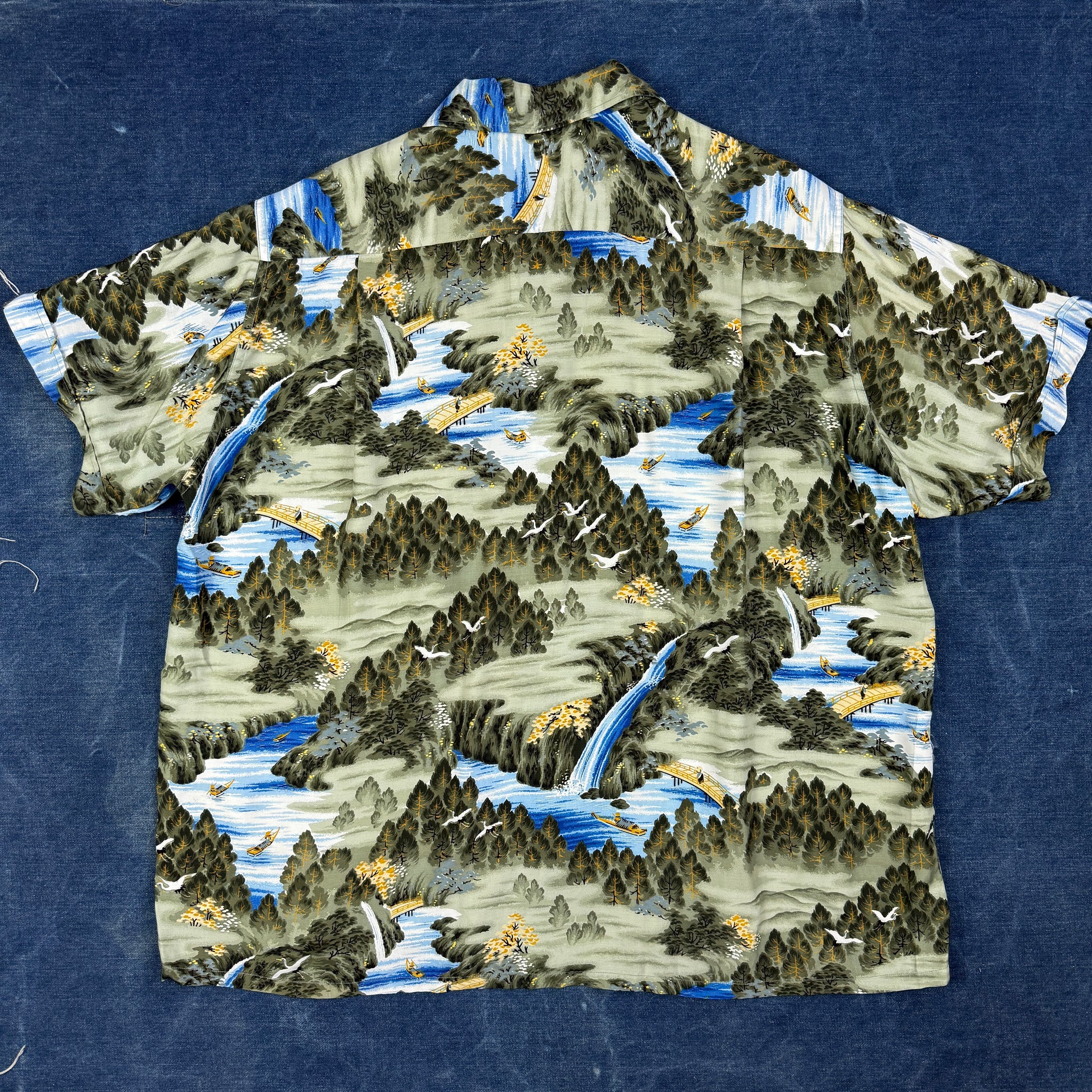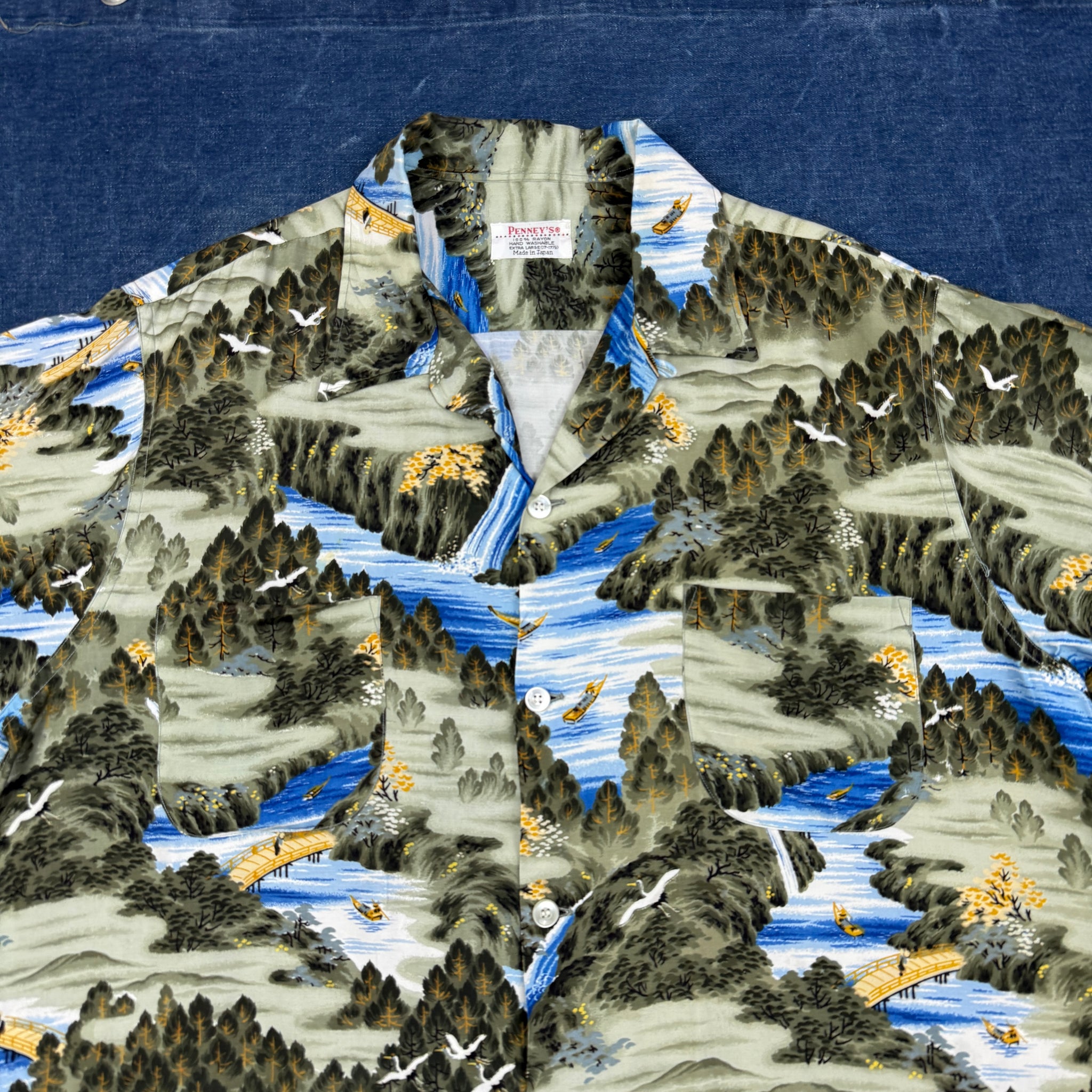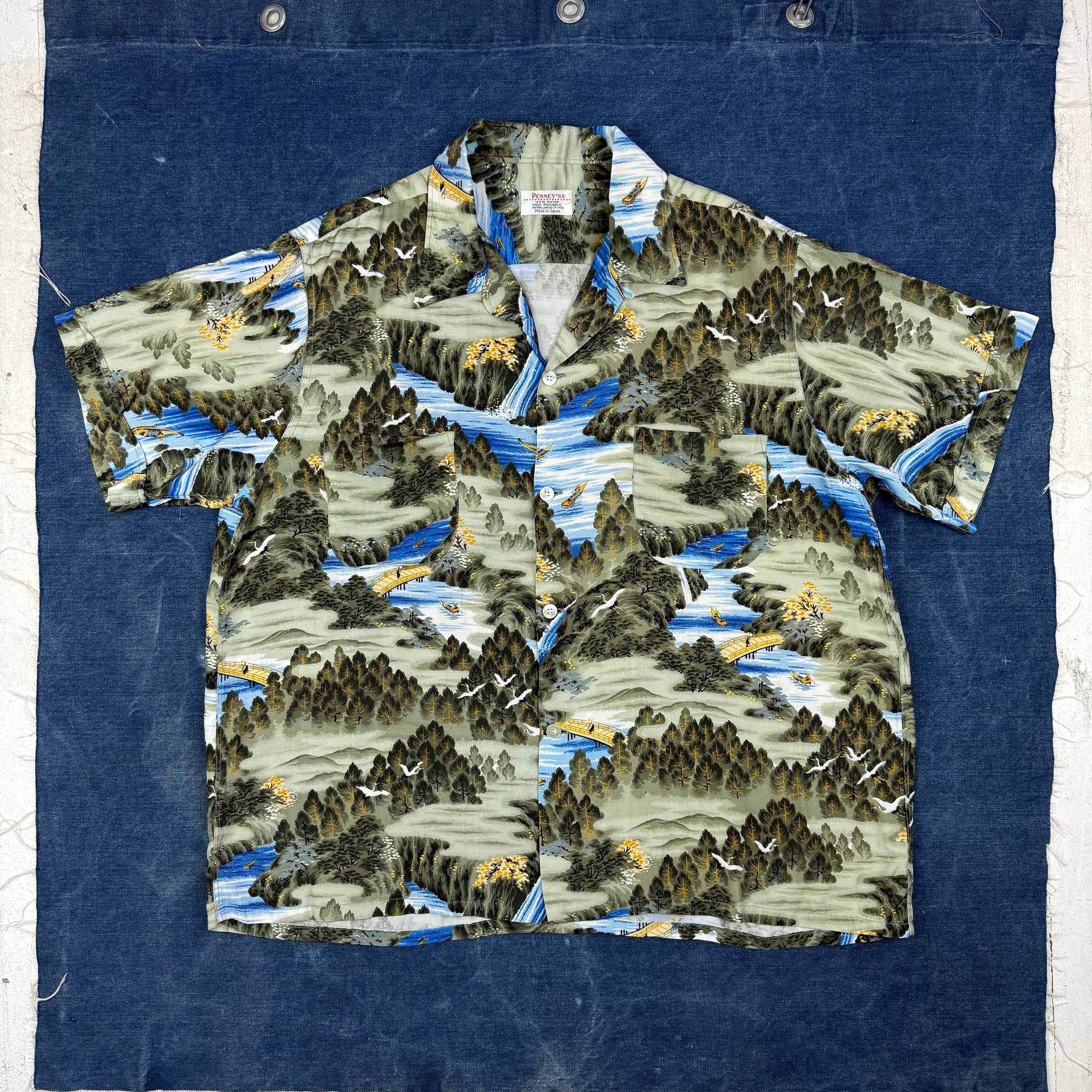 A great example of a late 50s to early 60s Penneys Sears made Hawaiian aloha shirt. This comes from the period around the time Hawaii was admitted to the union in 1959 and there was an explosion in the popularity of Hawaiian culture across the US. 100% rayon and made in Japan.
