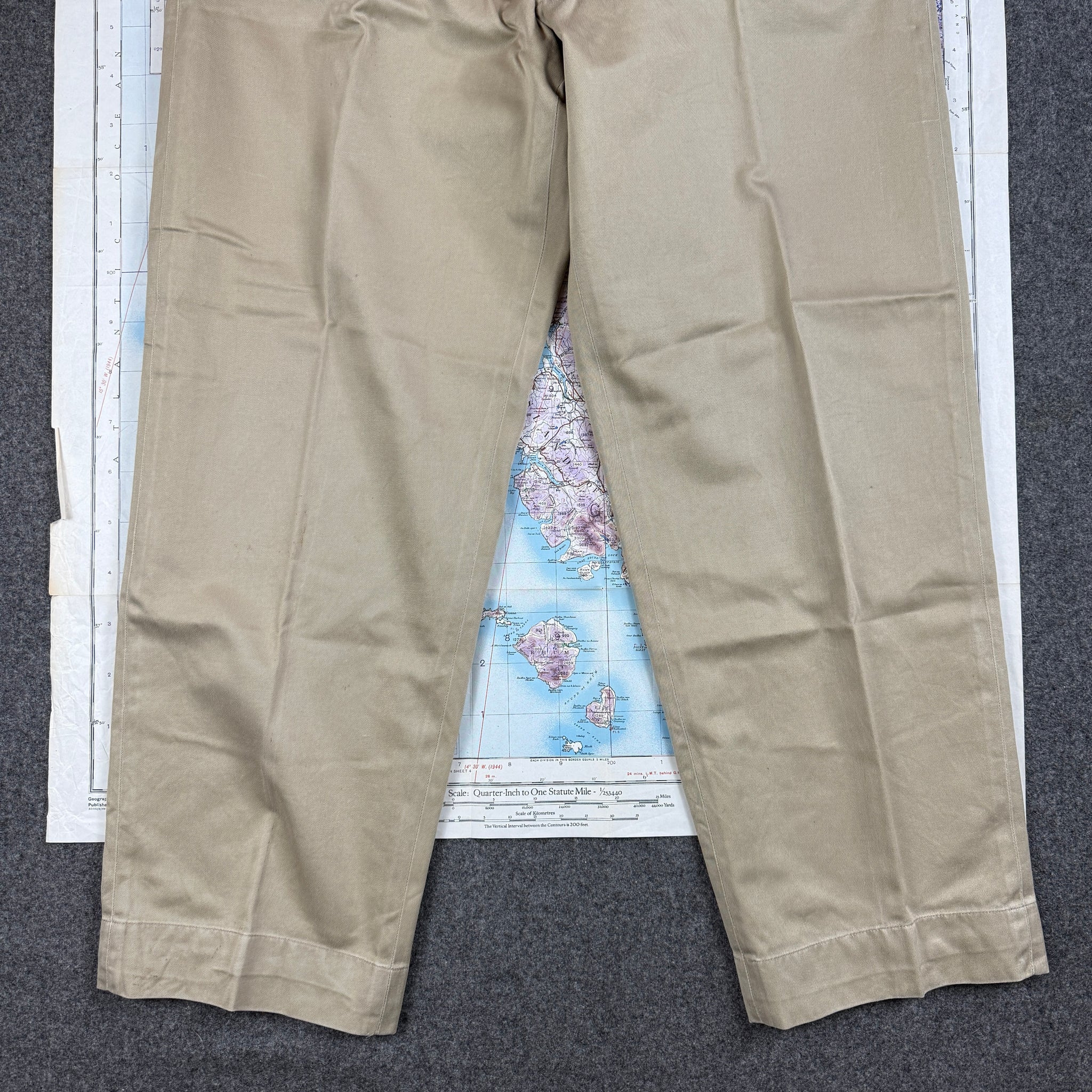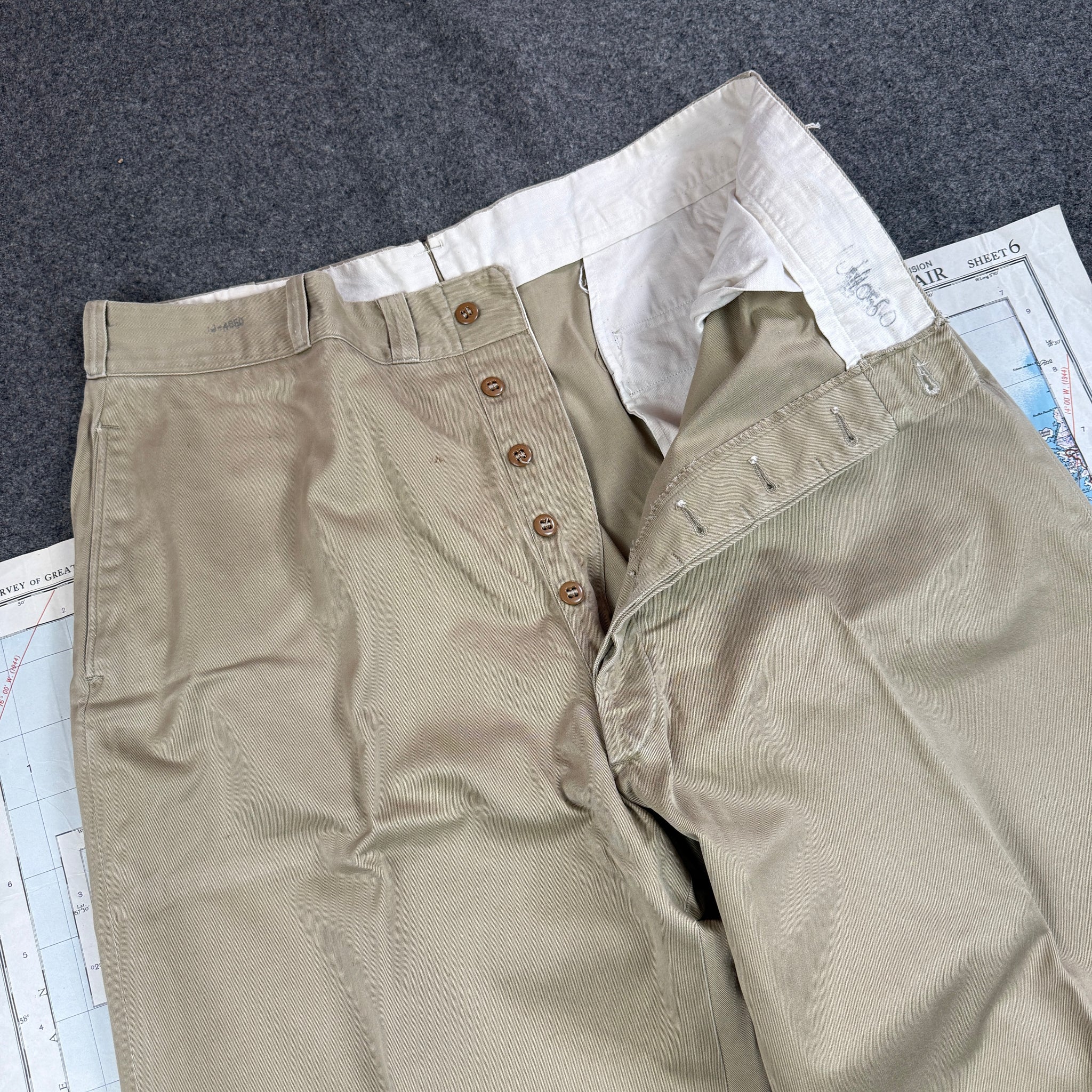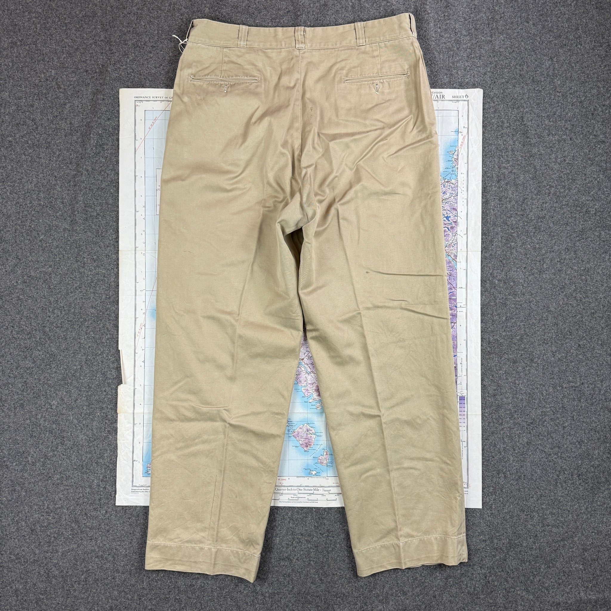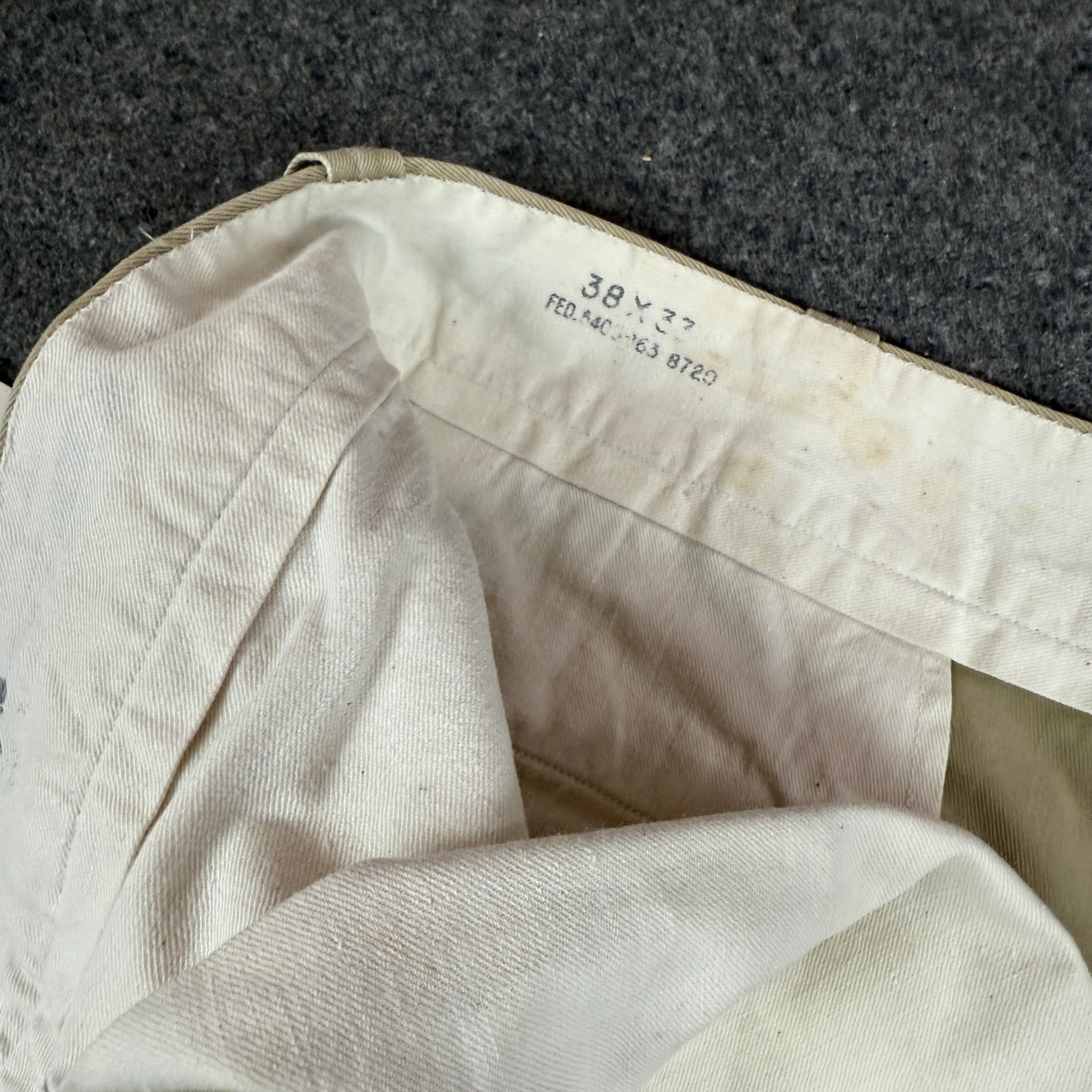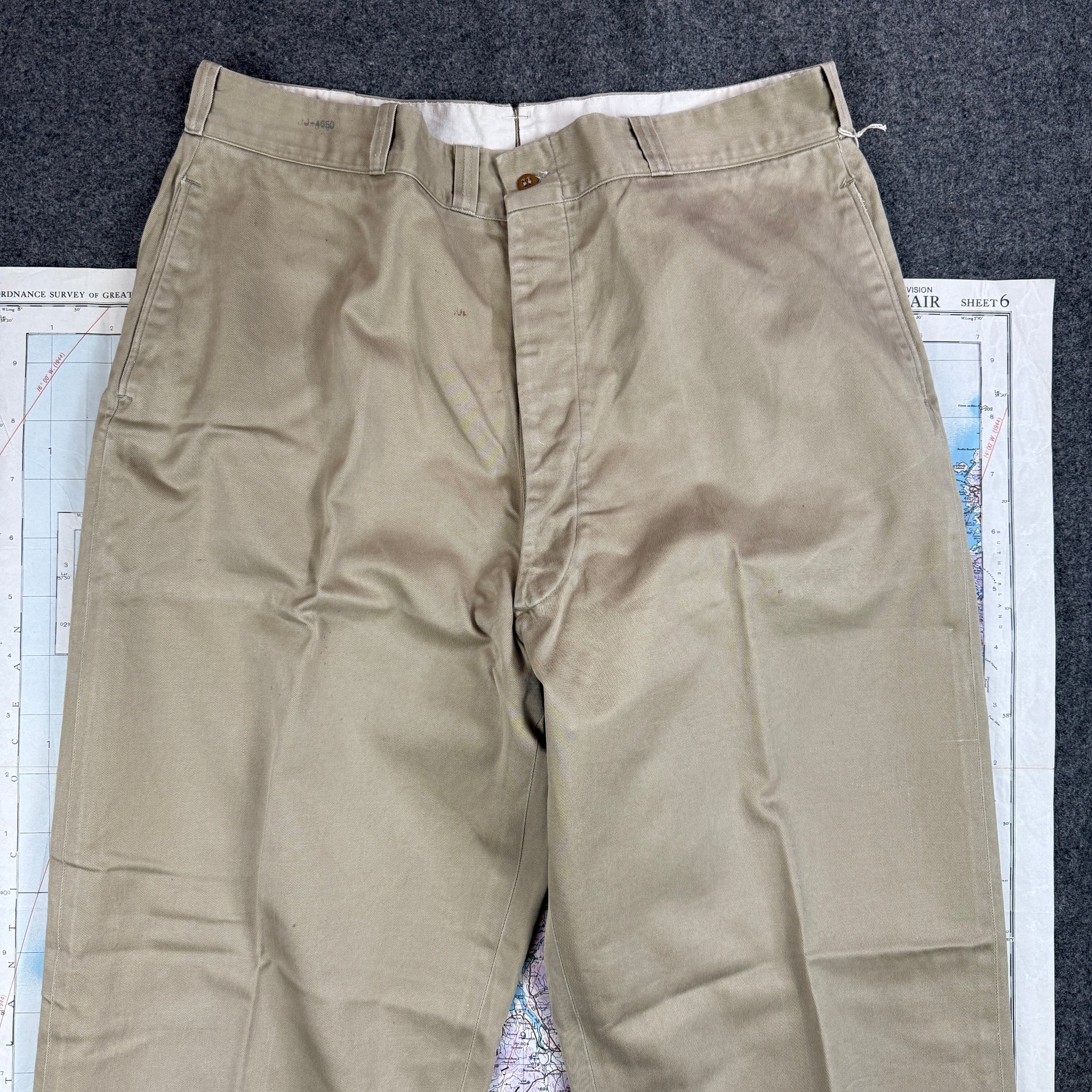 A classic pair of US Army khaki trousers. First introduced shortly before the war, this style would be worn by servicemen of all branches of the military and continue in use to this day. This is an example of the 1956 pattern, manufactured in 1956.