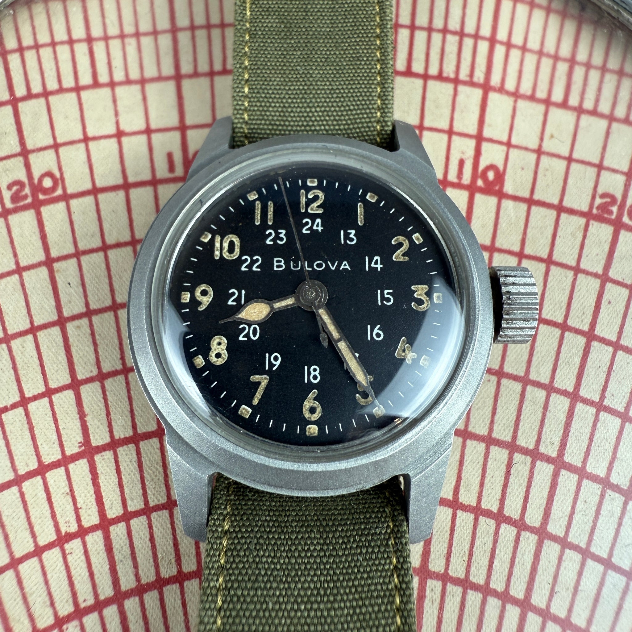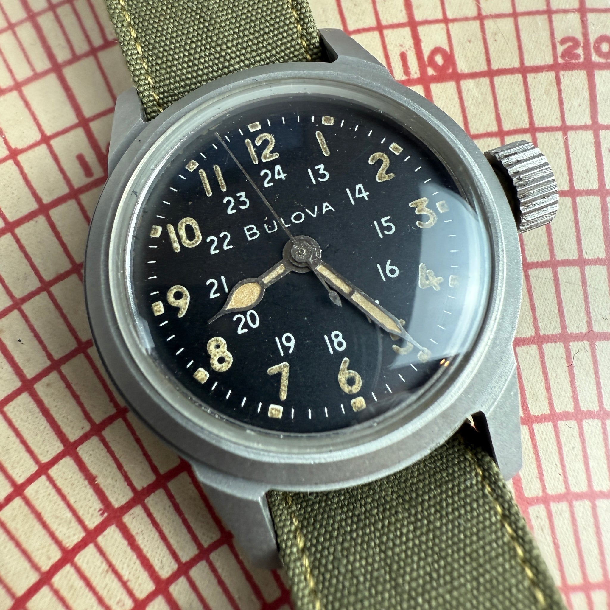 A beautiful example of a Bulova field watch, designed in the mid 1950s as an all-purpose field watch for the Army. This example is dated 1962. Comes complete with it's original 10BNCH movement which has been recently serviced and is keeping good time - it runs a little fast approx 30s per day. Comes on a deadstock military strap.