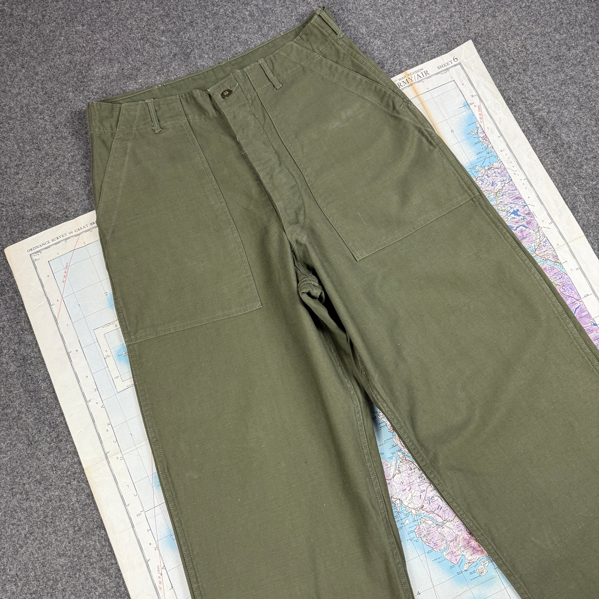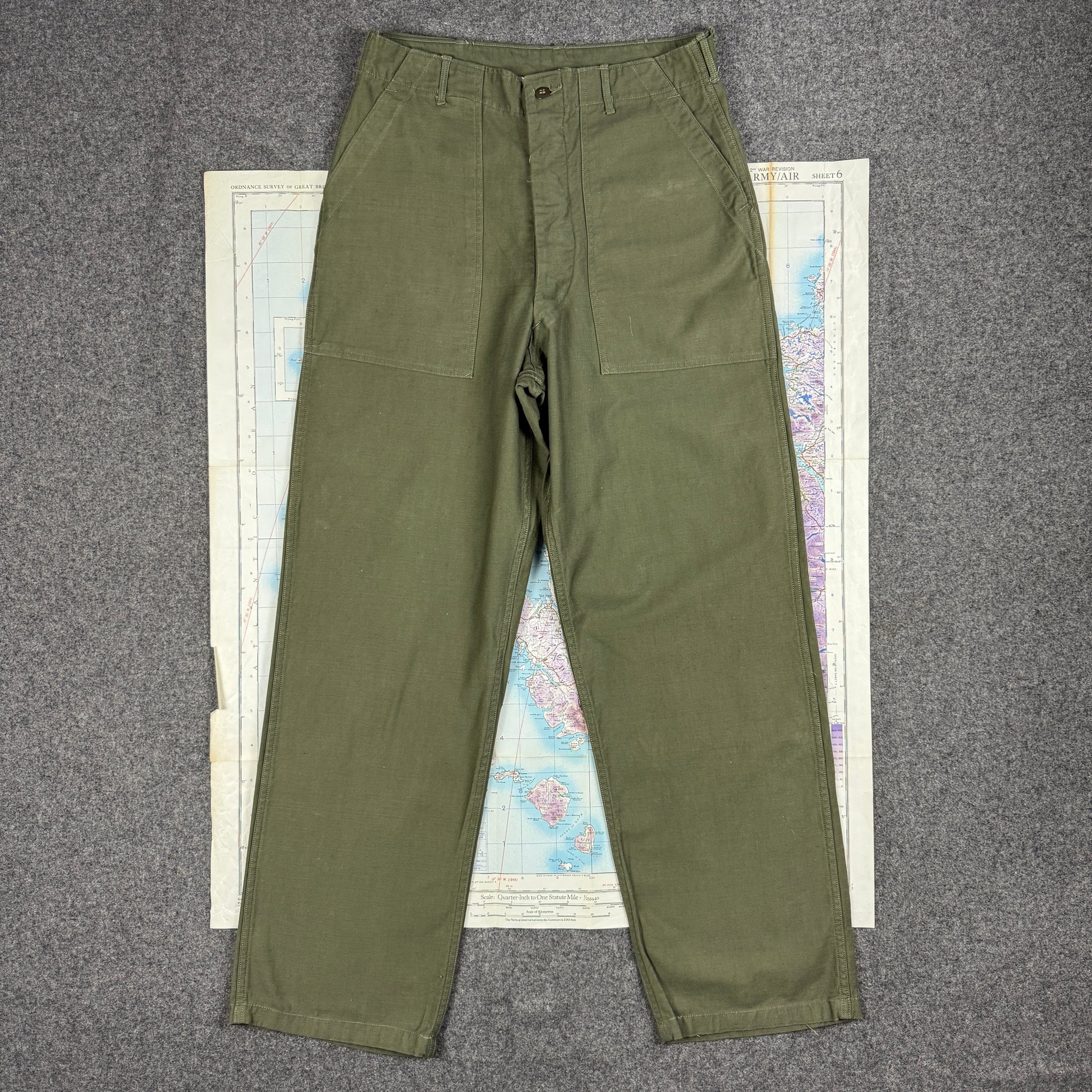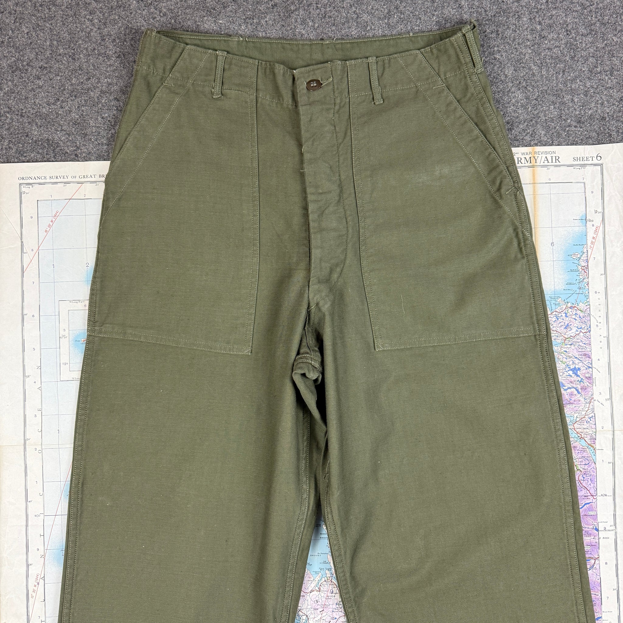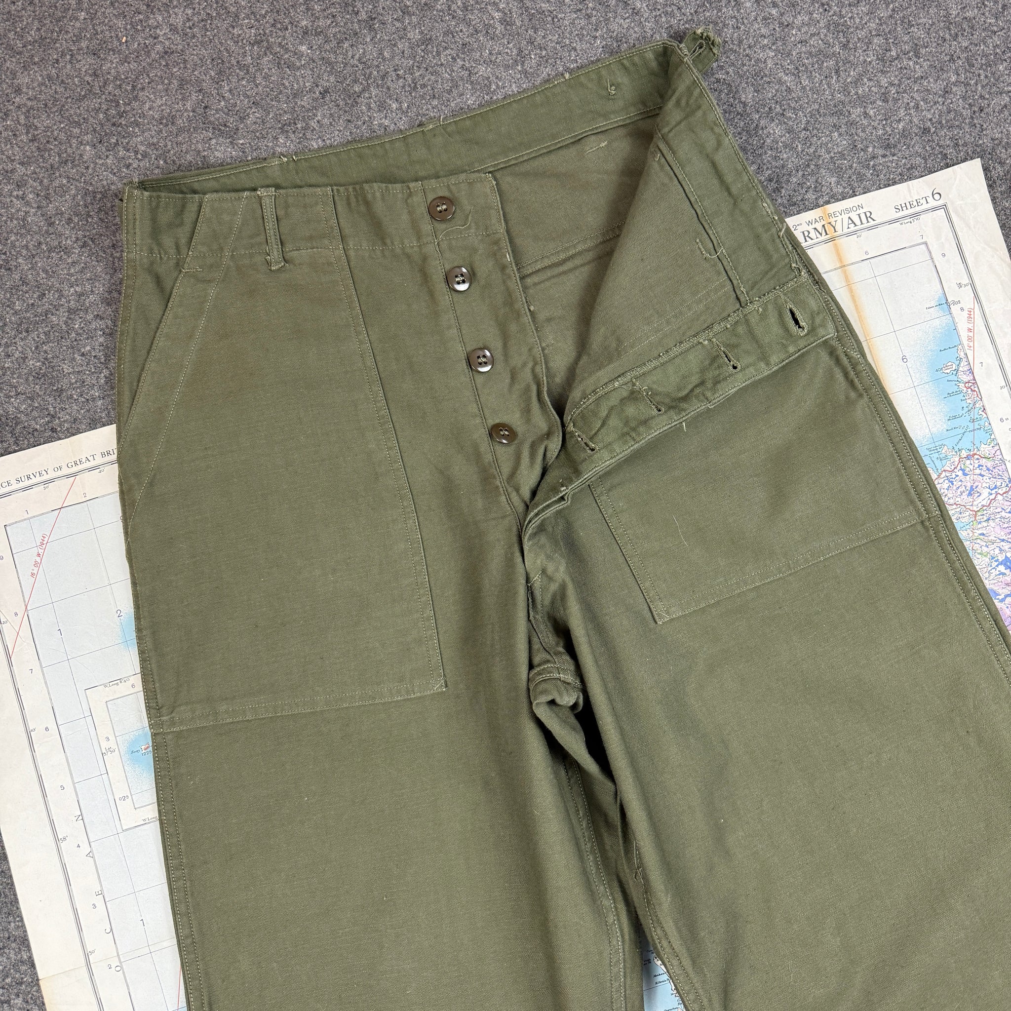 The classic US Army 1950s trousers in sateen fabric. This is a great, very clean example of the early first pattern introduced in the early 1950s and used until the early 1960s.