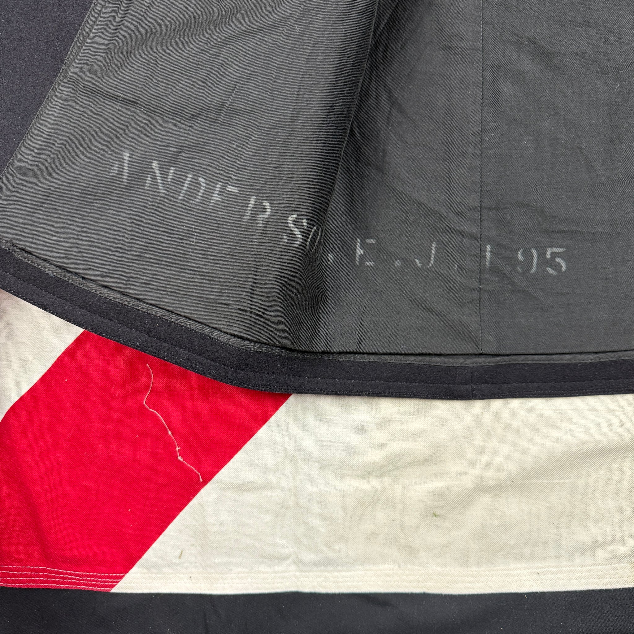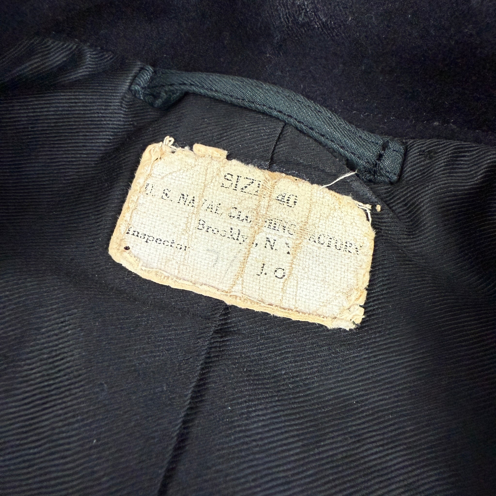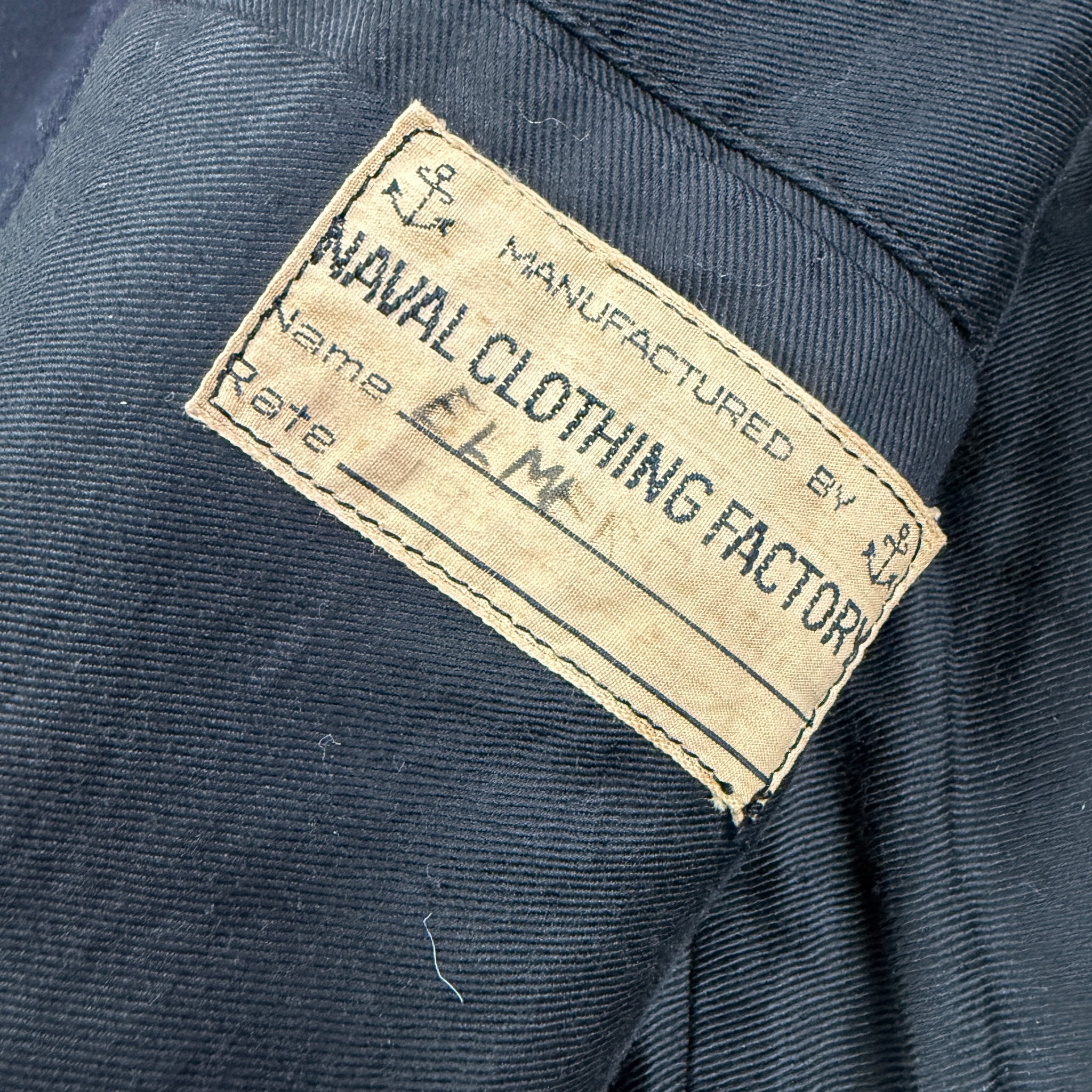 This particular example is from the late 1930s- very early 40s. It has a lovely woven Name/Rating label which was replaced with a printed label by 1941. It was made in the Brooklyn Navy Yard and still includes the paper tag in the neck which is always gone!