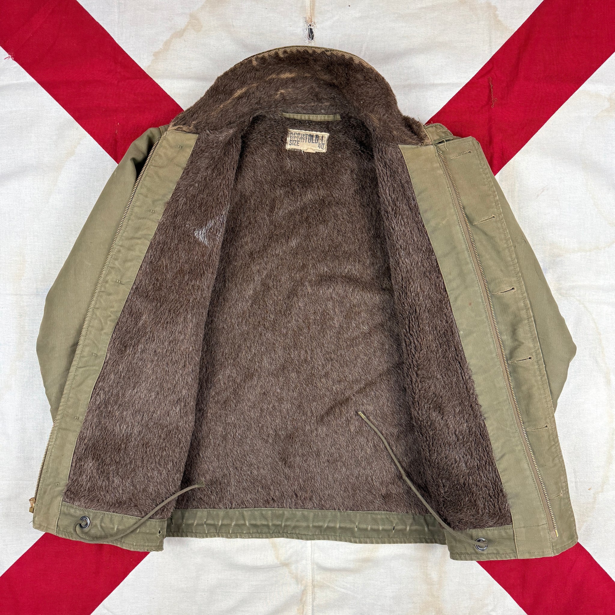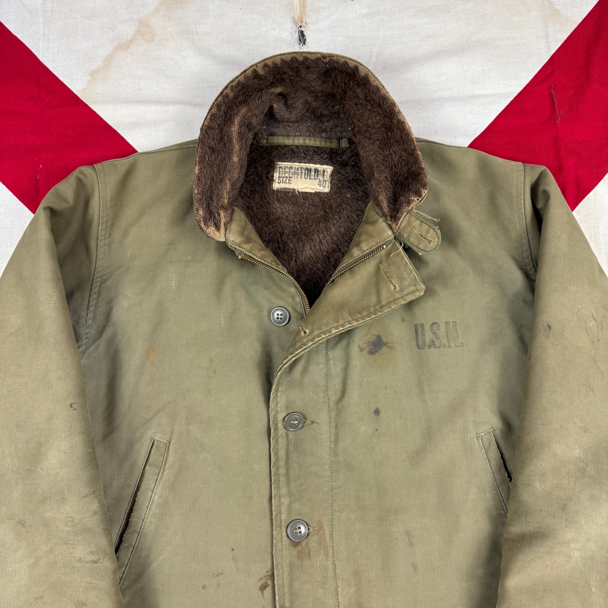 Solid used condition. The jacket itself is good, a little light wear and patina. The zipper was shot so I've replaced it with a NOS period correct Conmar.
