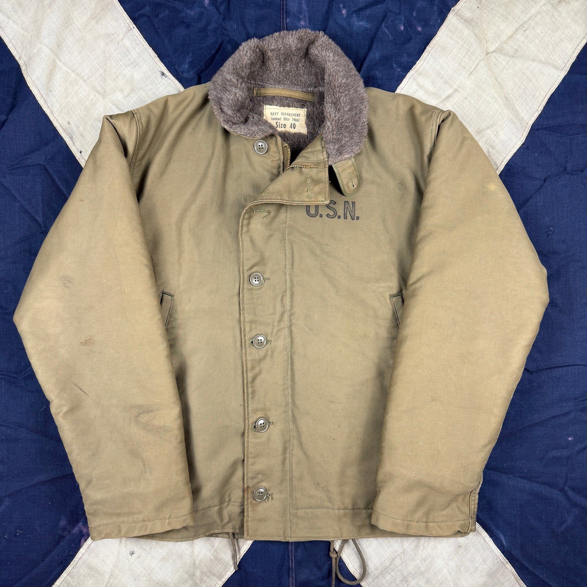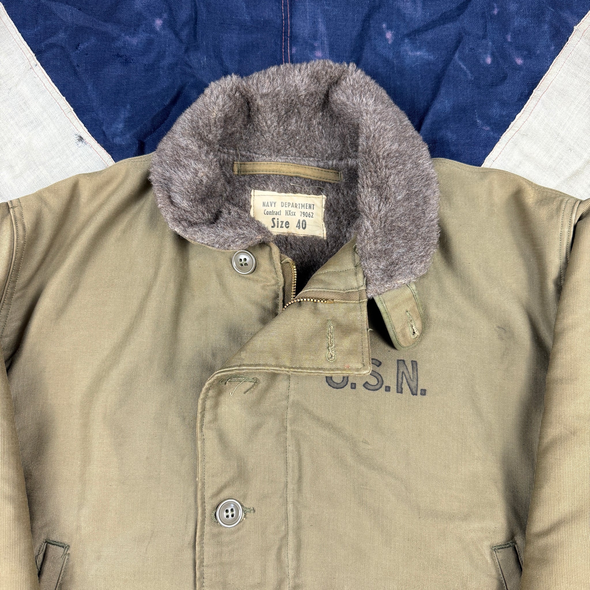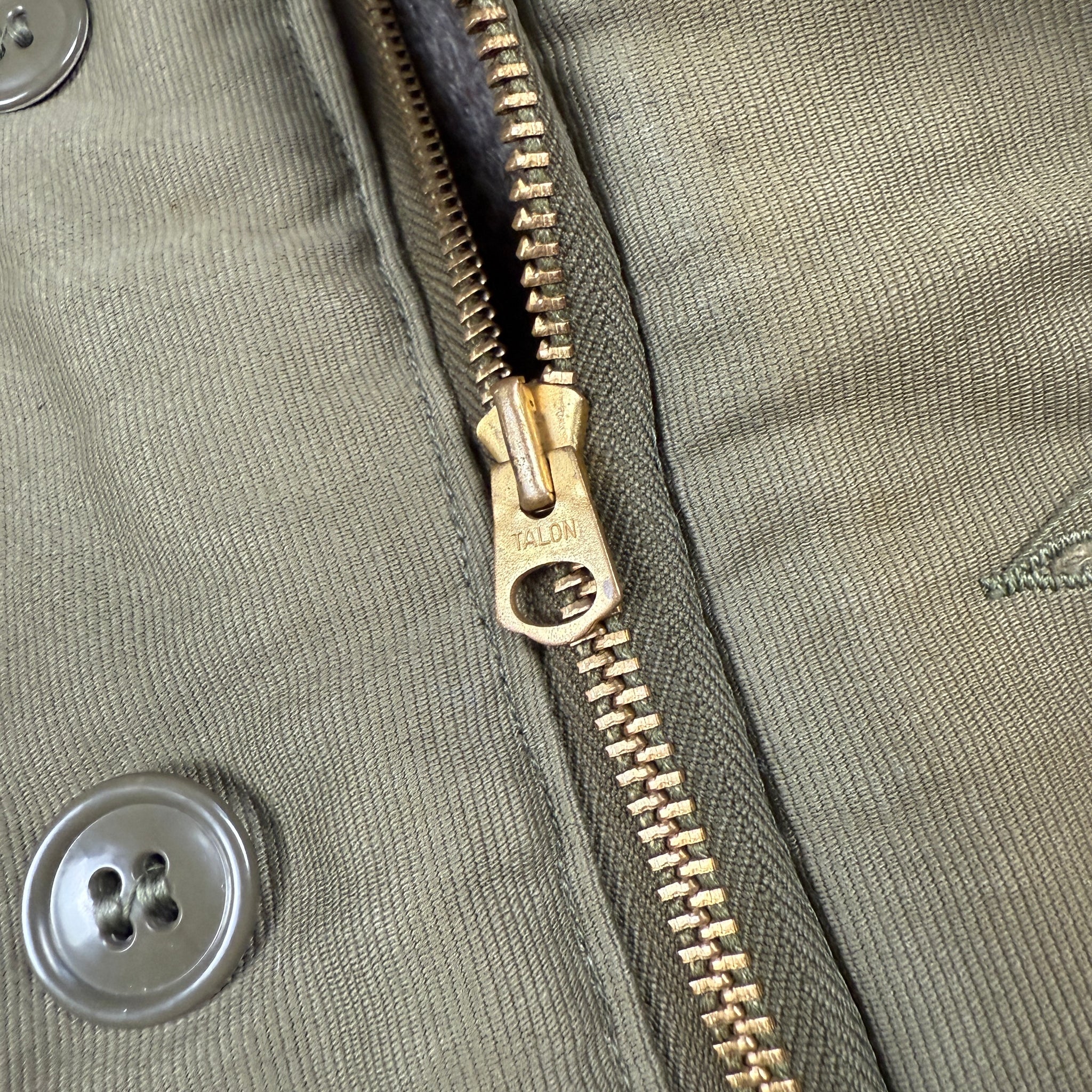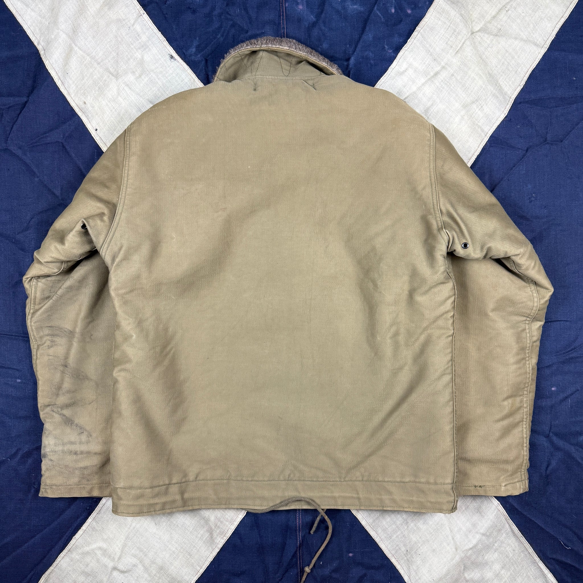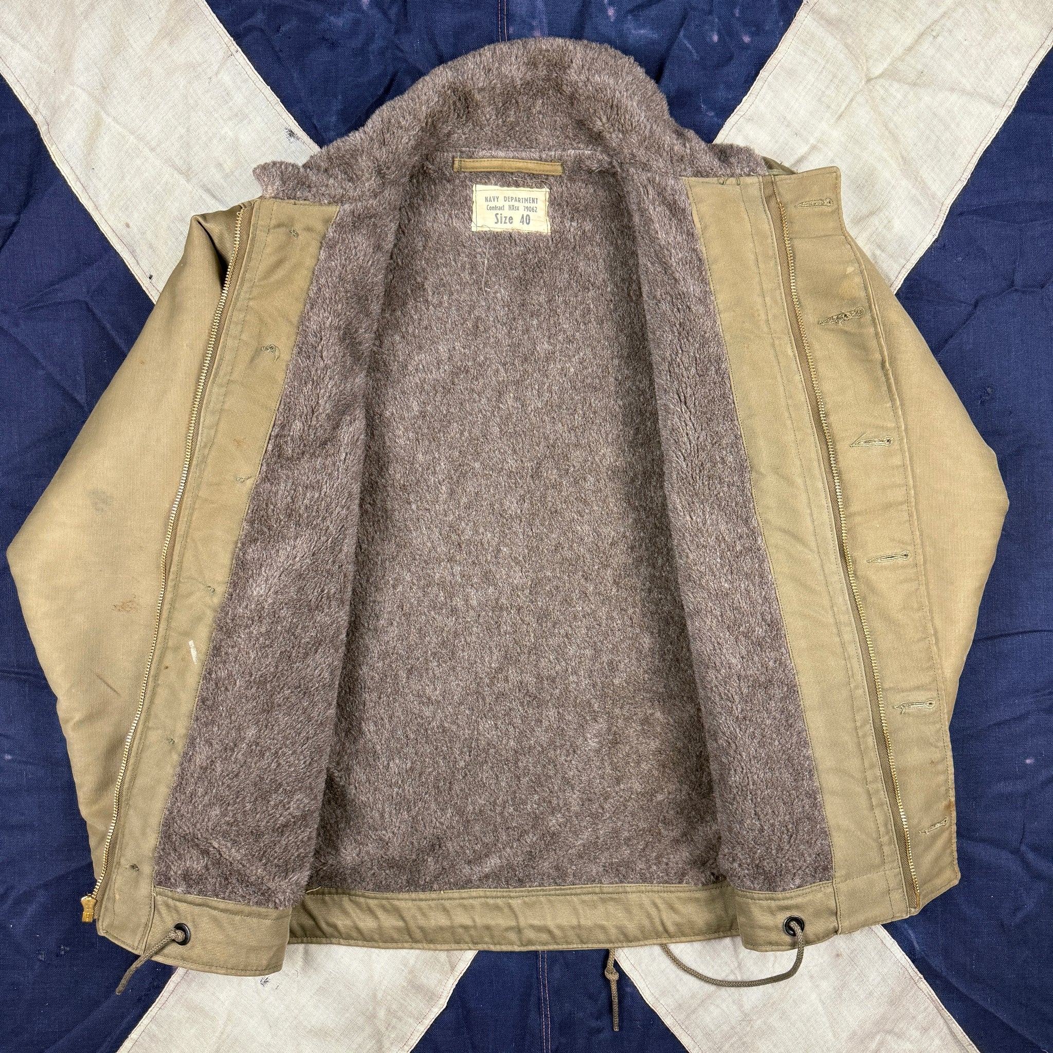 In early 1943 the Navy introduced a new line of redesigned clothing to help it meet its requirements across multiple theatres and areas of operations. Designated with a N (N-1, N-2 and N-3) standing for Navy, this range of clothing would improve upon previous designs, and prepare the navy for the amphibious warfare required in pacific and to land in occupied Europe. The N-1 deck jacket was a vast improvement on the previous blue jackets, retaining the thick jungle cloth, but changing to a khaki colour more suitable as camouflage. It returned to a zip closure, improved the fit, changed to a thick alpaca lining and included a draw string around the waist. For anyone who has owned both will tell you, these are much better jackets to wear in the cold.