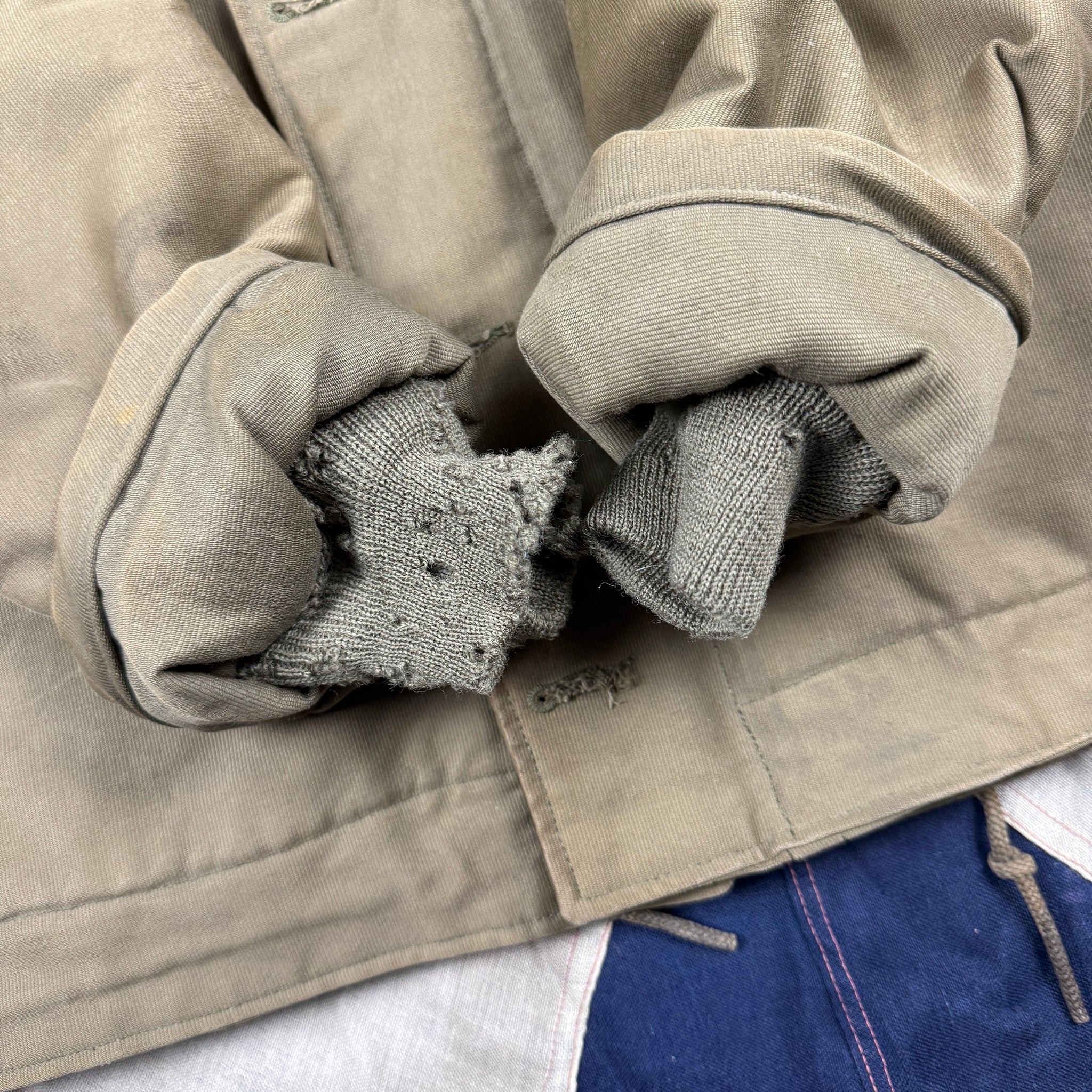 Seemingly only Lightly used and in excellent condition. Good strong colour to the tag and USN stamp, original Talon zipper works well, the fur is thick and the jungle cloth in great shape. There are a few marks to the shell, and some light fading. The only issue of note is some moth damage to cuffs, particularly the right one.