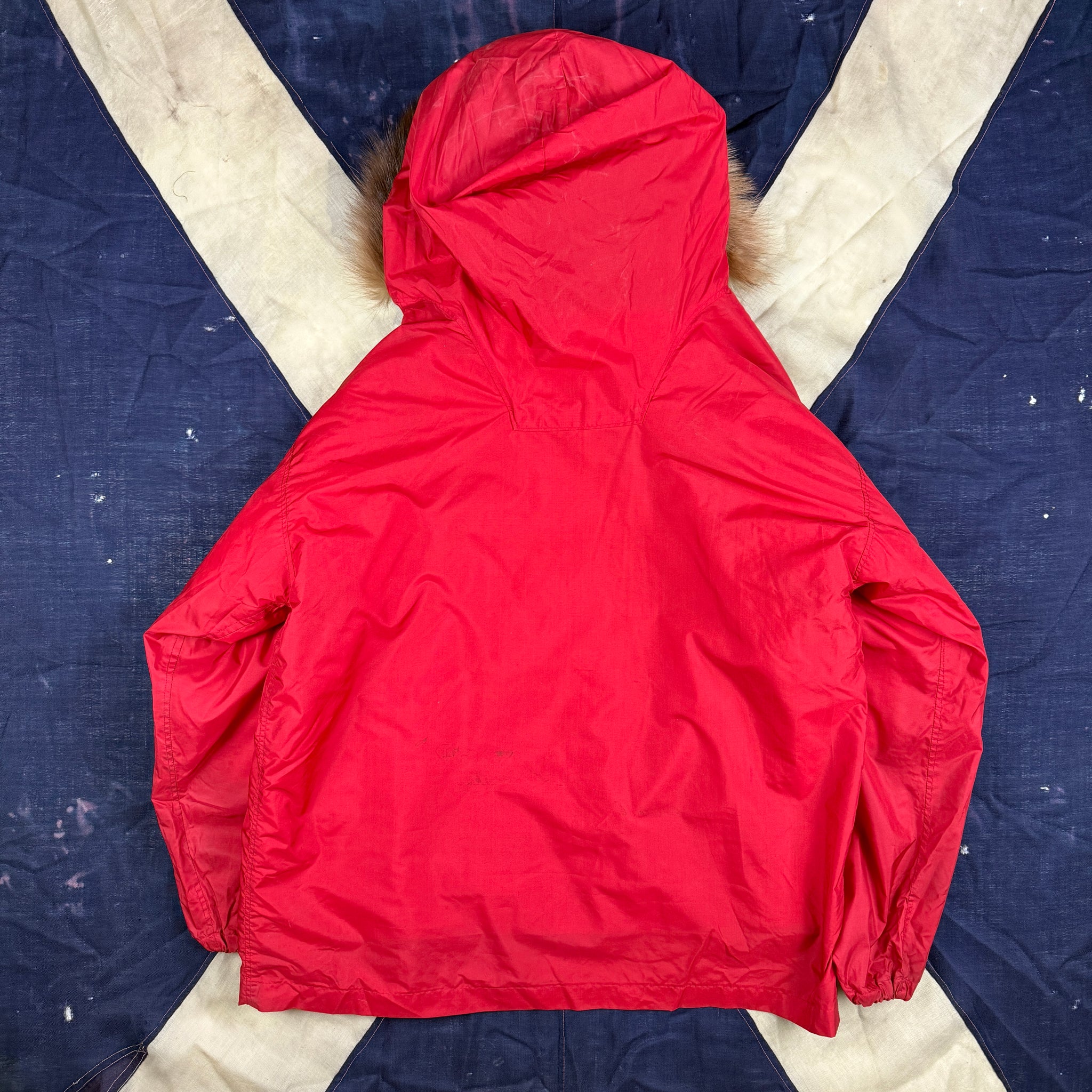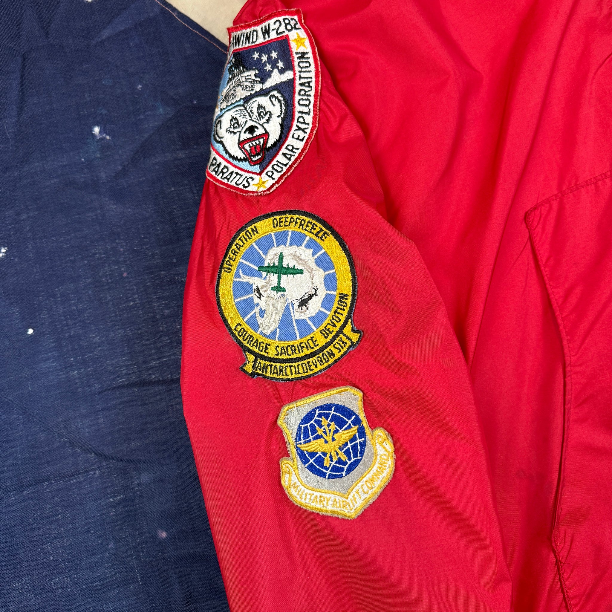 A super cool example of a 1960s 'rigger' made parka as used by US Navy crews in Operation Deep Freeze in antartica in the late 1960s to early 70s.. As with other I've come across, this is simply made combining an parka liner, detachable hood and a custom made nylon shell. This example comes beautifully patched to the chest and both sleeves. Based one YKK zipper and patches I believe this example dates from the late 60s.