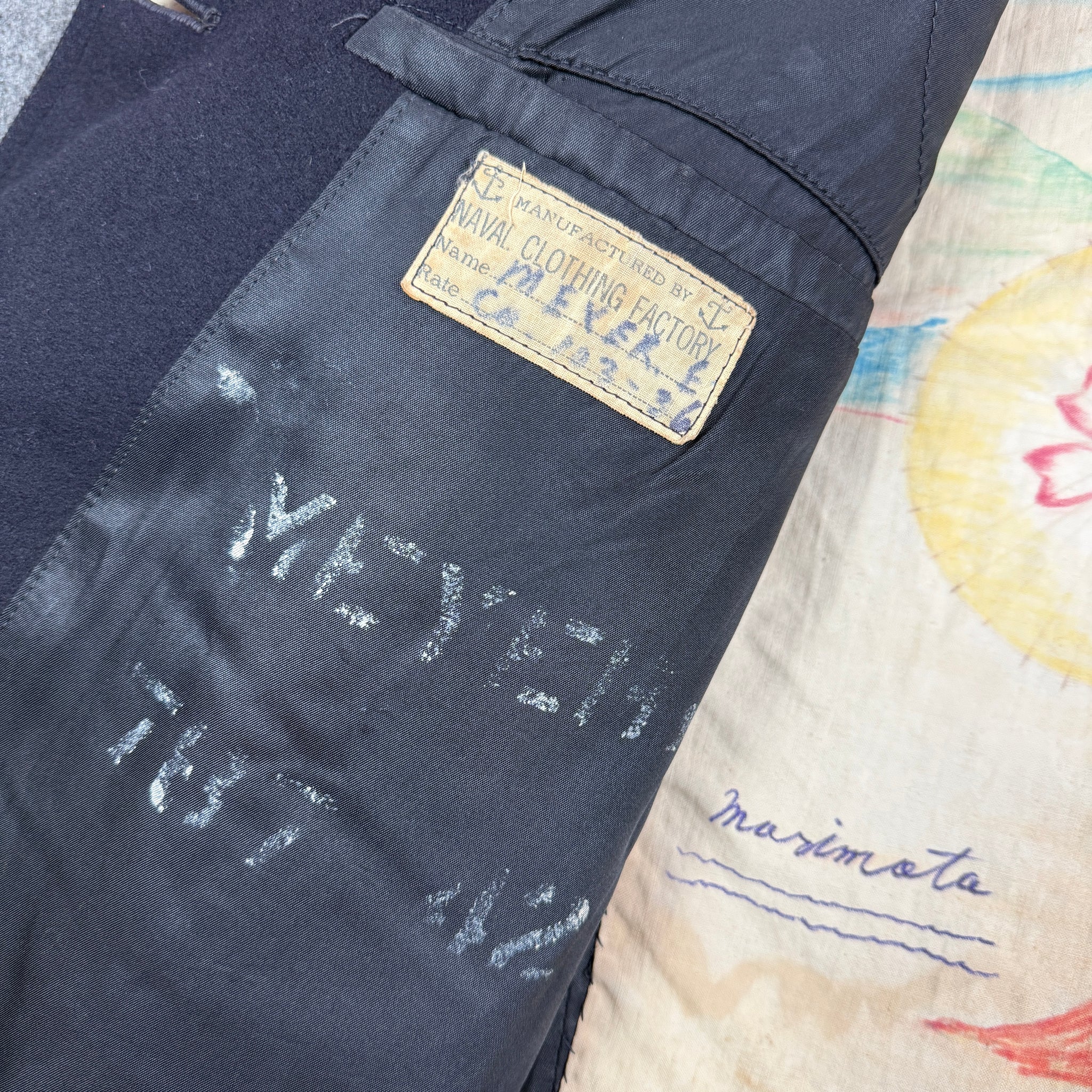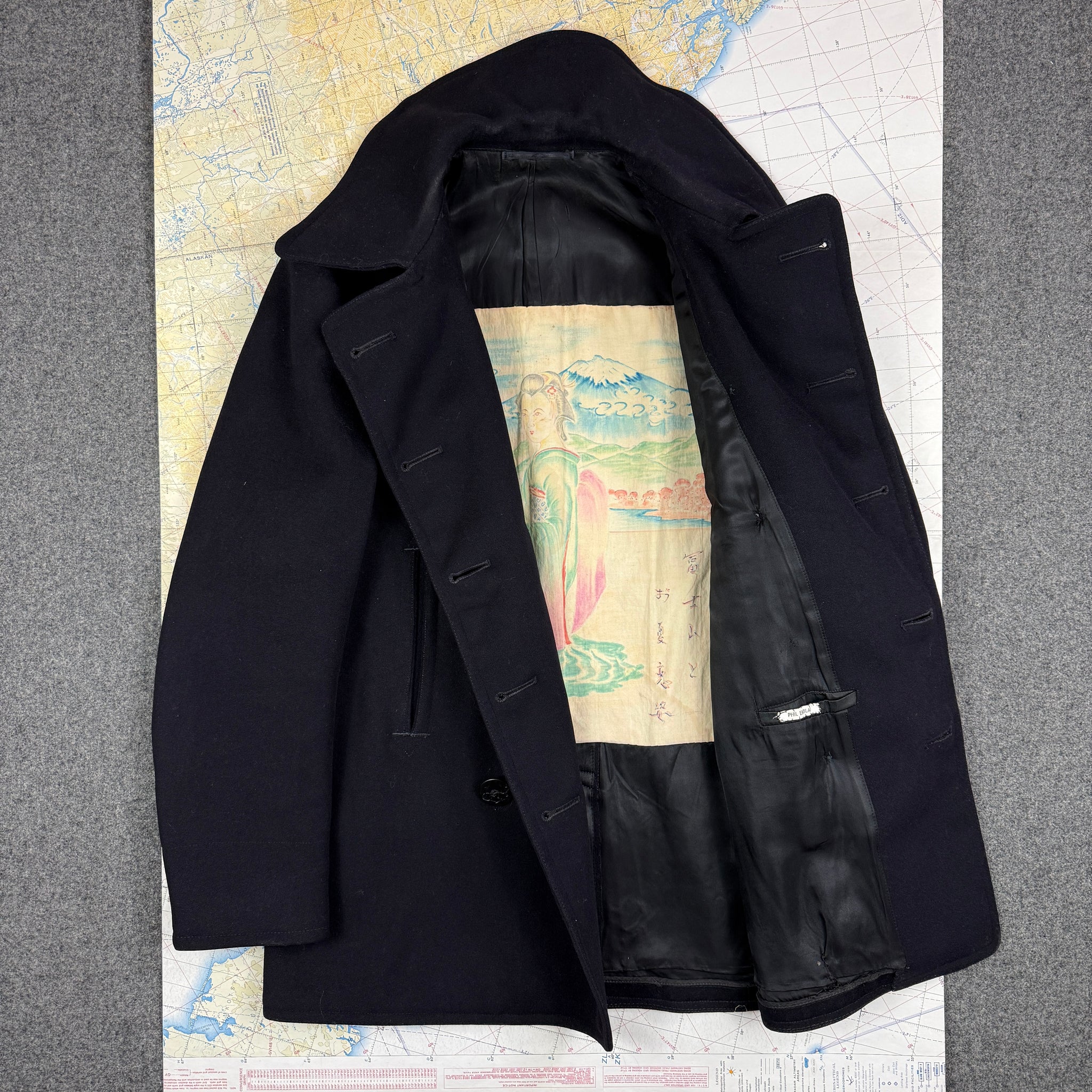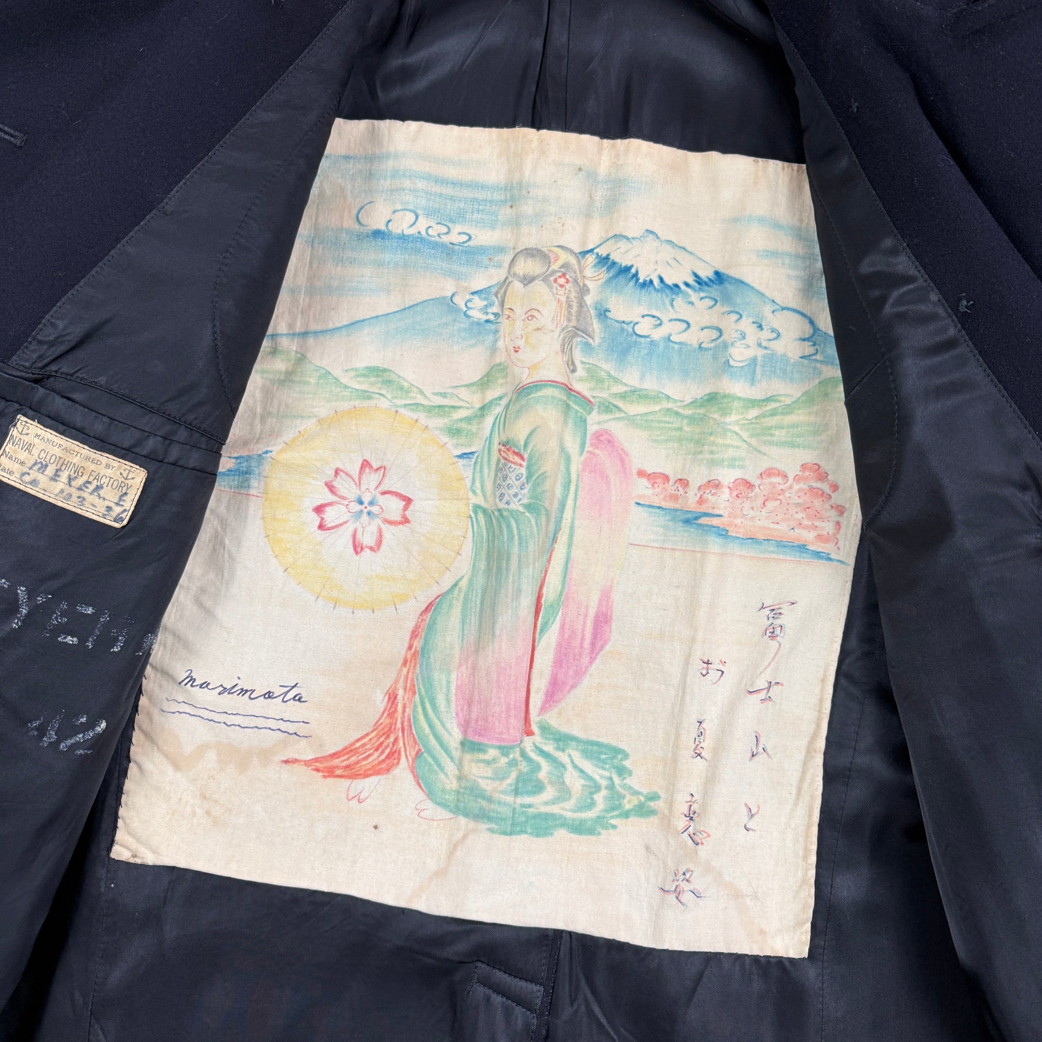This particular example is not just a standard peacoat, its been altered with the addition of a beautiful custom painted Geisha to the lining. This was almost certainly done in Japan in the early postwar years.