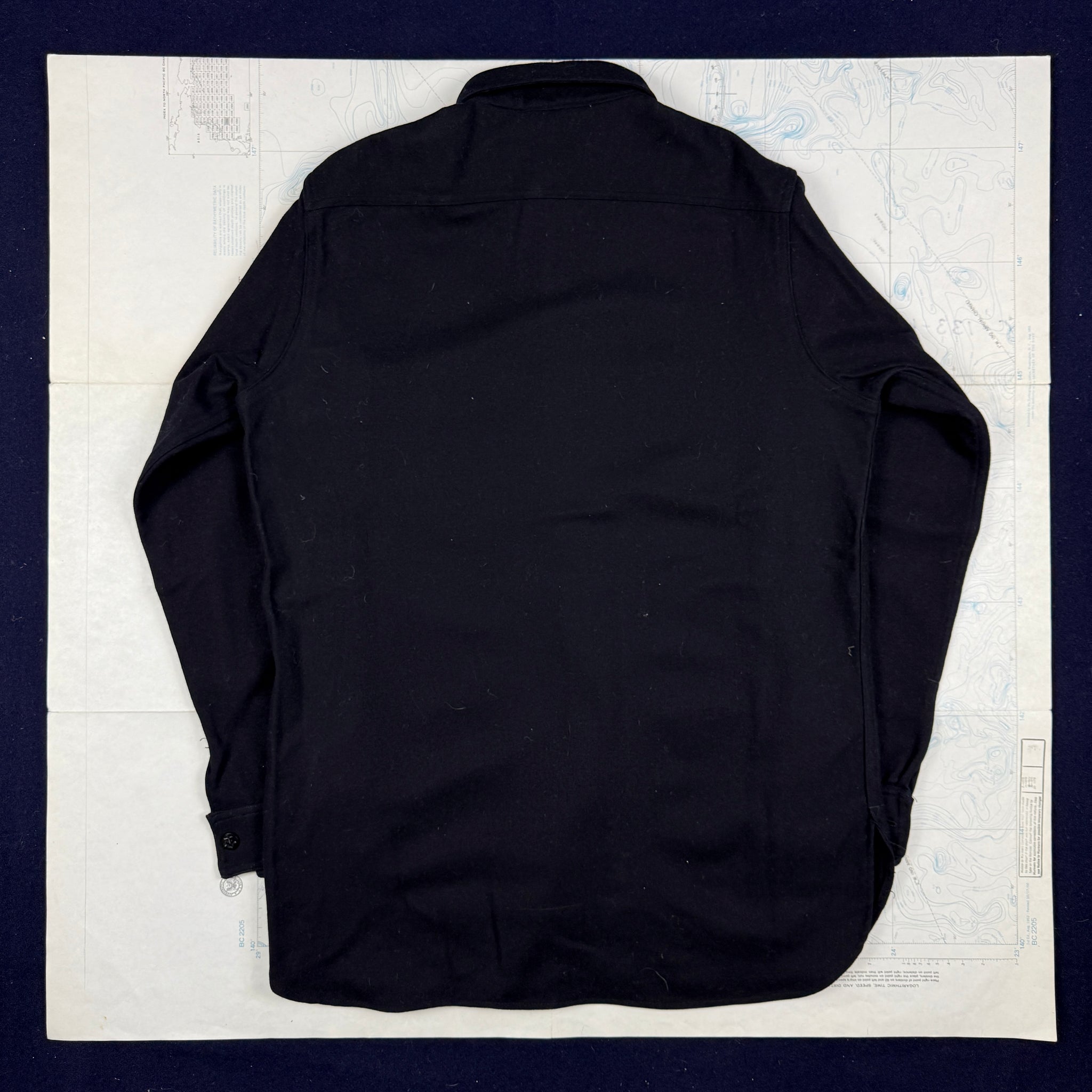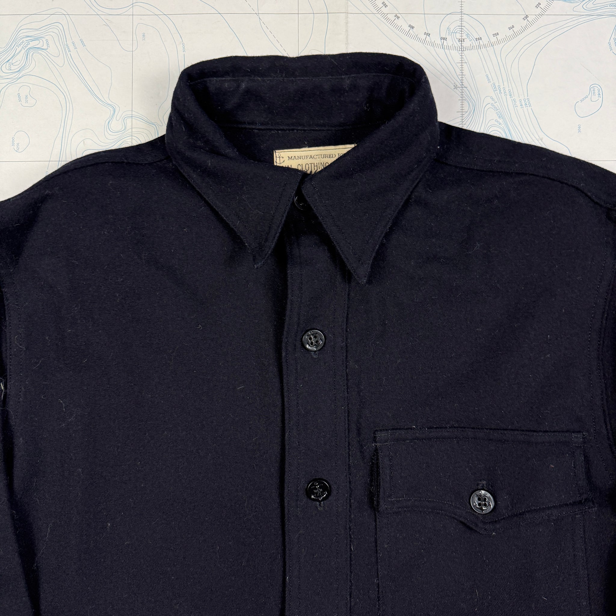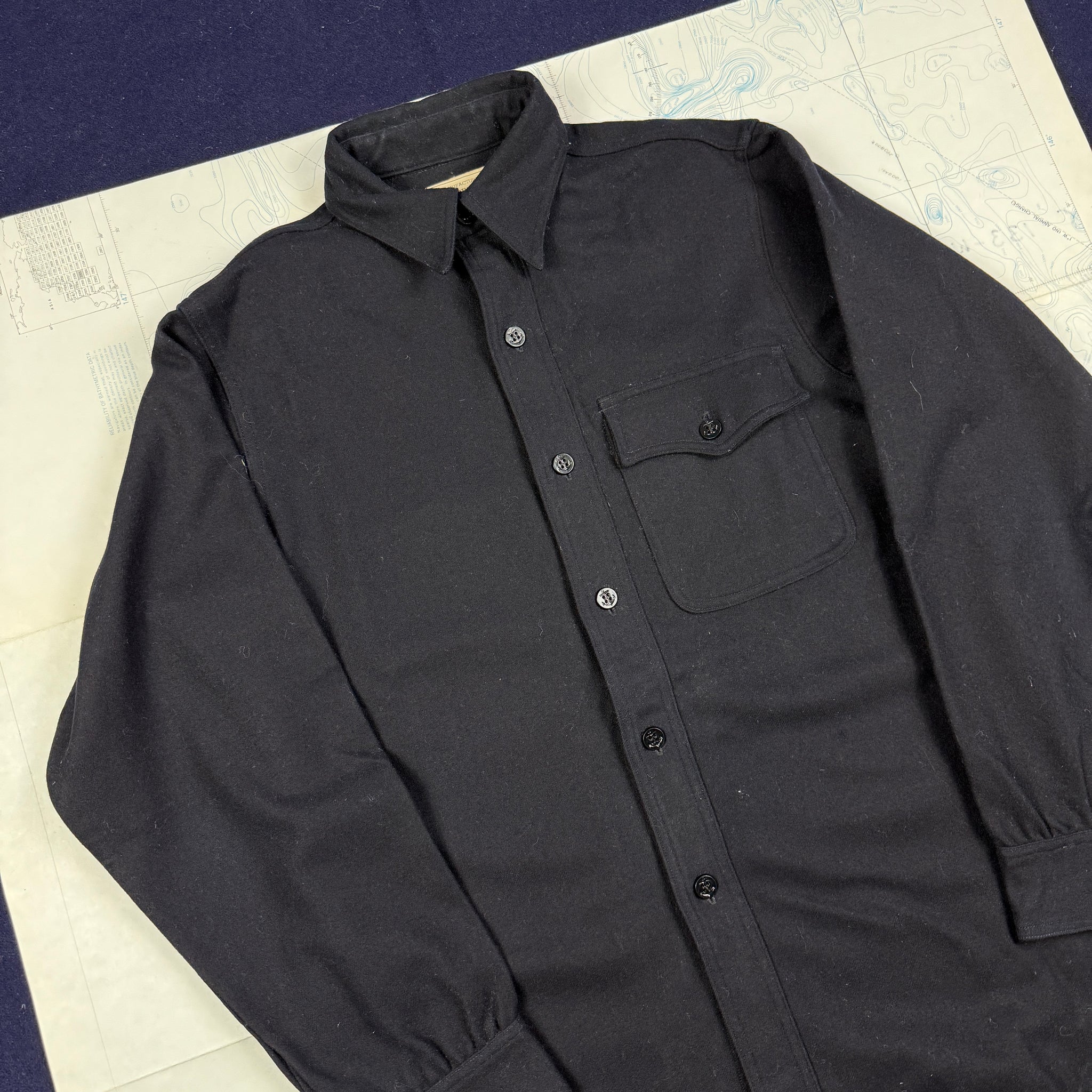 The US Navy had introduced a black flannel shirt for Officers and Chiefs in the 1920s to provide an additional layer of warmth, worn whilst at sea. These popular garments went through a number of changes in their lifetime, starting with no pockets, then two pockets in the 20s, one pockets during WW2, and back to two pockets post-war. This particular shirt is an mid-war one pocket version, with a printed Naval Clothing Factory tag and size tag! This is one of those pieces, timelessly cool, built to last and surprisingly warm!