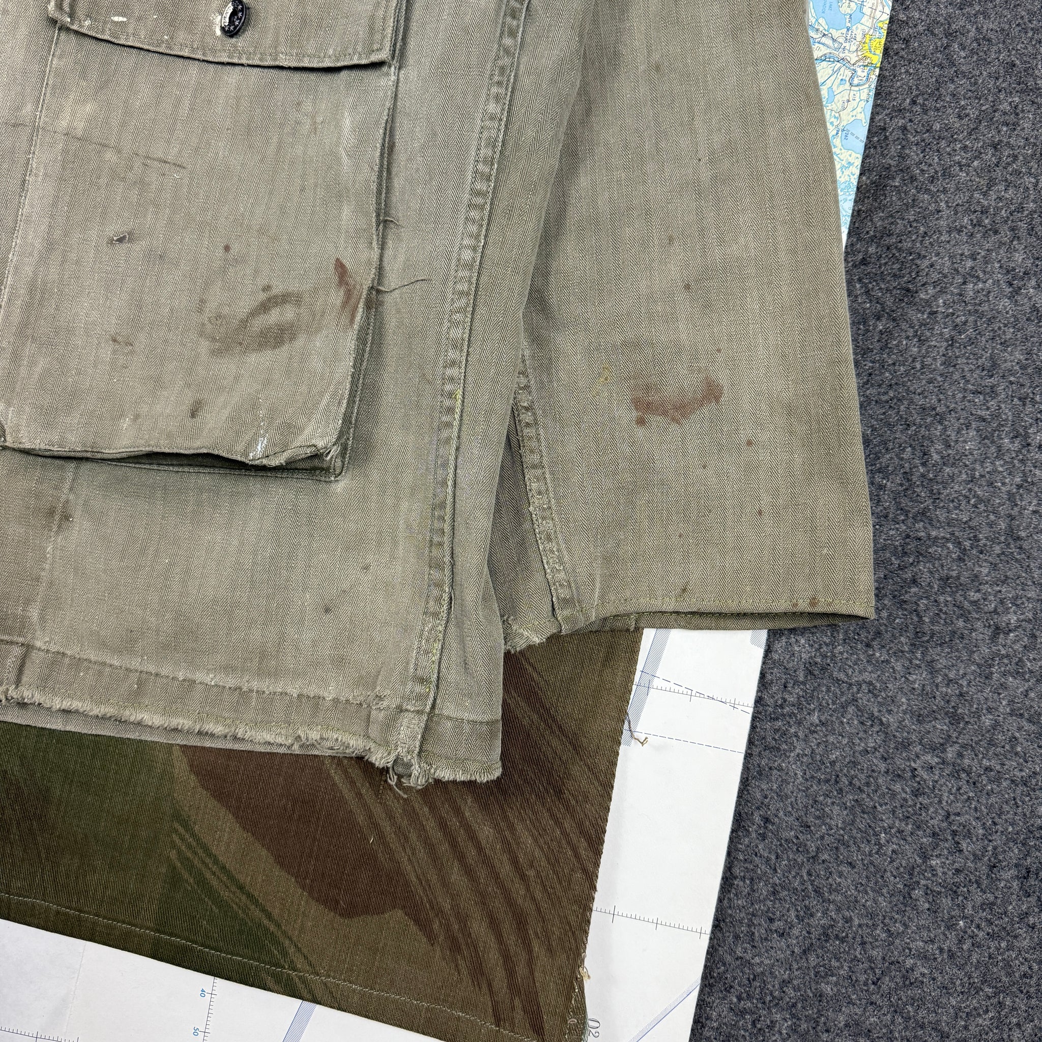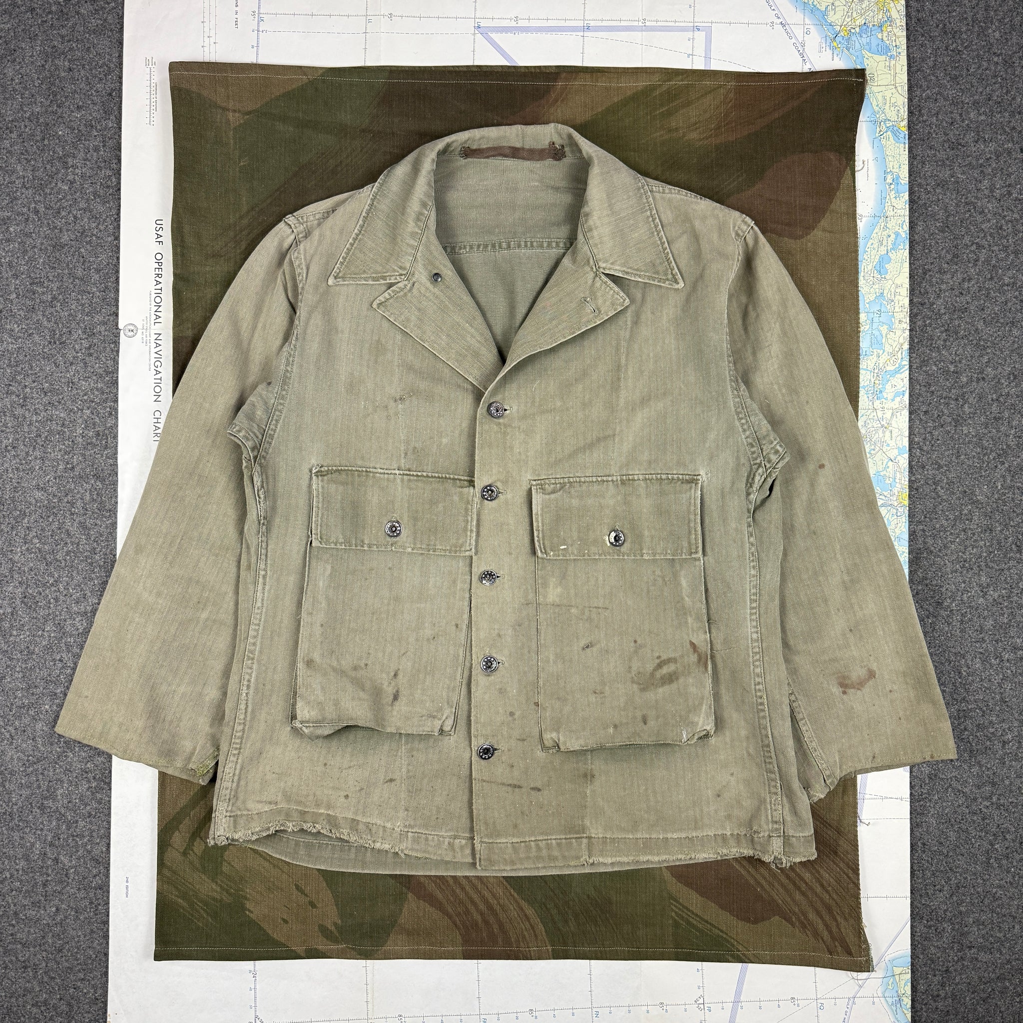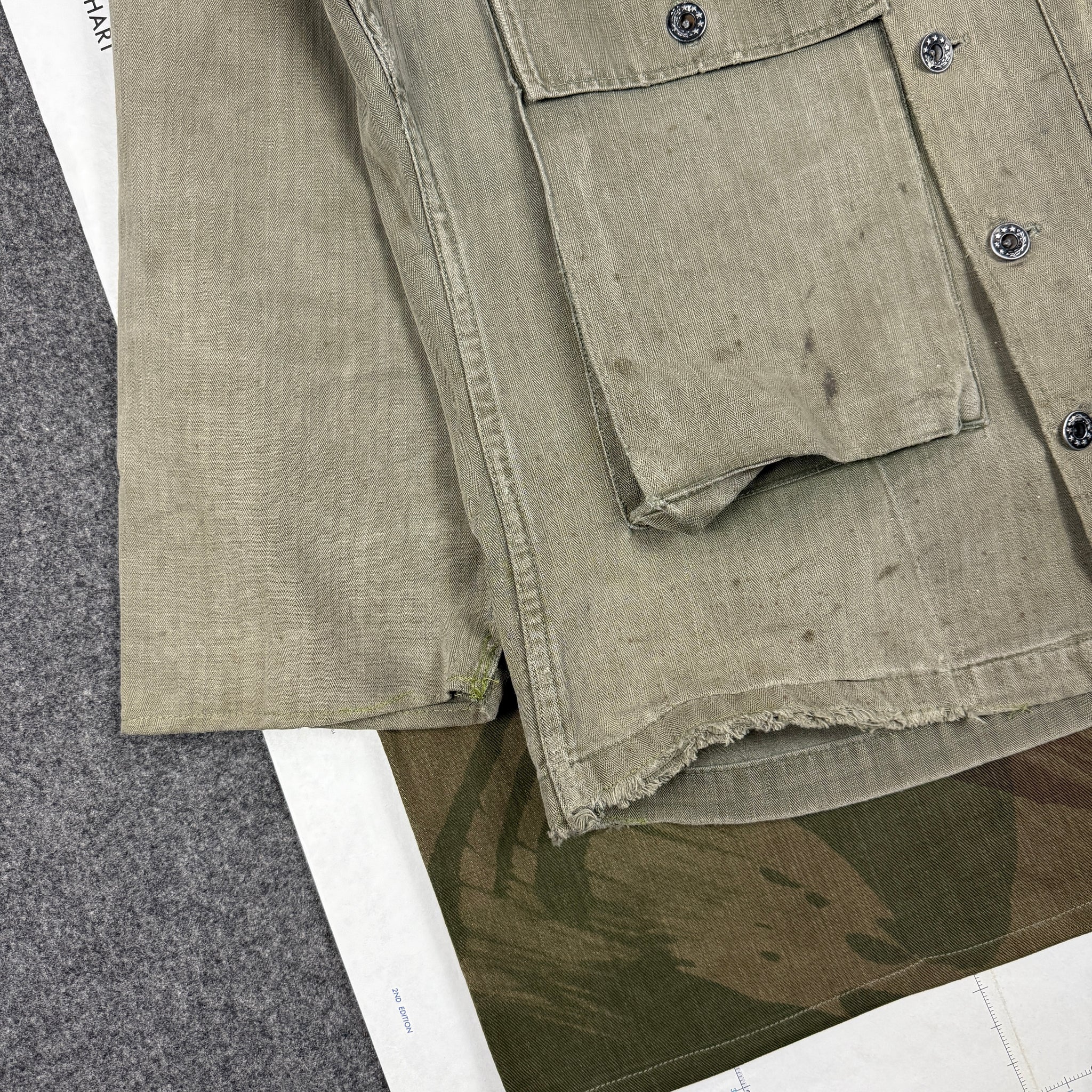 So the story goes (and I could be wrong here), these hbt shirts were made in limited numbers for Navy personal serving in combat, Seabee Engineers or Medical Corpsmen etc. Whilst very similar to their army counterparts, these feature a pocket that sits much lower, almost over the belly, the classic USN wreath donut buttons, and a pleated back. It was also missing the gasflap that is commonly removed on army examples.