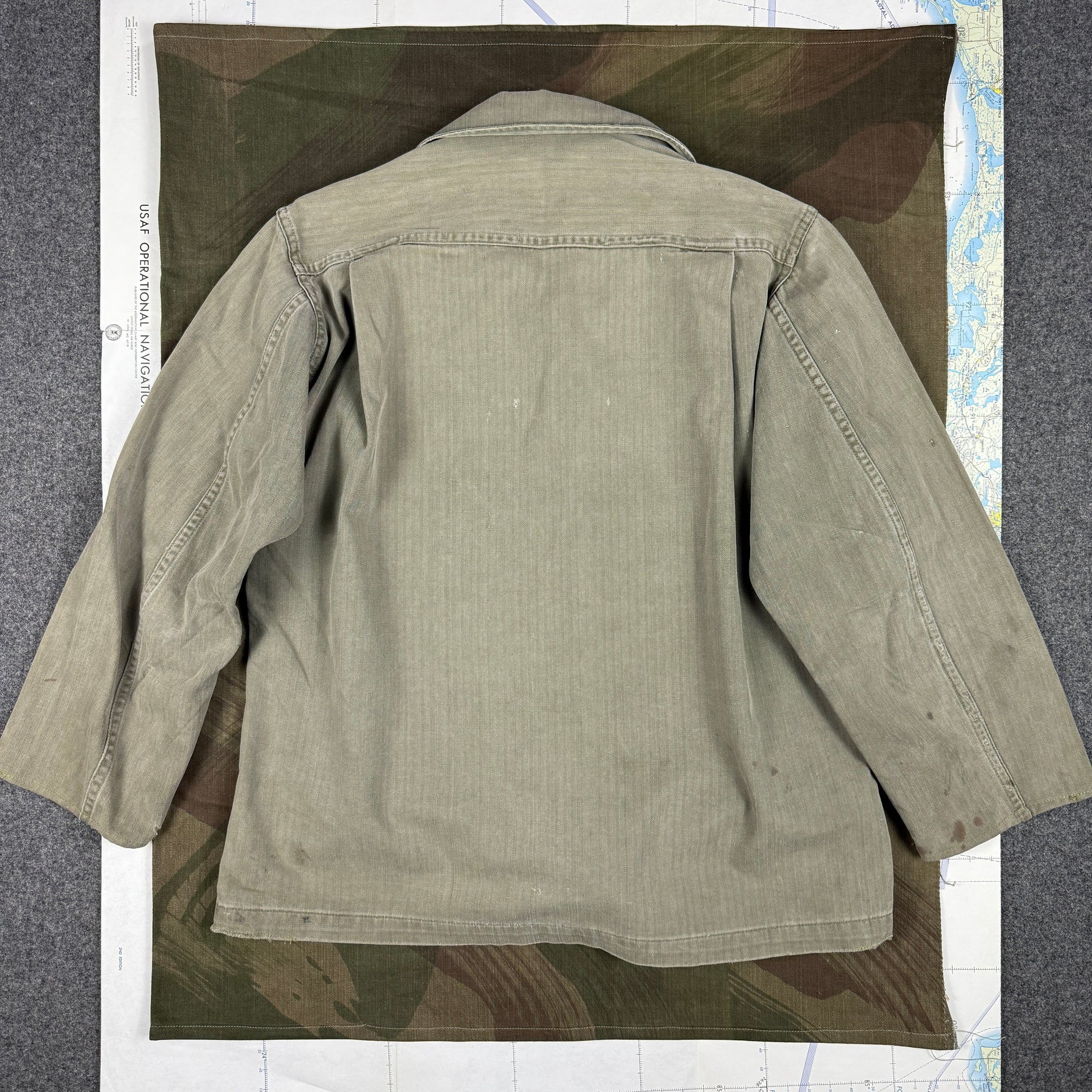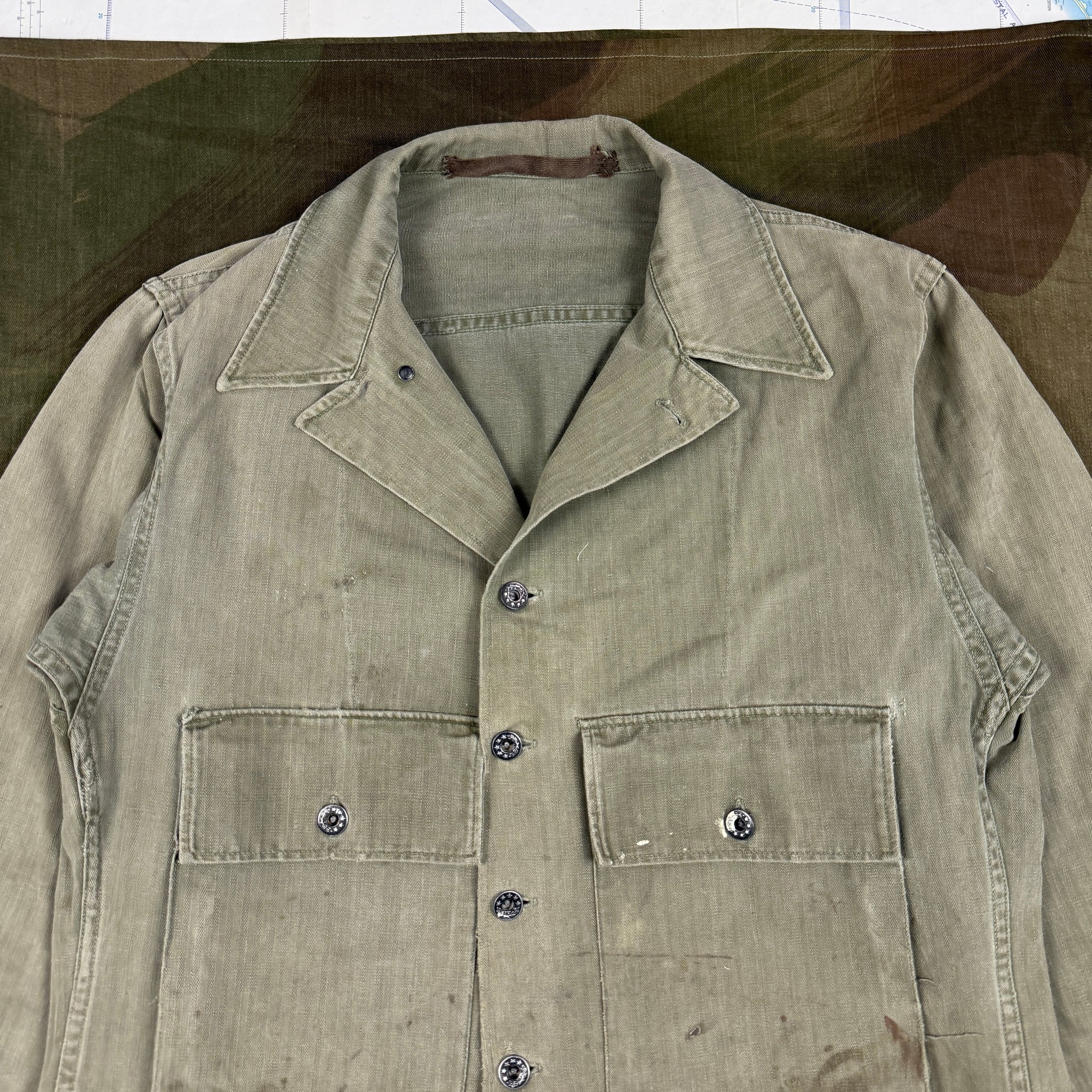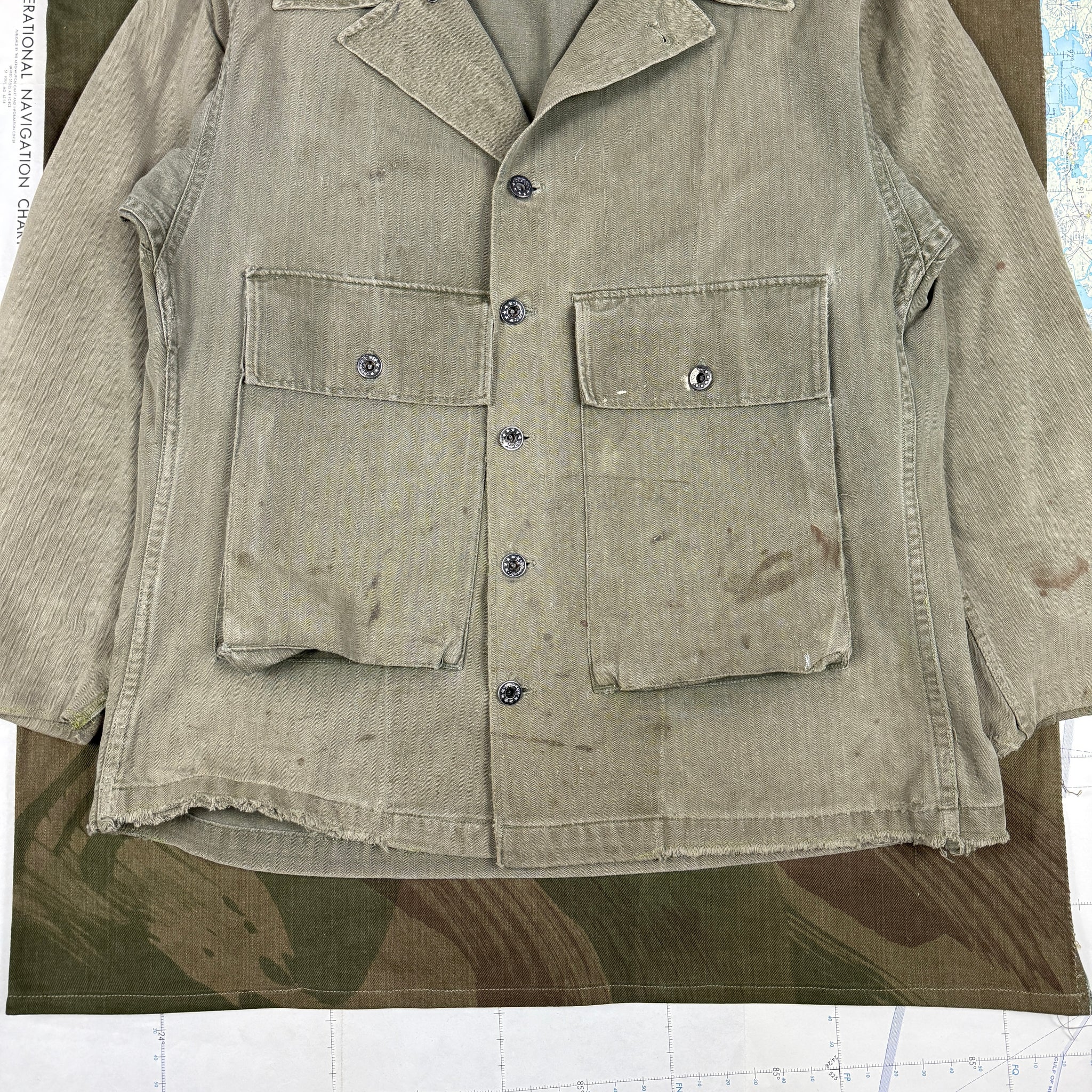 So the story goes (and I could be wrong here), these hbt shirts were made in limited numbers for Navy personal serving in combat, Seabee Engineers or Medical Corpsmen etc. Whilst very similar to their army counterparts, these feature a pocket that sits much lower, almost over the belly, the classic USN wreath donut buttons, and a pleated back. It was also missing the gasflap that is commonly removed on army examples.