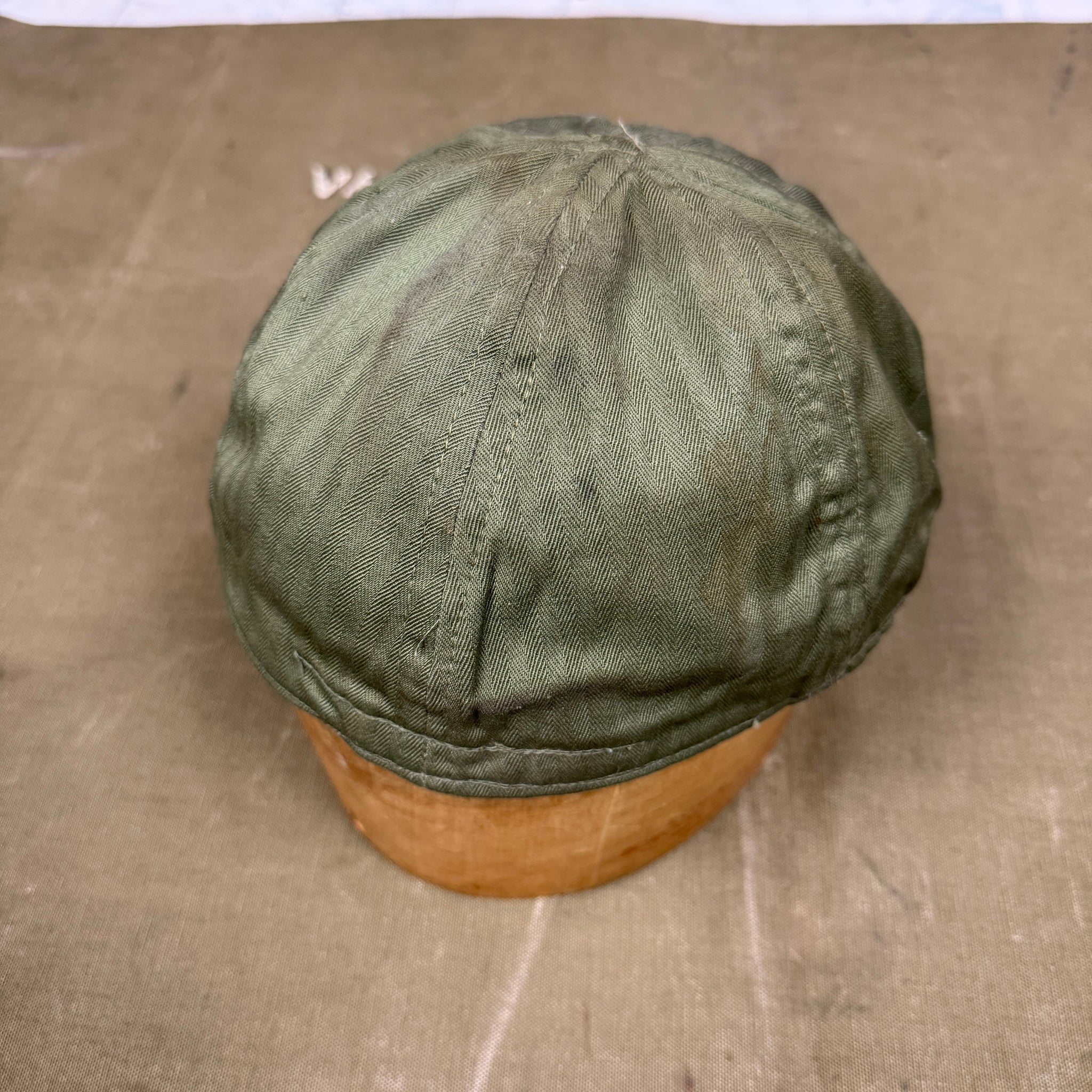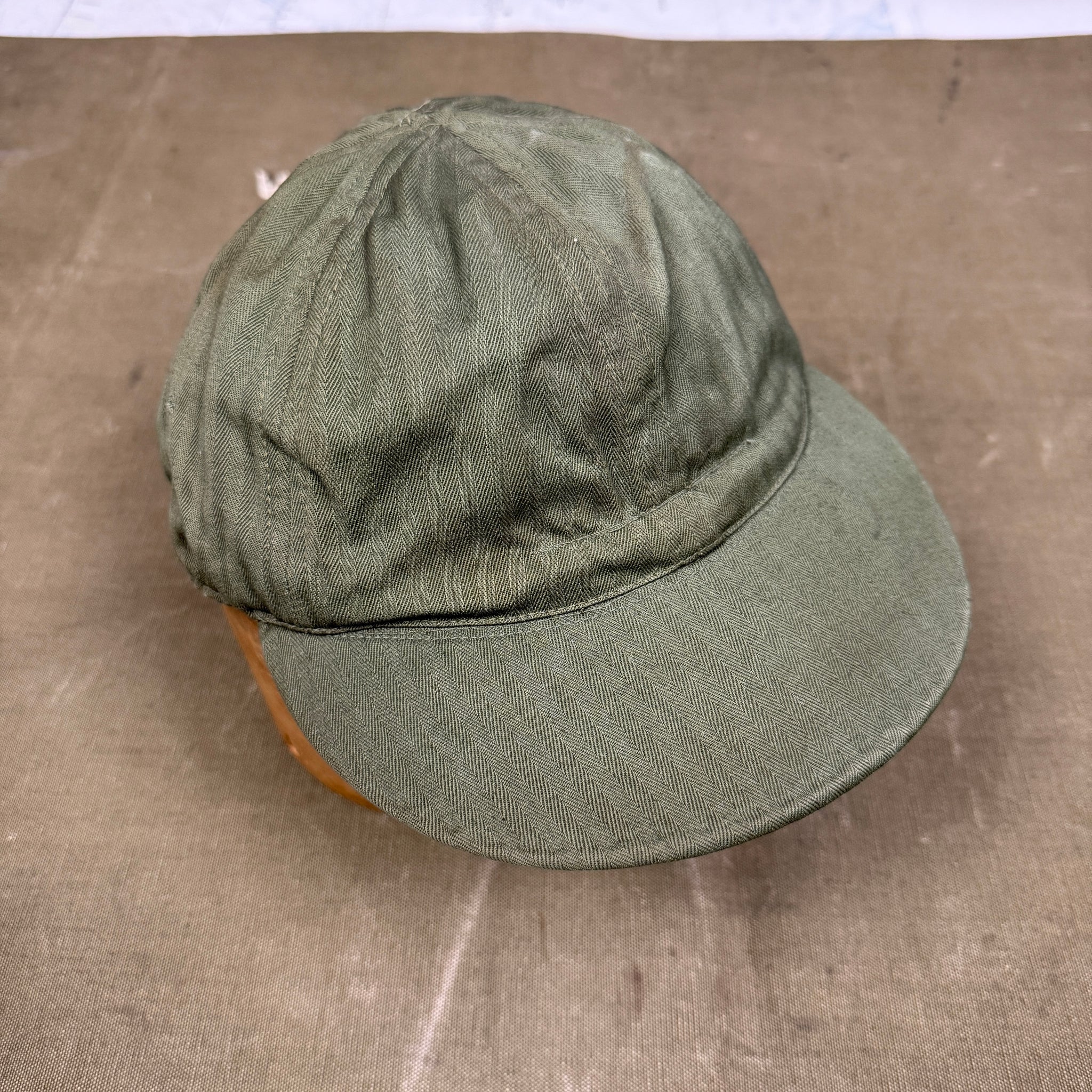 By 1943 the US Navy had redeveloped a lot of its service clothing, particularly for those who would be serving with ground combat units. The new, more appropriately coloured green and khaki uniforms would have a N reference number, N-1, N-2 and N-3. Issued as part of a four piece utility uniform, along with a shirt, trousers and jacket, the N-3 utility cap would be made from the same strong HBT material that the army was using, and drew heavily on the USAAF's A-3 mechanic cap. The peak is flexible, allowing it to be worn up or down as was the style at the time, and two loops of fabric on the either side on the central internal seam allow it to be hung from a washing line.