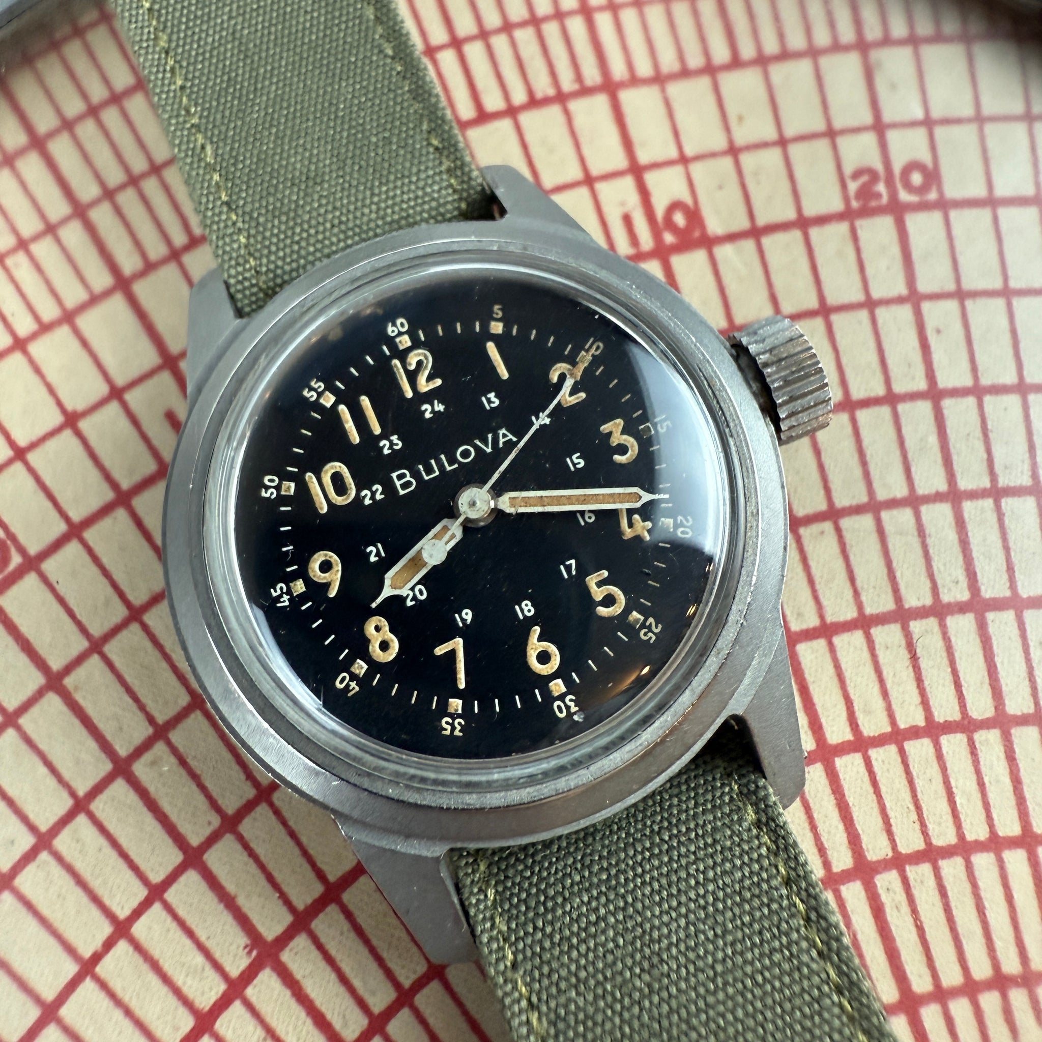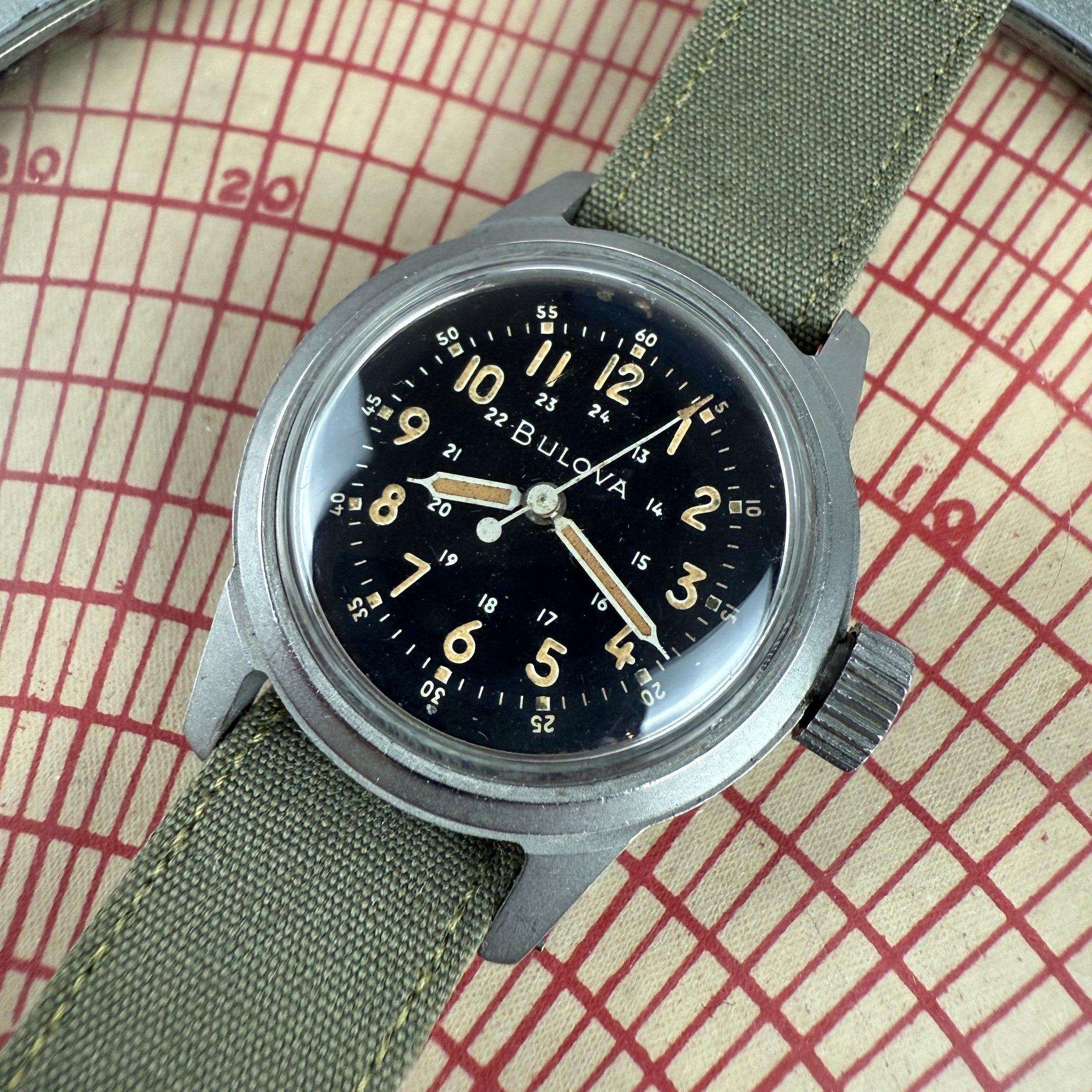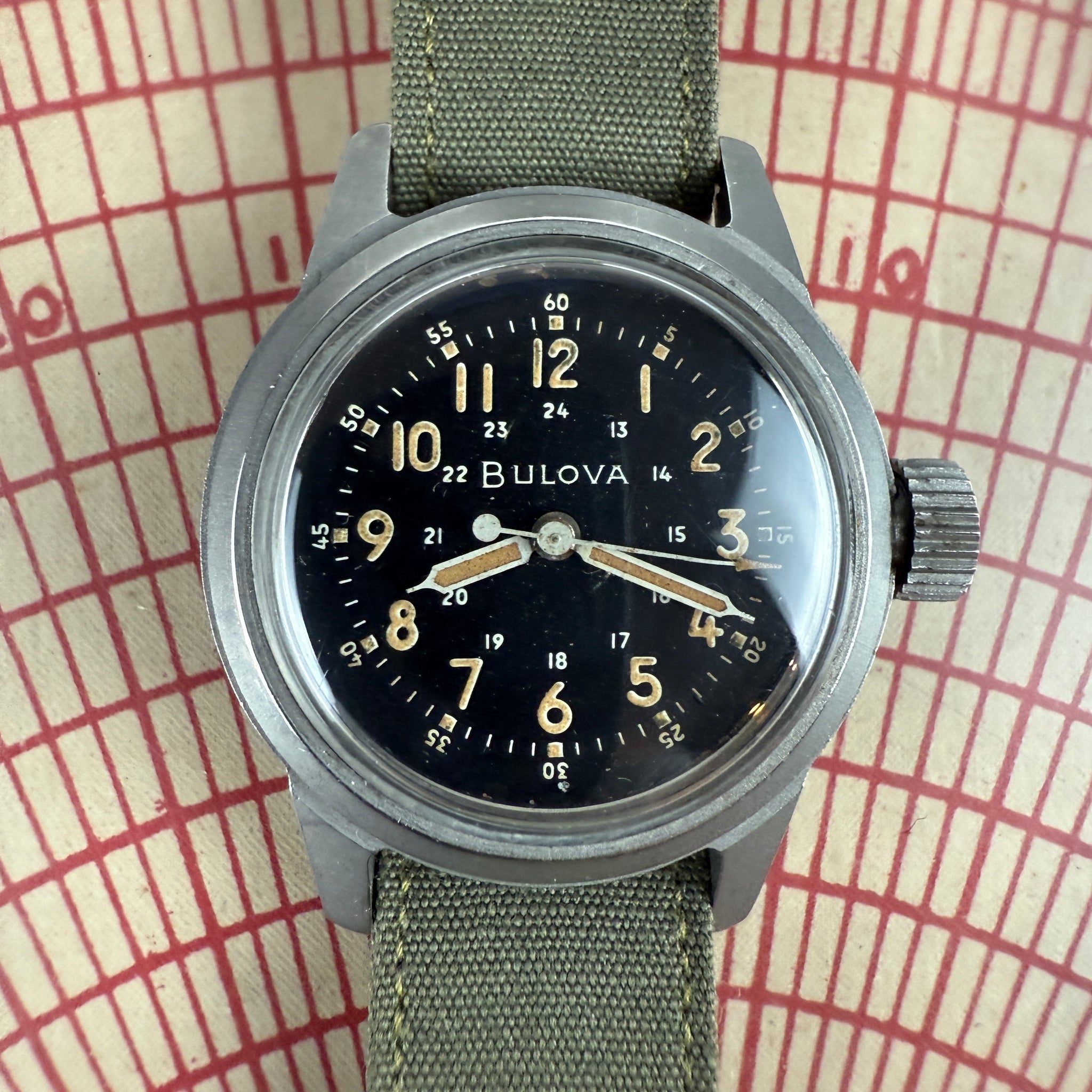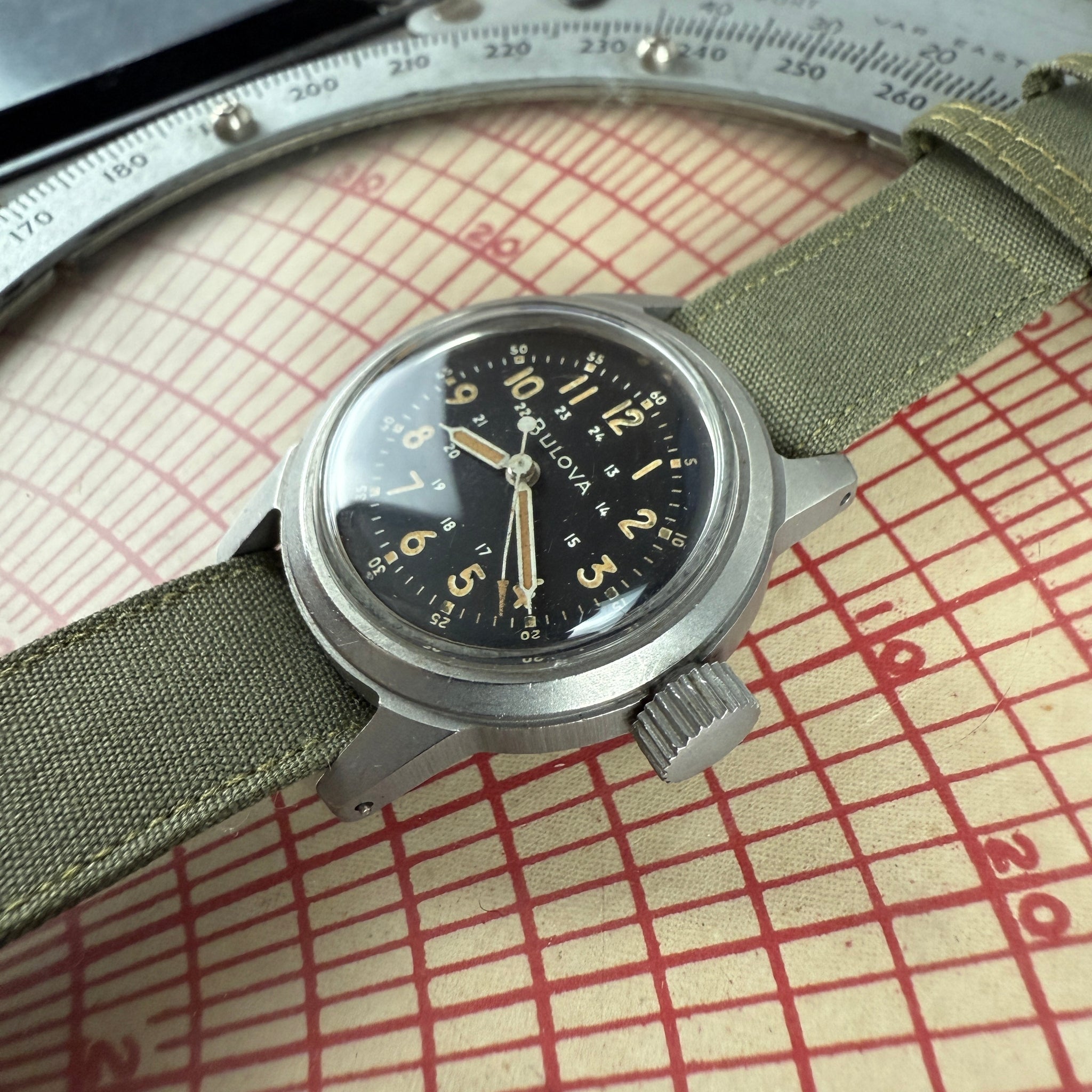 A beautiful example of a Bulova Navigators flight watch, designed in the mid-late 1950s as a replacement for the A17 watch. Comes complete with it's original 10BNCH movement which has been recently serviced and is keeping good time. Comes on a deadstock military strap.