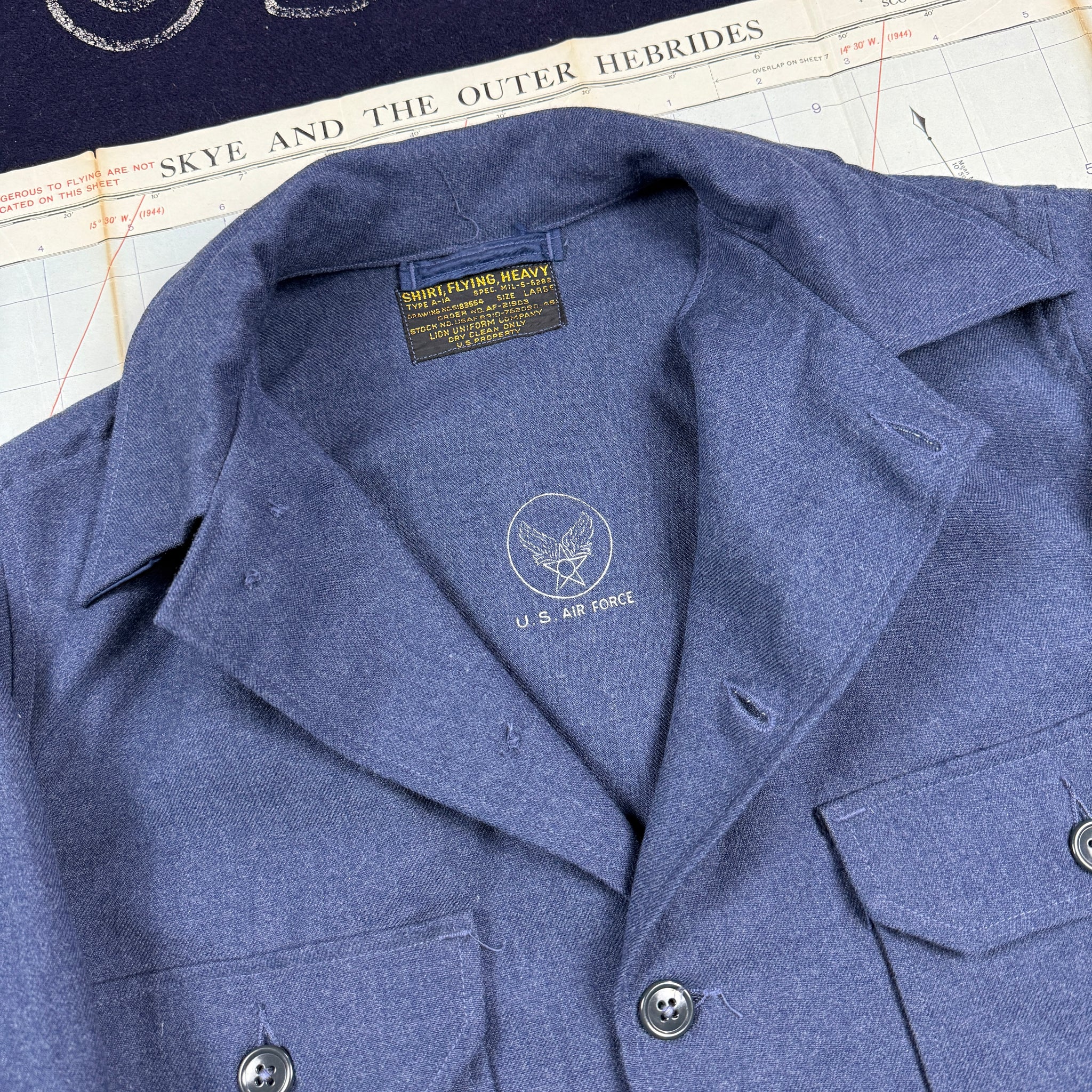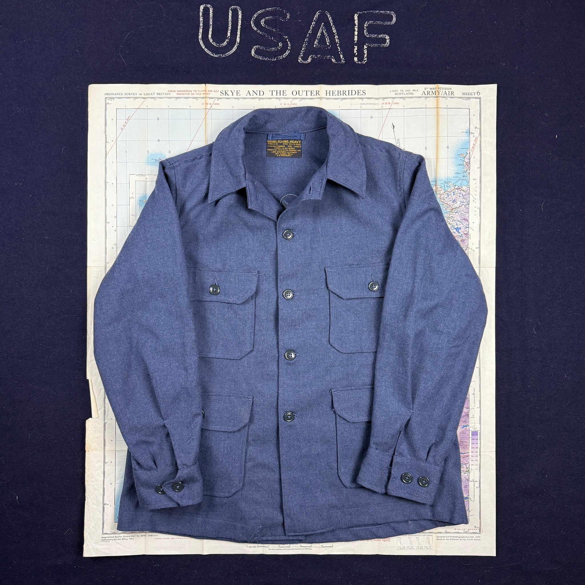 These shirts were initially introduced in the very late-war to early post-war era, initially in an olive green, then changing to blue around 1950. Part of a two piece shirt and pants set, there were designed to be worn as an additional layer of insulation under a heavy flying suit for extreme cold weather flying duties. These typically have been heavily, worn, washed and shrunk to finding a clean one is a treat.