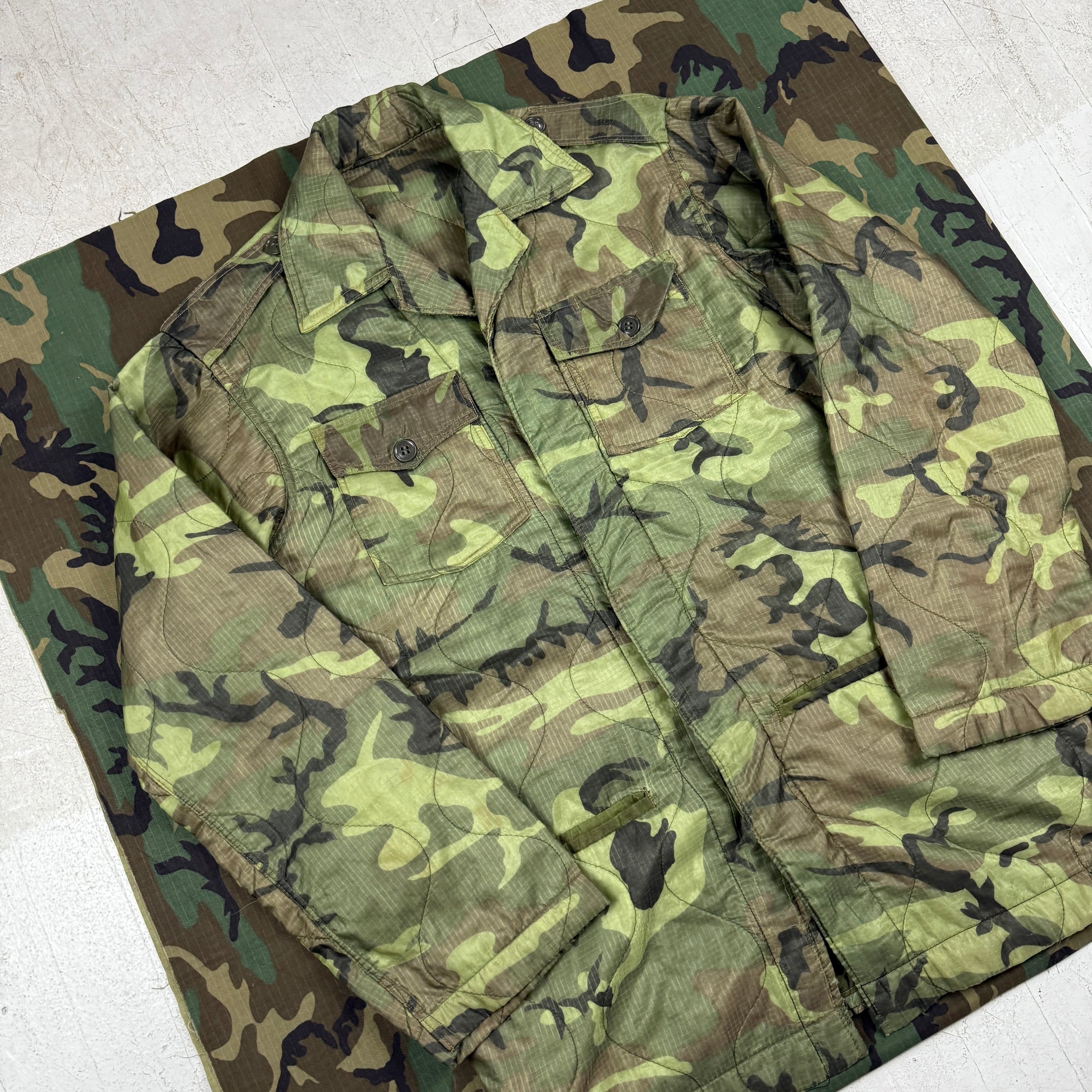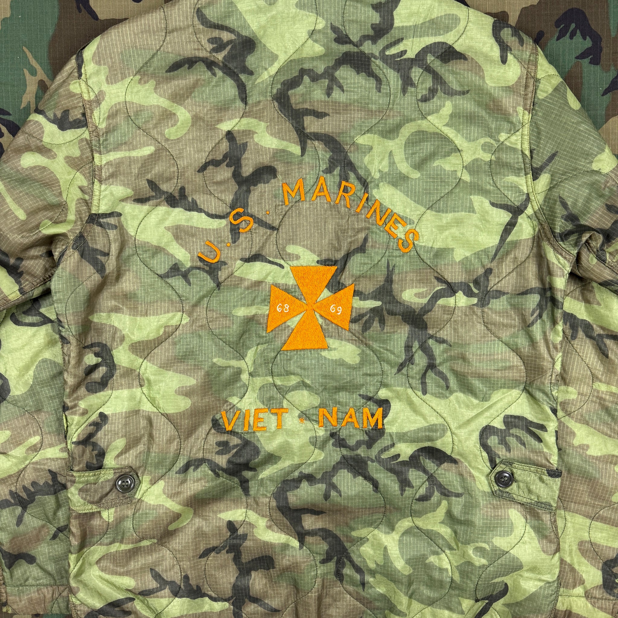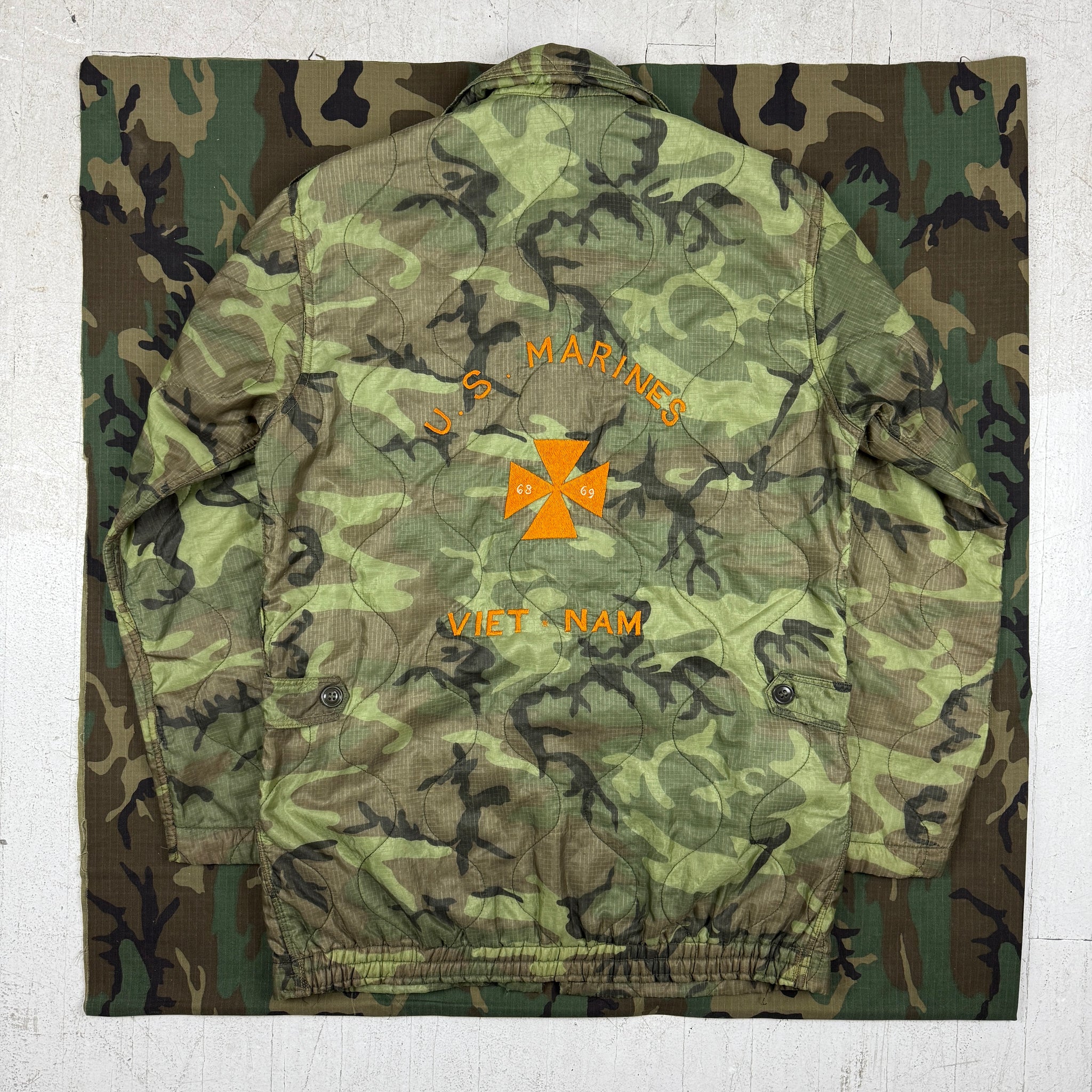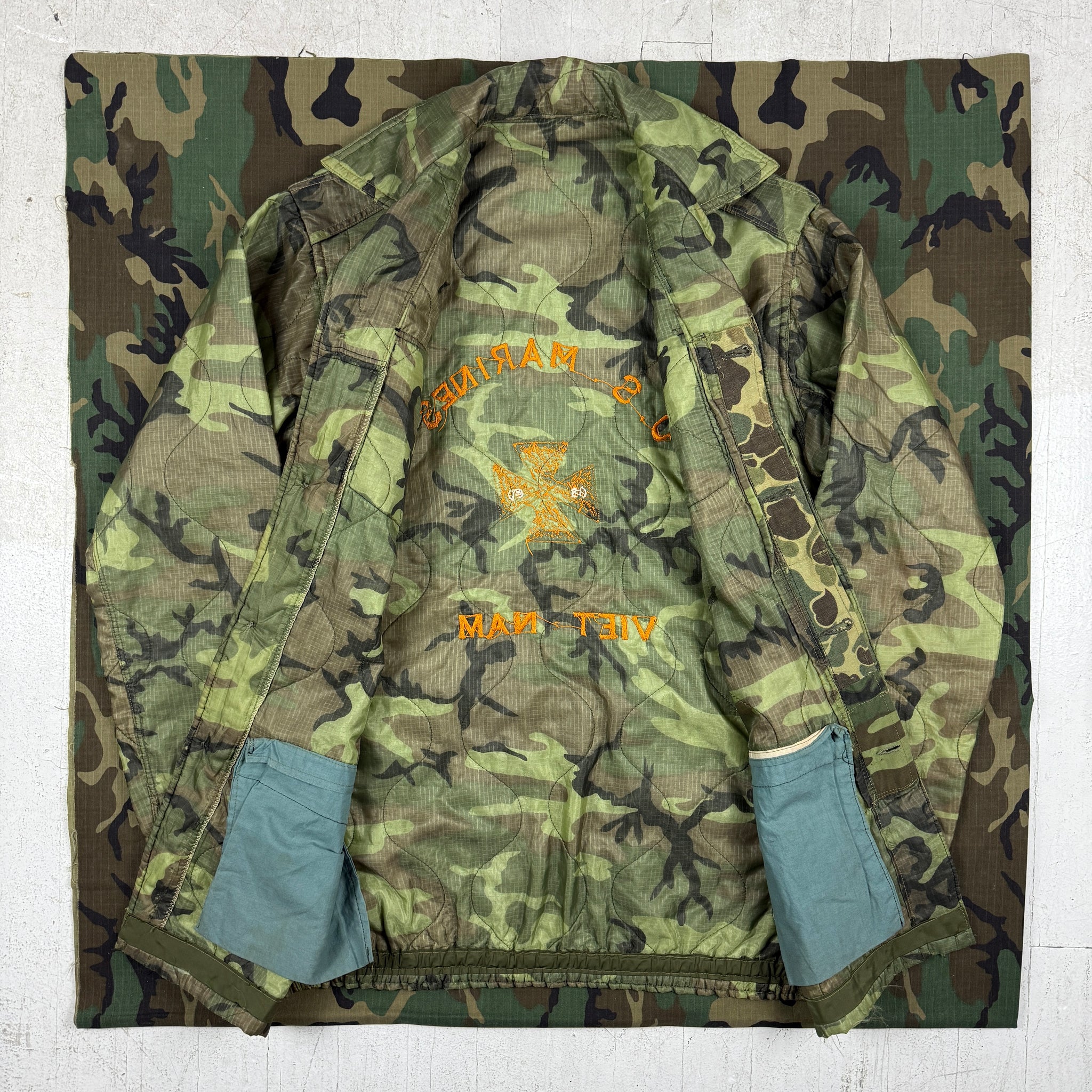 A classic piece of Vietnam vintage clothing. These souvenir jackets were made locally and sold in small shops to US servicemen in the area. This example is made from US Army ponch liners that have been skillfully tailored into lightwight jackets with a fine camo silk shell with embroidery to the back. Rather cooly, this has a button placket made from both beogam and poplin erdl.