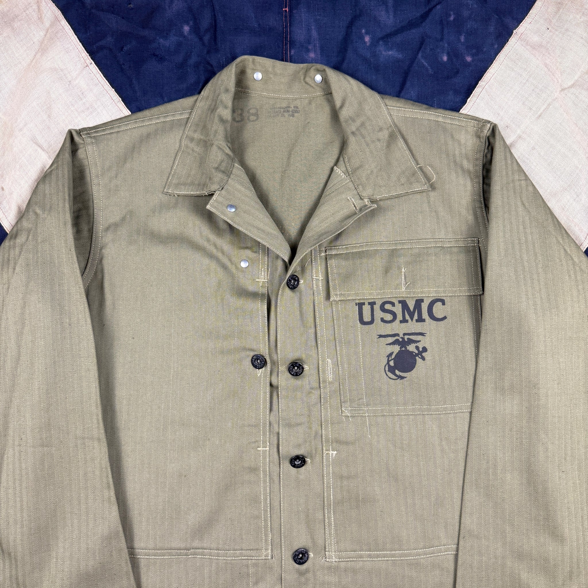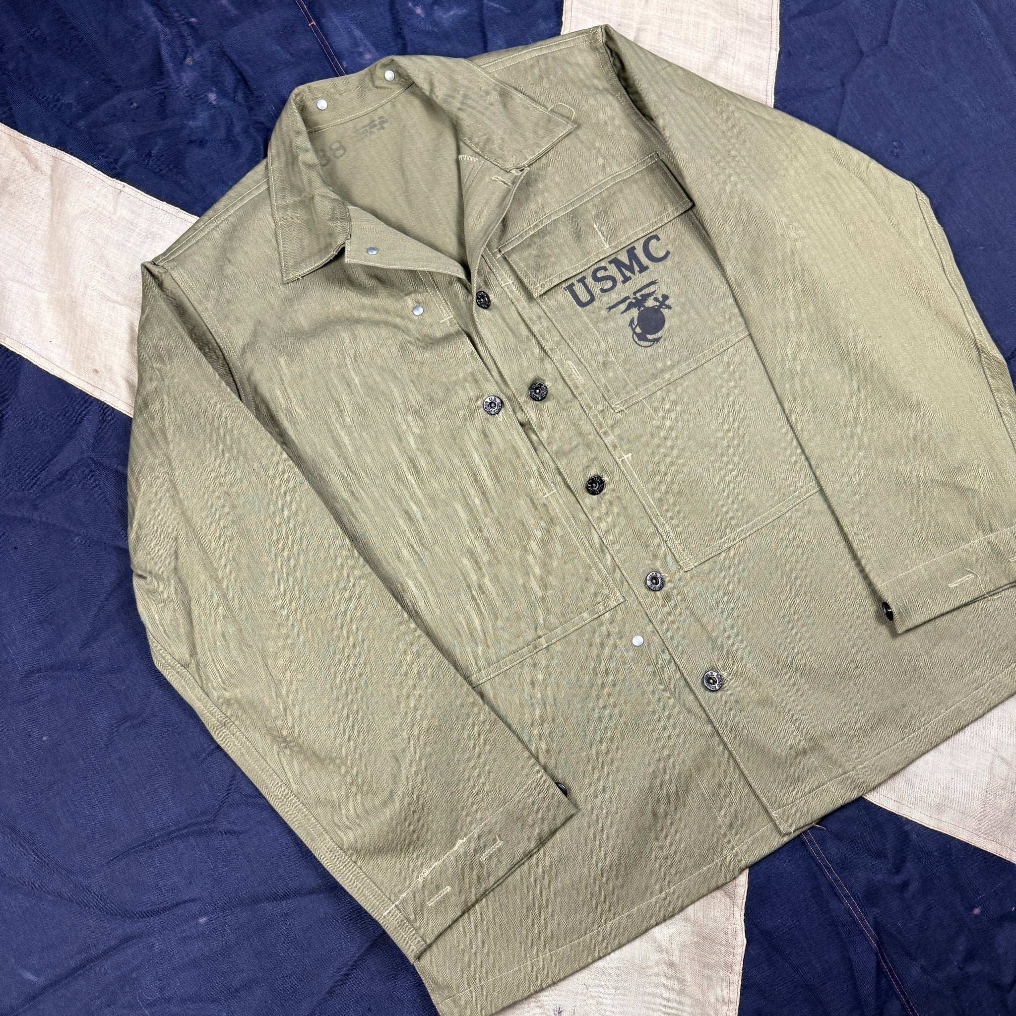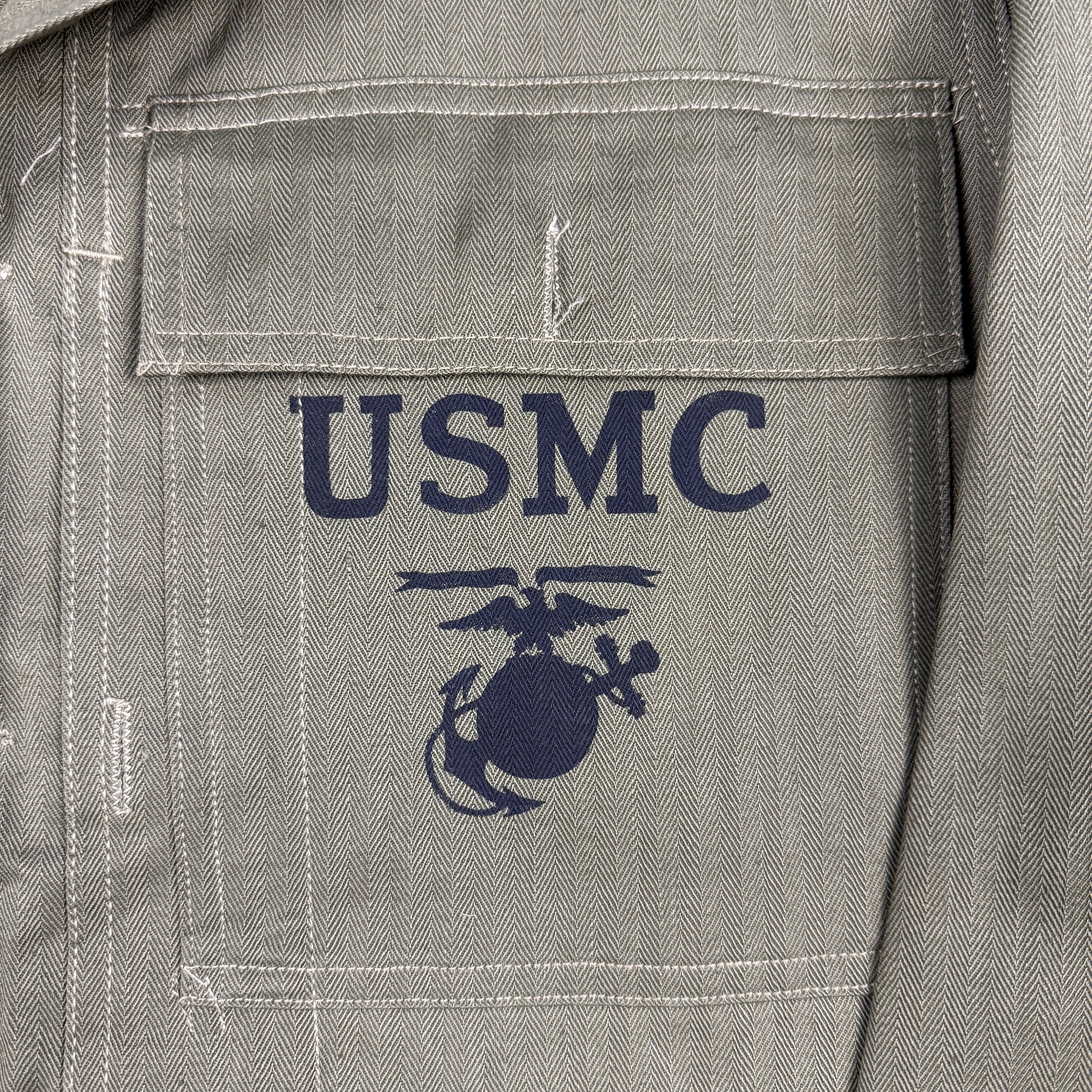 Made of classic HBT material, the P44 fatigue set was developed and introduced toward the tail end of the war as a result of the experience gained during the Marines' hard slog across the pacific. As they were Introduced so late, research seems to suggest they saw limited use in 1945 in Okinawa, but would be used extensively in Korea and by the French in Indochina.