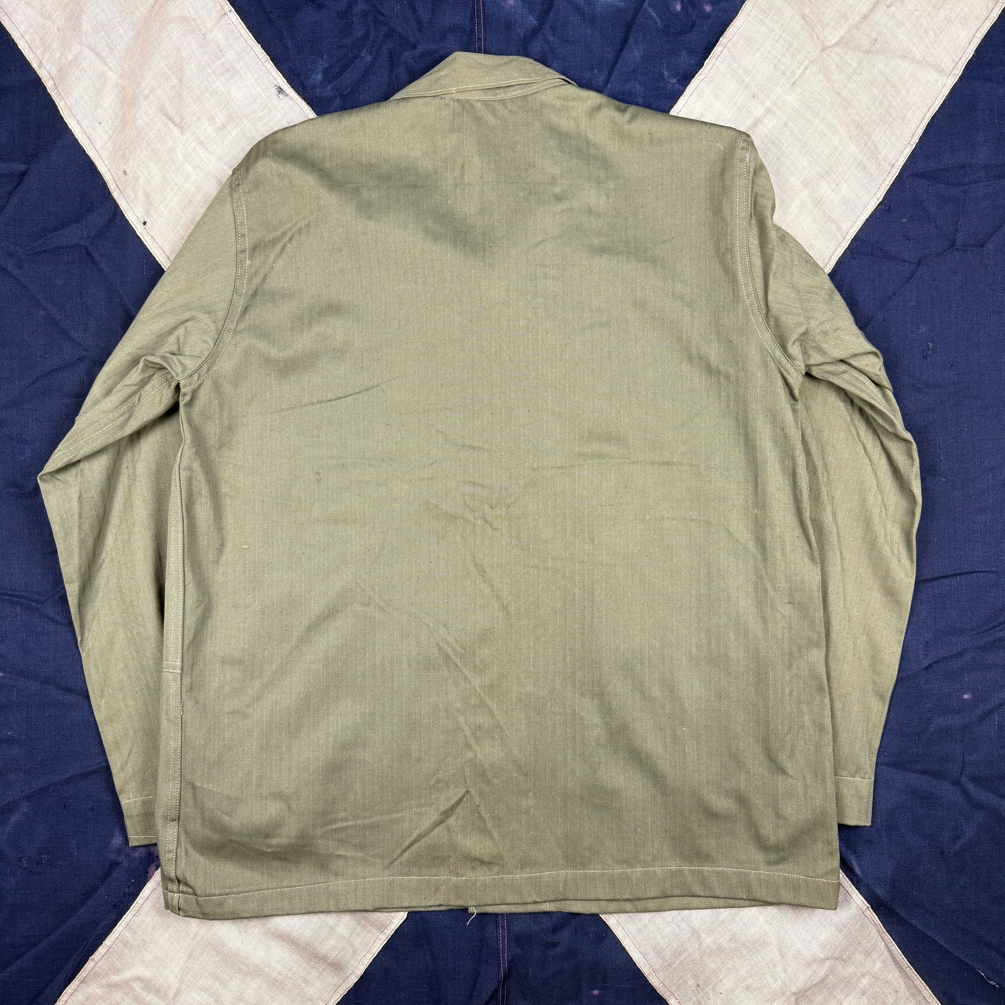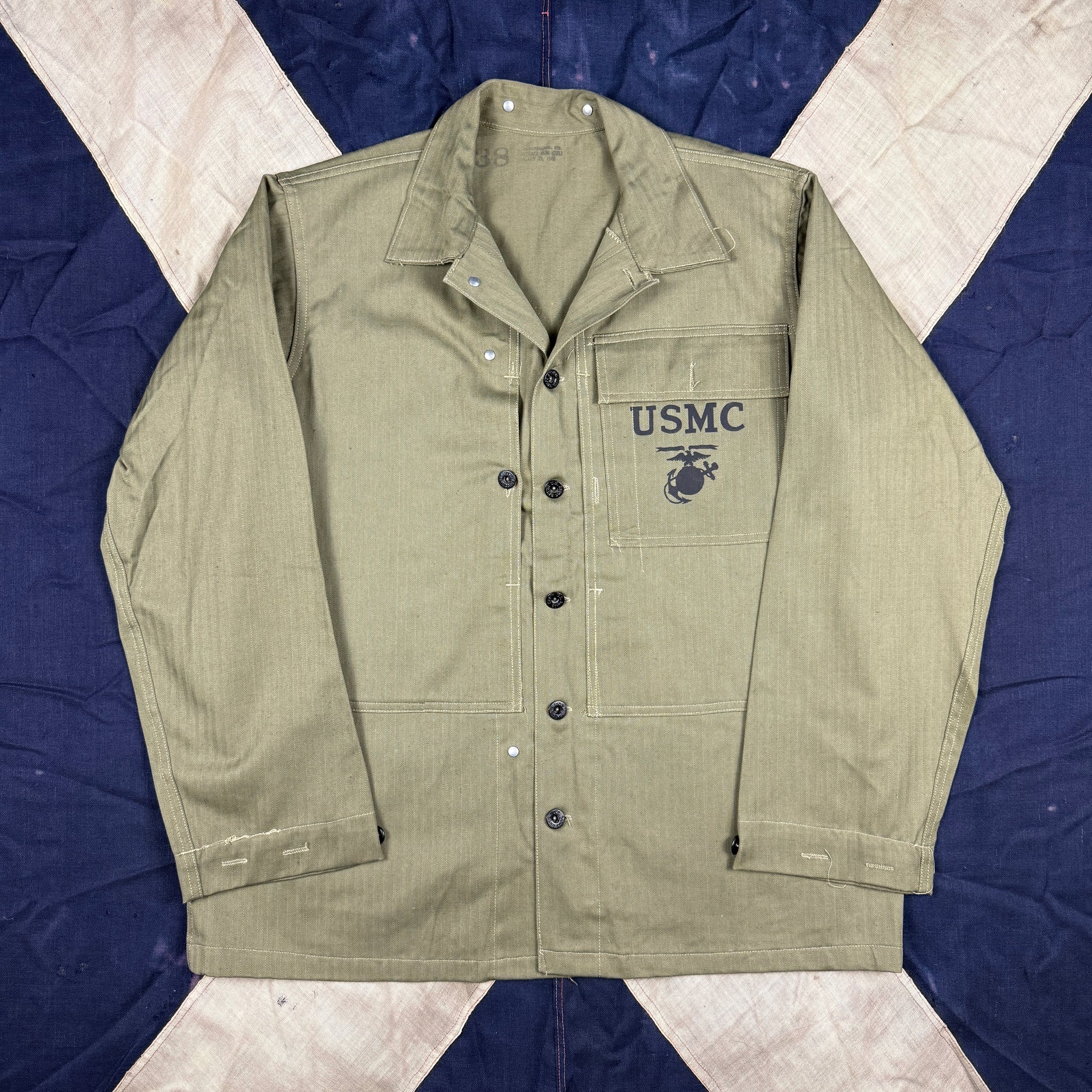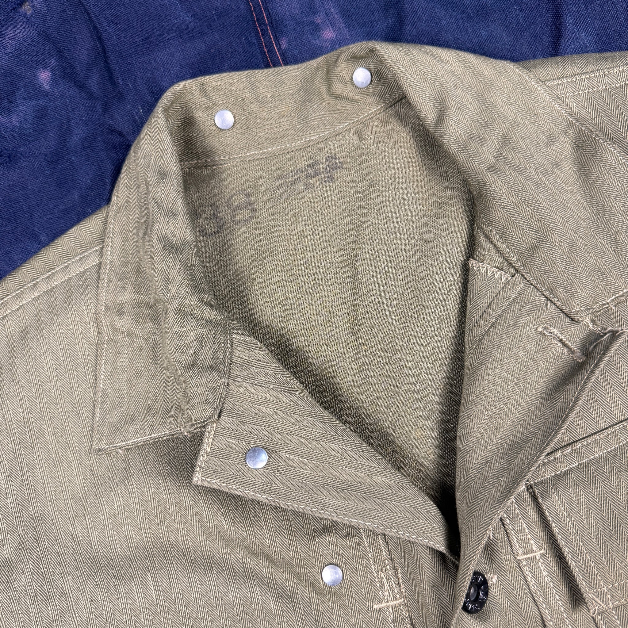 Made of classic HBT material, the P44 fatigue set was developed and introduced toward the tail end of the war as a result of the experience gained during the Marines' hard slog across the pacific. As they were Introduced so late, research seems to suggest they saw limited use in 1945 in Okinawa, but would be used extensively in Korea and by the French in Indochina.