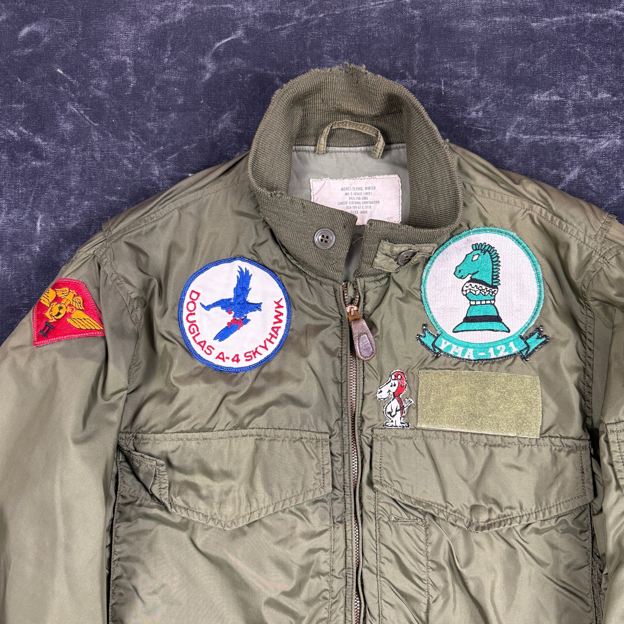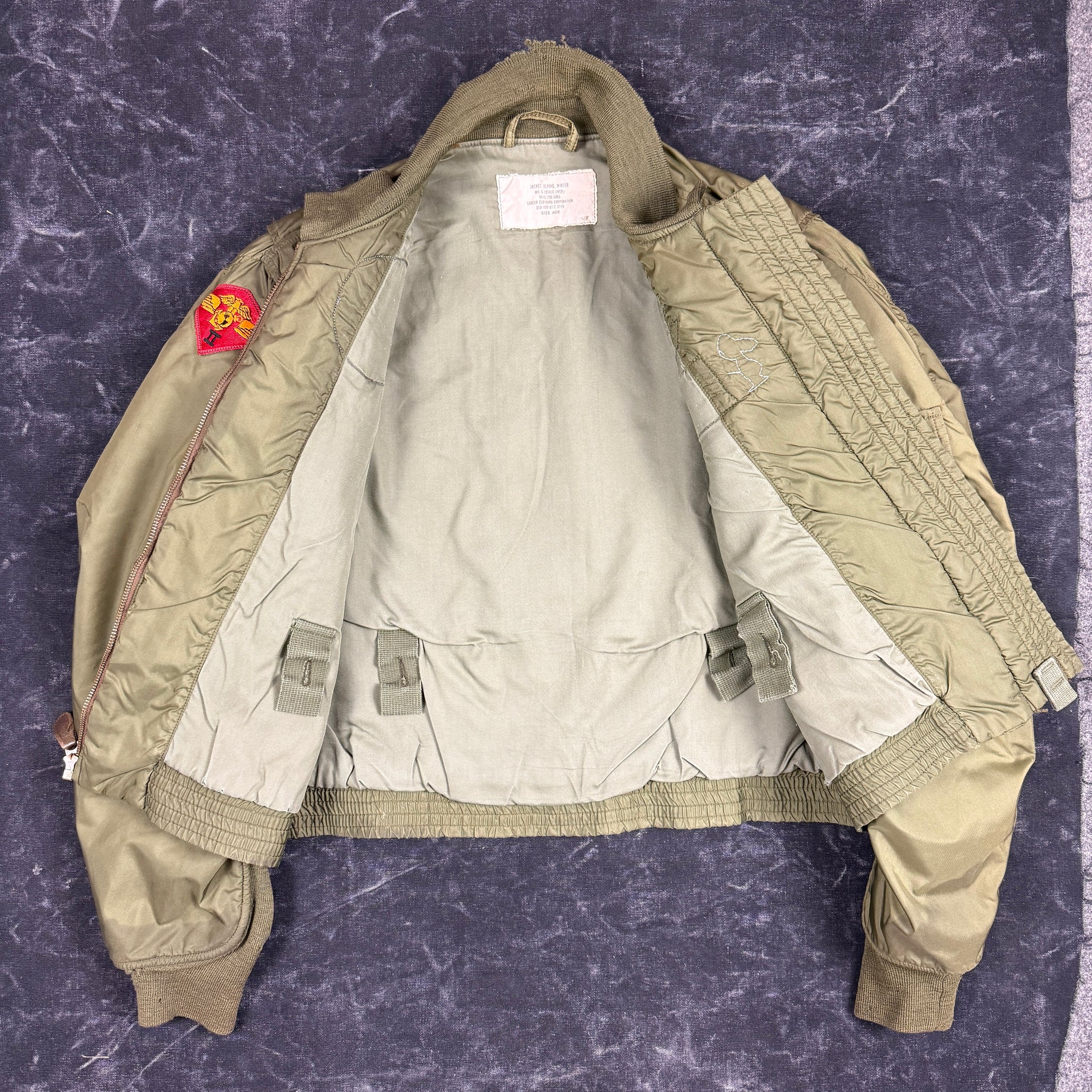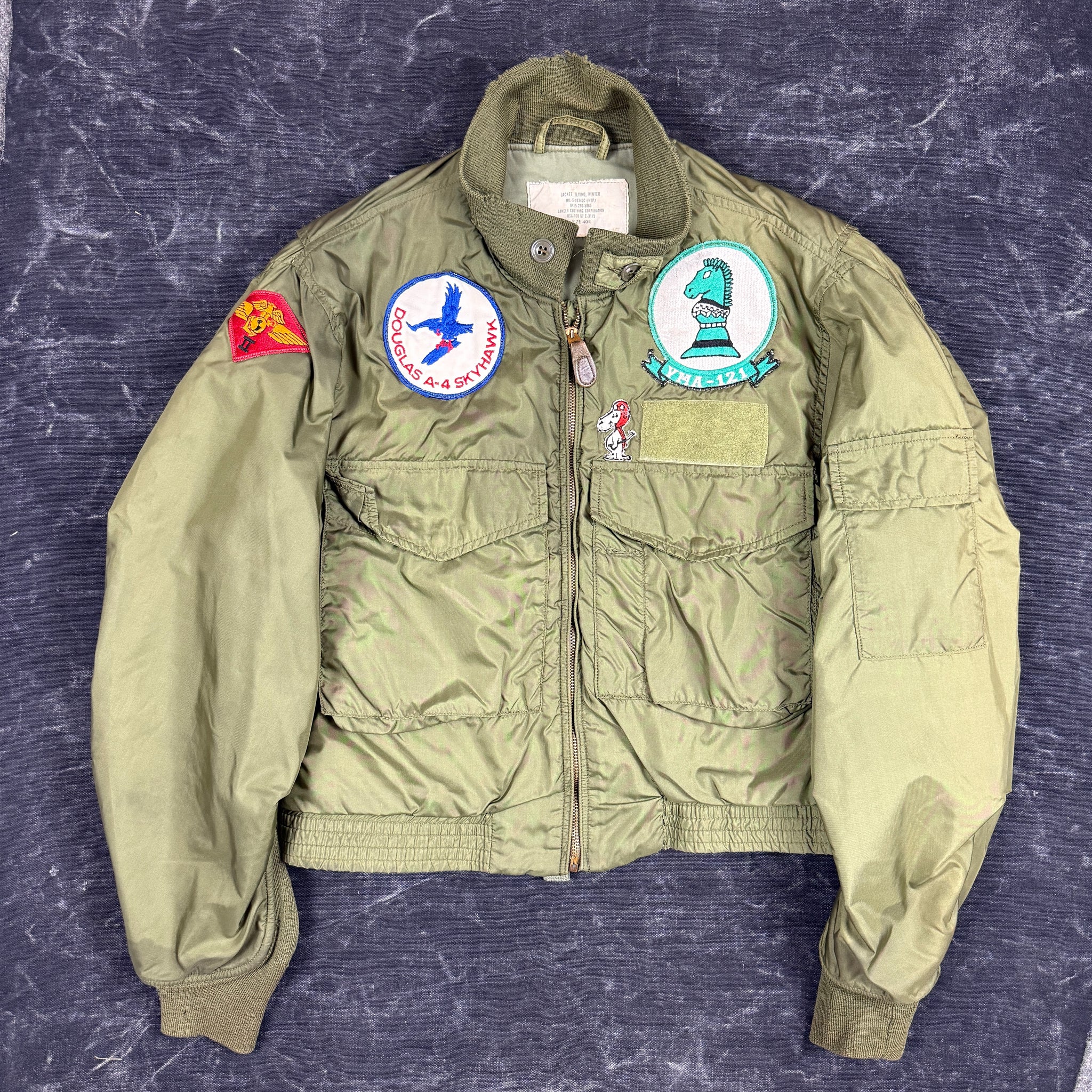 The WEP Jacket was first ordered in the very late 1950s, infact before the Bureau of Aeronautics (AER) became the Bureau of Weapons (WEP) from which the WEP jacket takes its name. This example dates to 1967, and features patches that show it belonged to a USMC pilot flying Skyhawks.