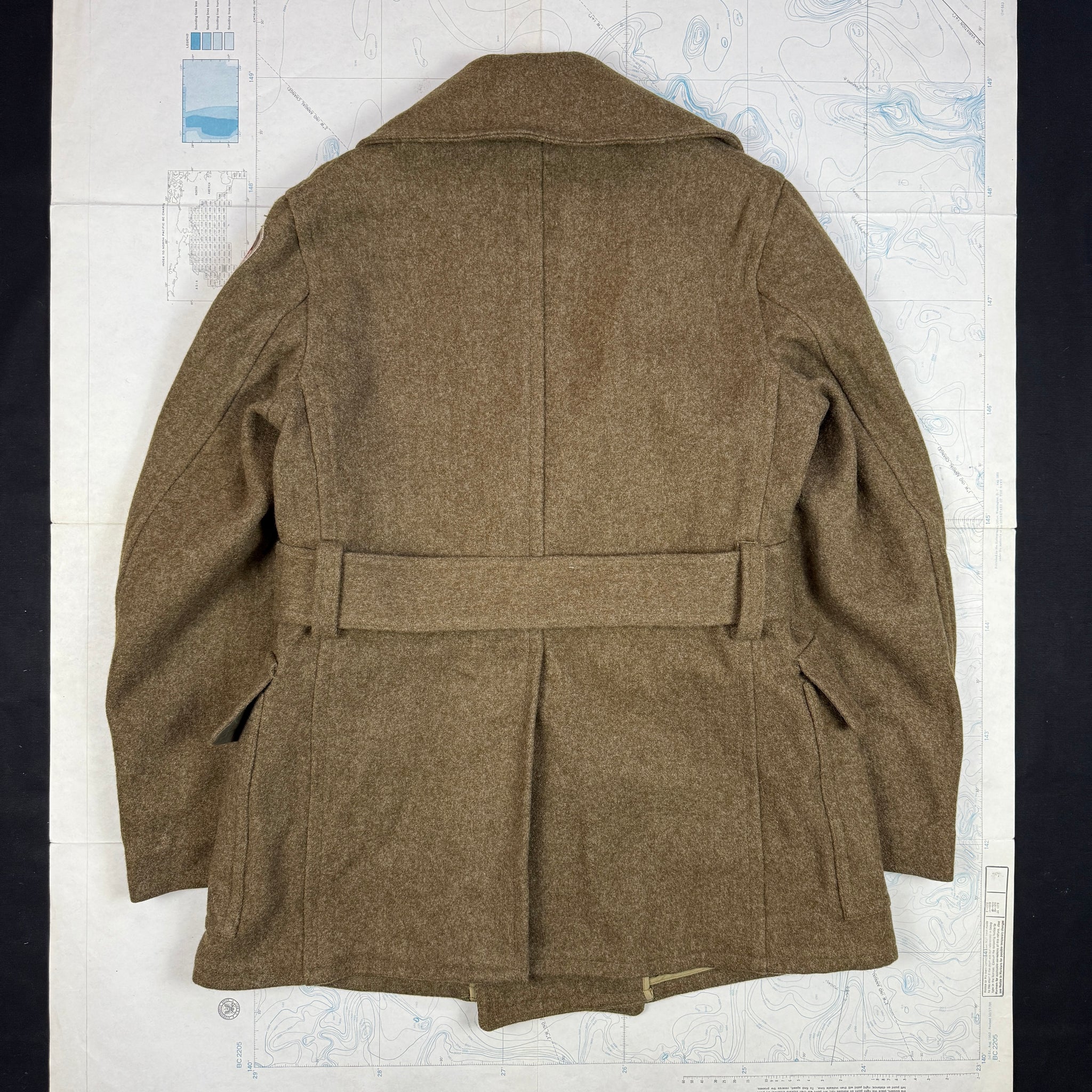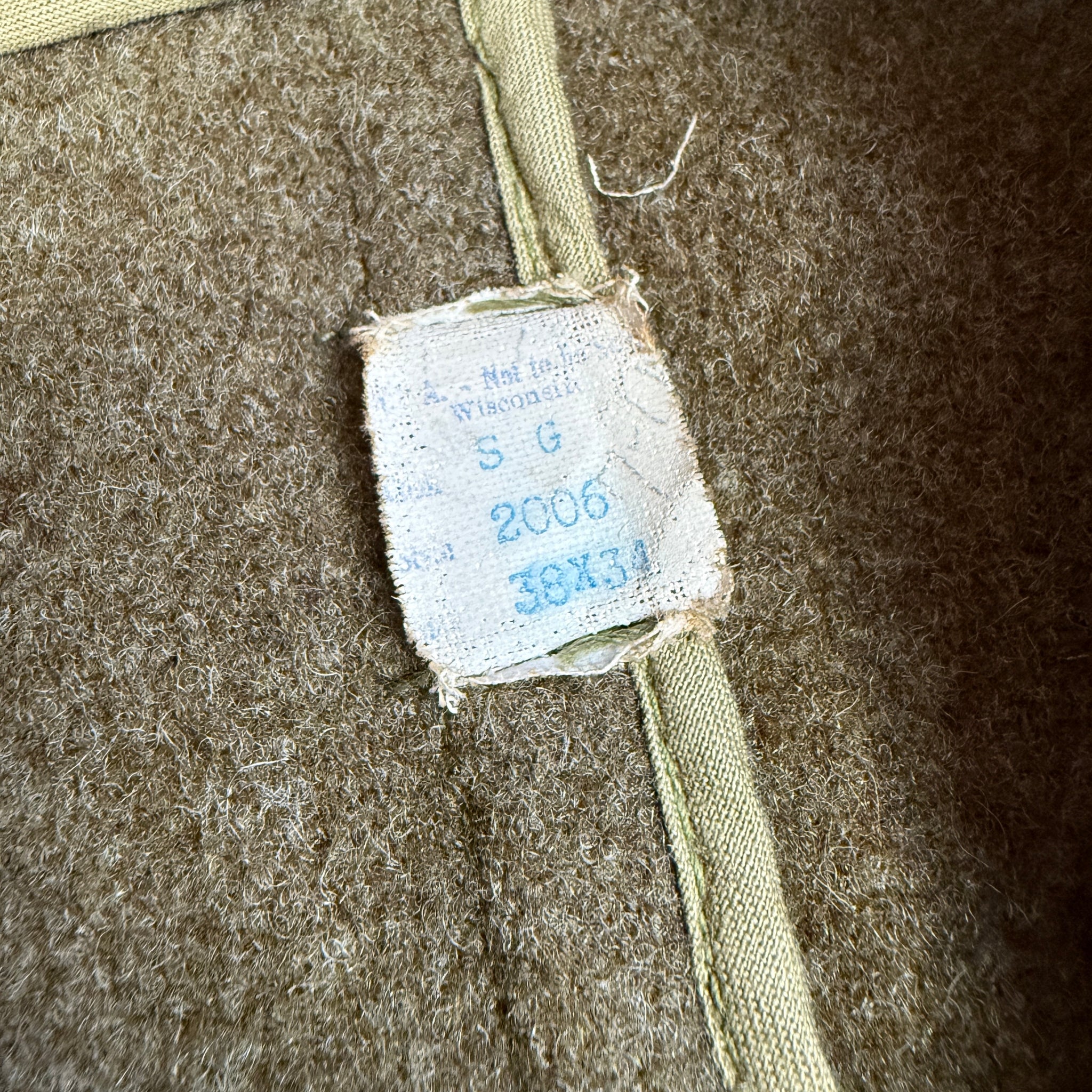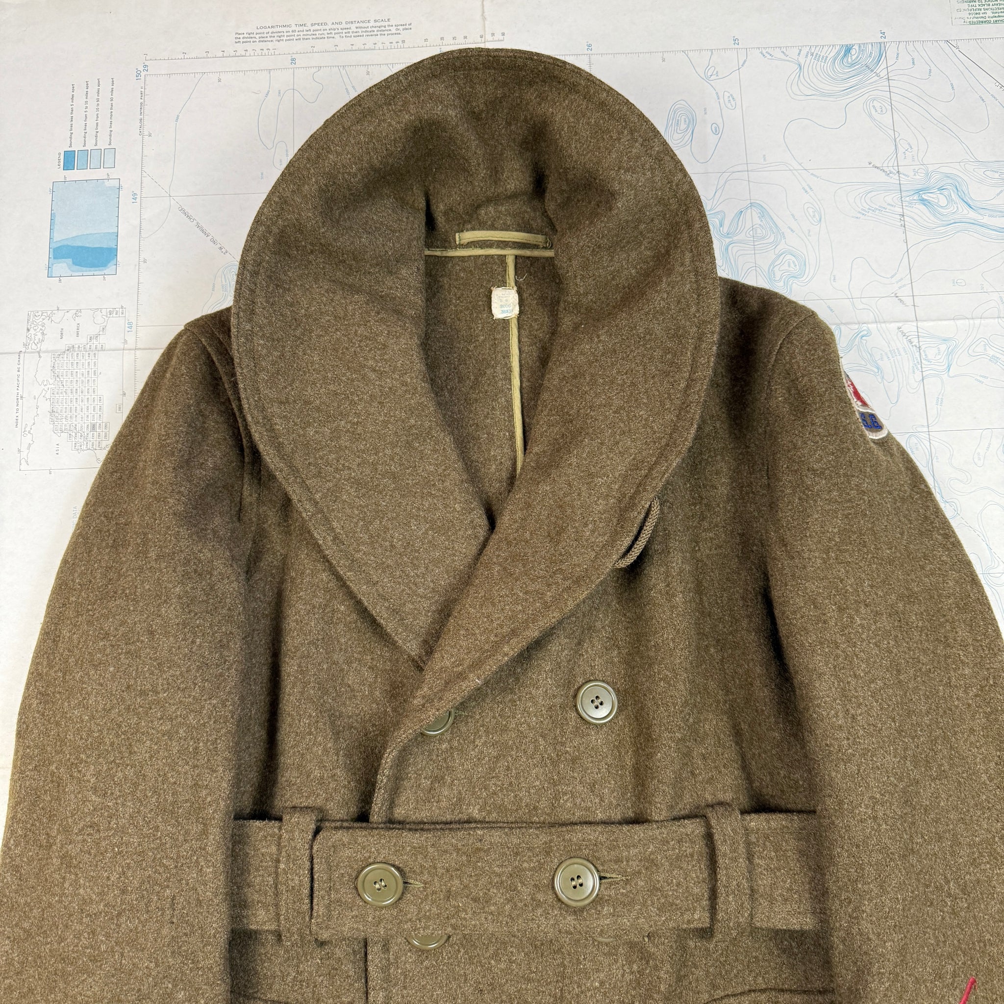 Something of an unusual jacket. Visually very similar to the 1930s Army Mackinaw, this one seems to have been made on a Works Progress Administration (WPA) contract direct for the Wisconsin State Guard. The WPA existed between 1935 and 1943, operating as part of the New Deal in a similar fashion to the CCC. A nice belted wool mackinaw complete with its original WPA oil cloth tag in the neck, WIS SG patch to the shoulder and rank to the cuff.