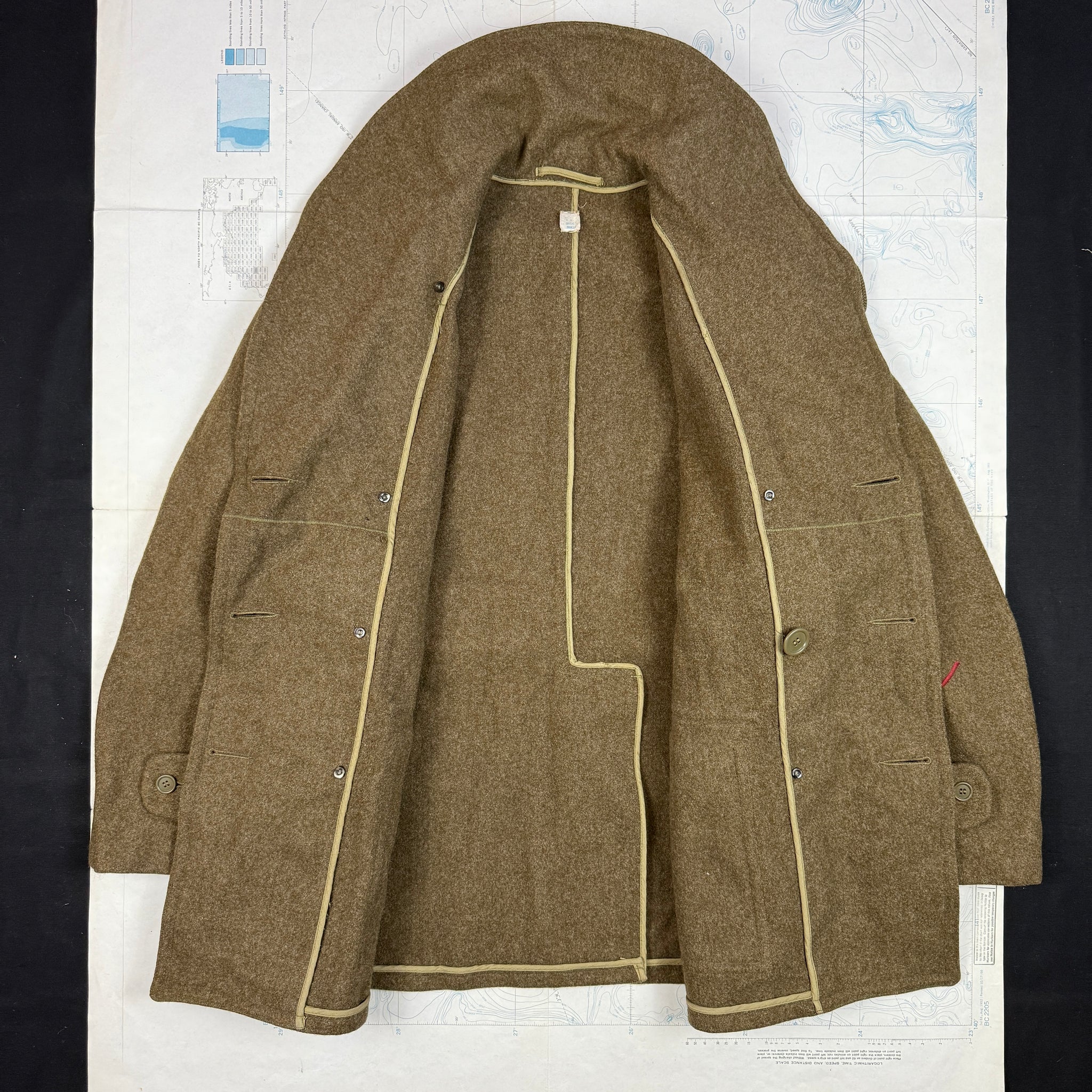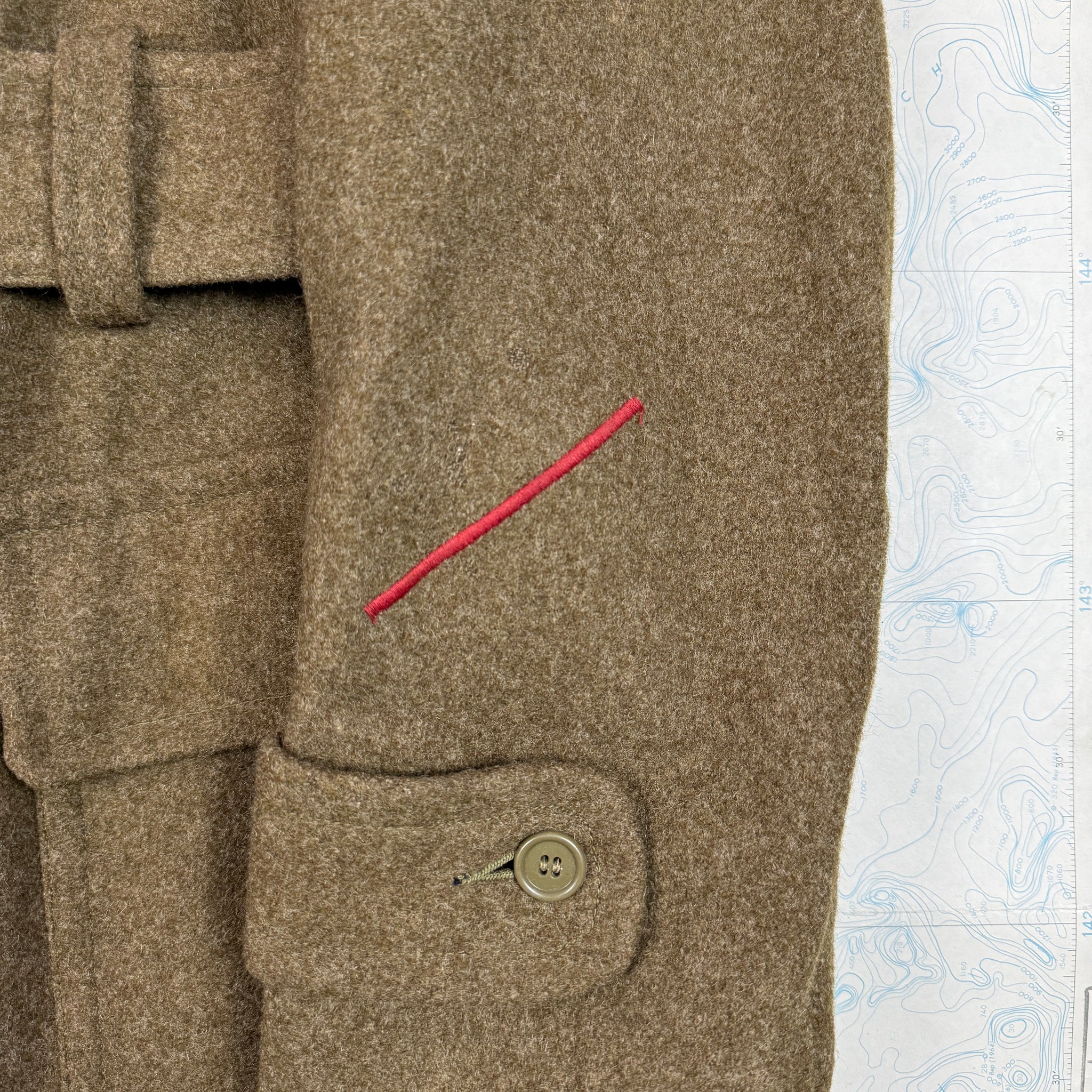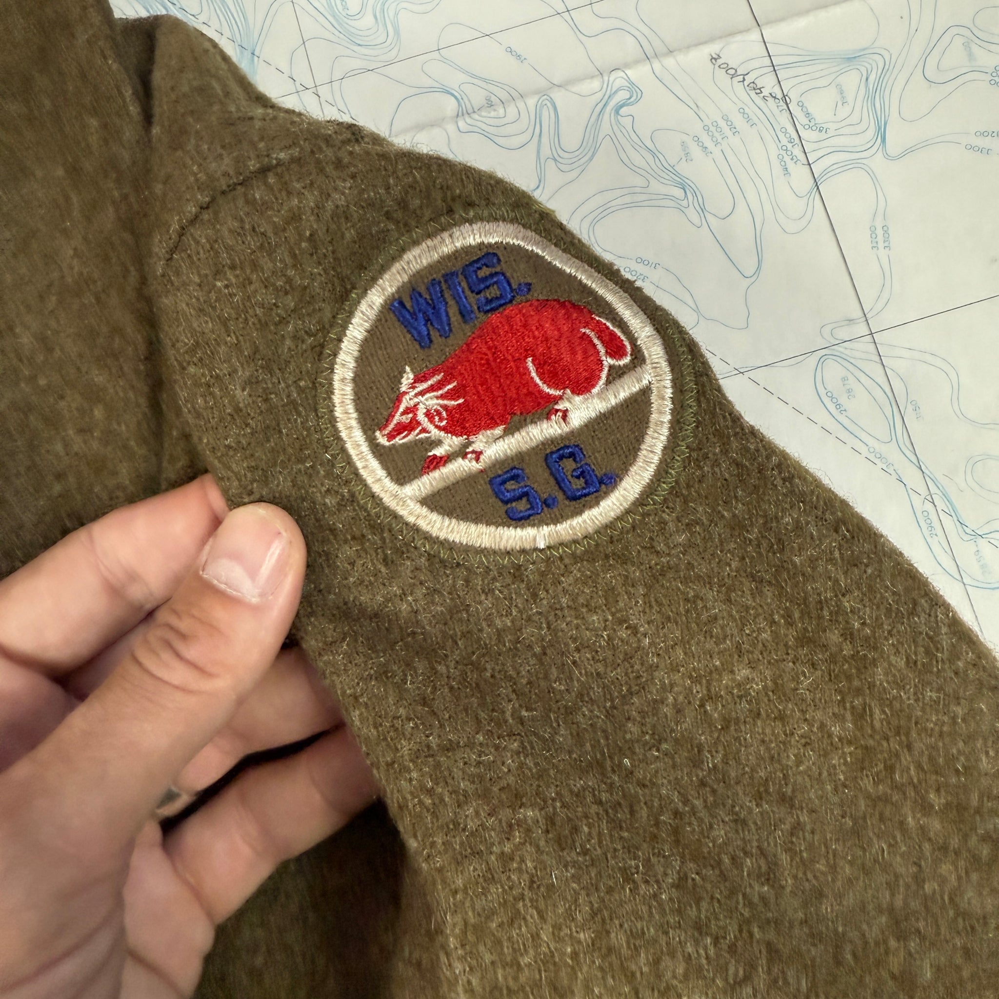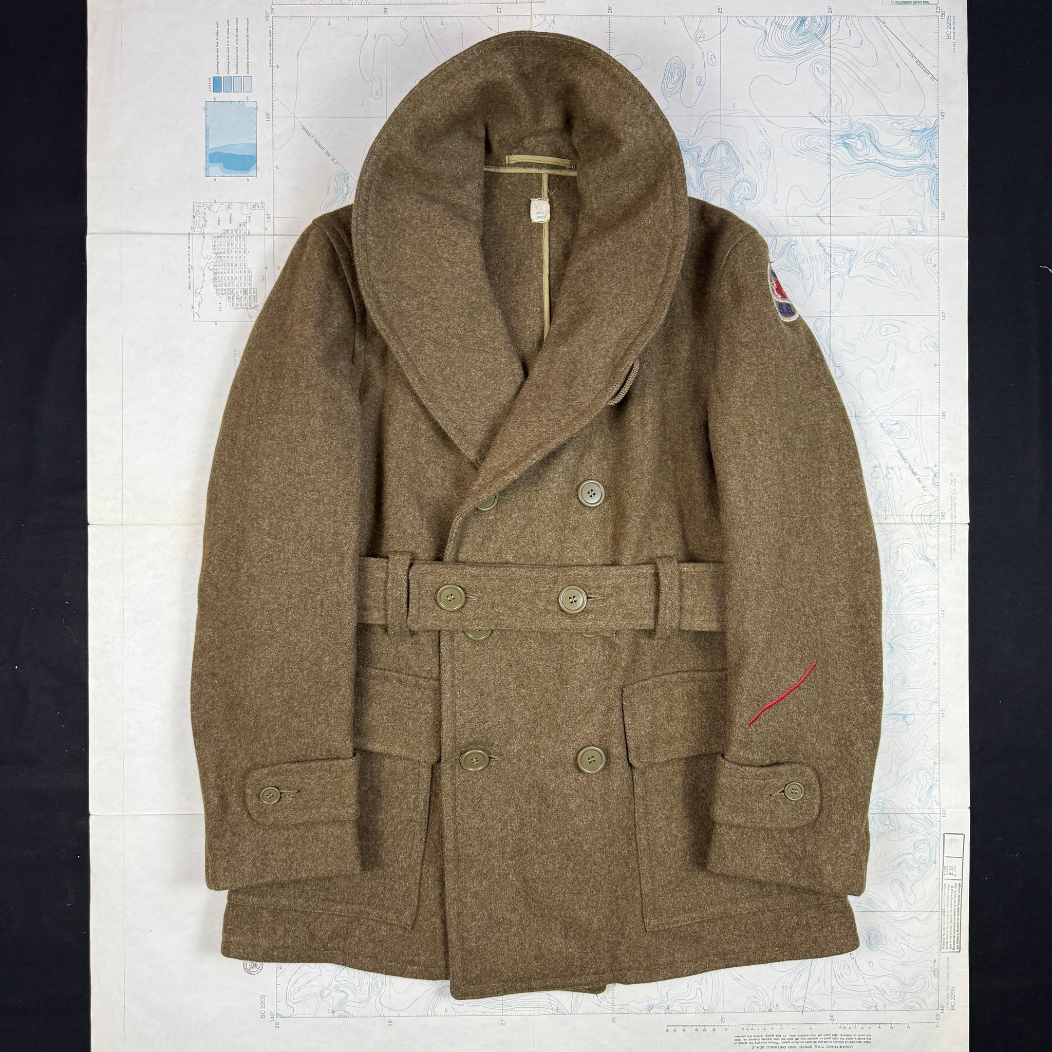 Something of an unusual jacket. Visually very similar to the 1930s Army Mackinaw, this one seems to have been made on a Works Progress Administration (WPA) contract direct for the Wisconsin State Guard. The WPA existed between 1935 and 1943, operating as part of the New Deal in a similar fashion to the CCC. A nice belted wool mackinaw complete with its original WPA oil cloth tag in the neck, WIS SG patch to the shoulder and rank to the cuff.