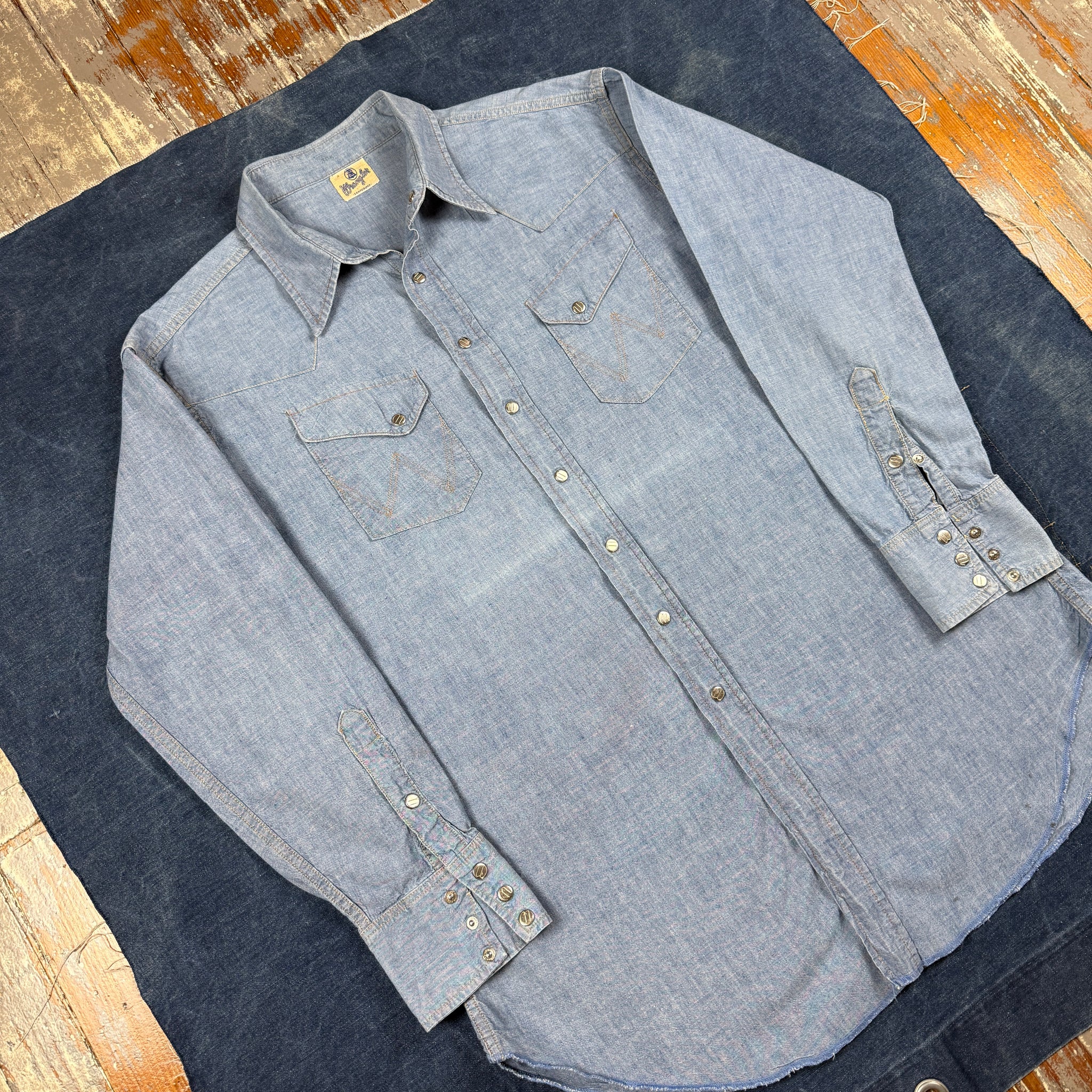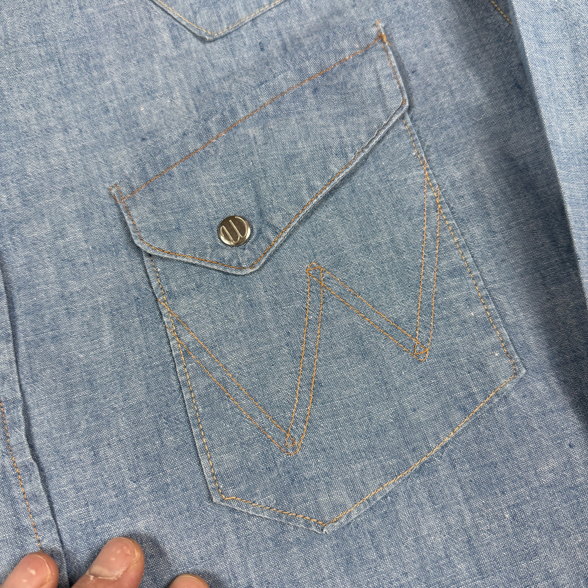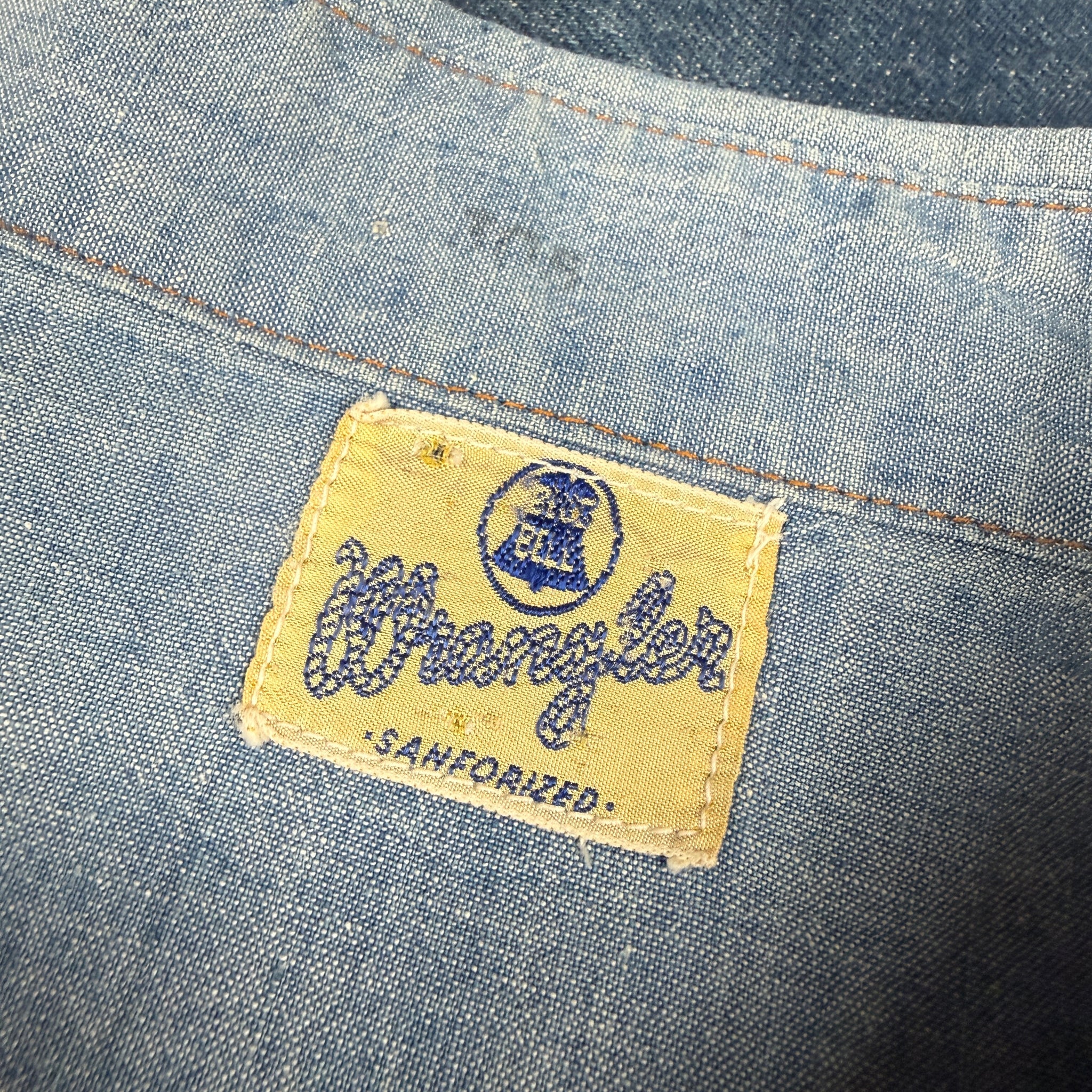 A beautiful example of a rare mid-1950s Wrangler 27MW chambray shirt. This style with asymmetric pockets has become something of an iconic design, but originals are very hard-to-find. With this tag and button style it dates to the mid-1950s. Siome super cool details like two tone stitching throughout!